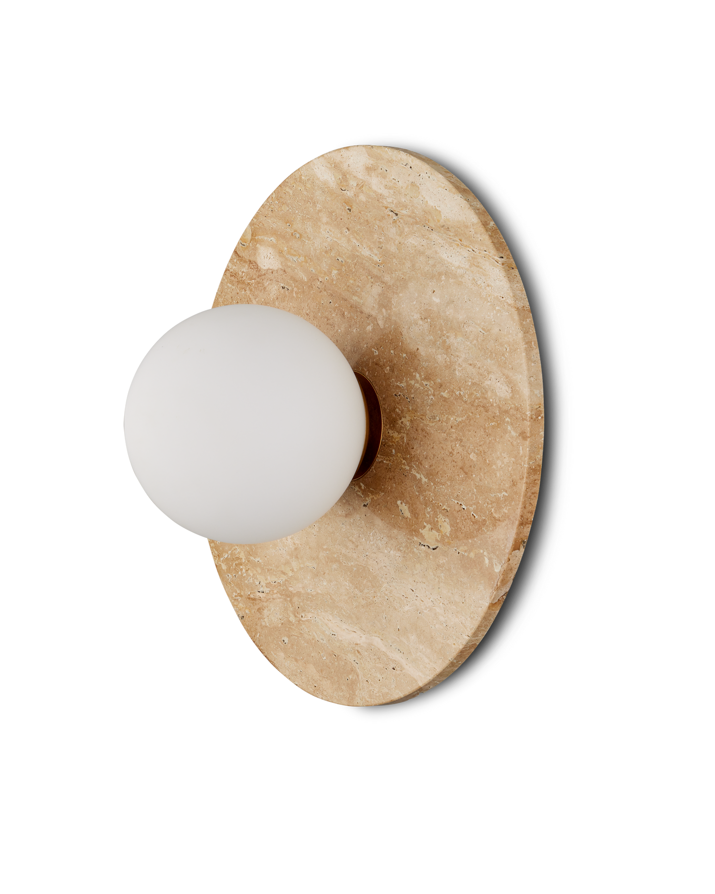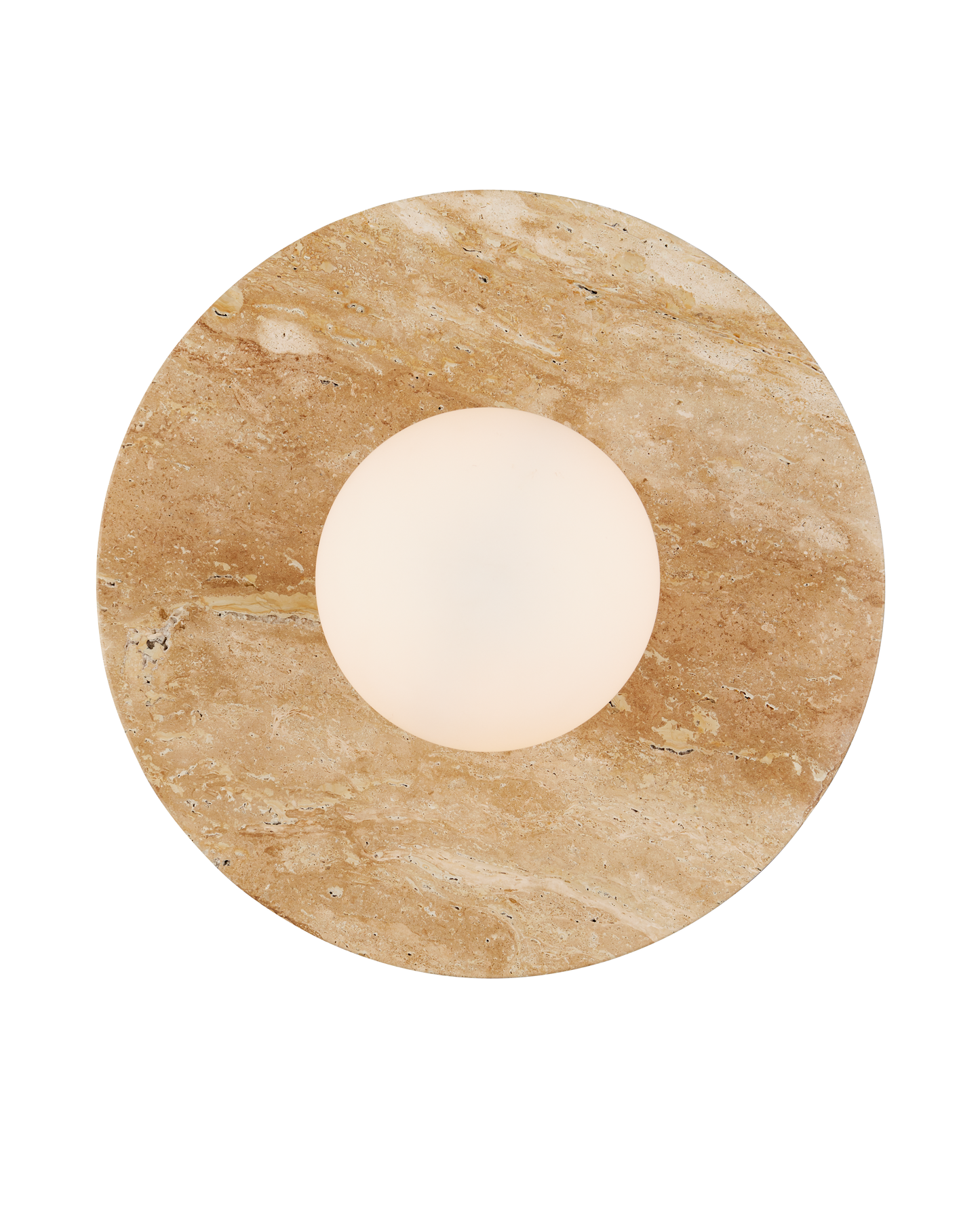 The Apricity Wall Sconce is simplicity personified. Its most dramatic feature is a travertine disc that surrounds the frosted white glass globe, bringing warmth to the glow that will reflect on the natural stone's surface. The metal hardware in an antique brass finish all but disappears on the round tan sconce. Because travertine is a natural material, the surface of the disc will vary slightly.