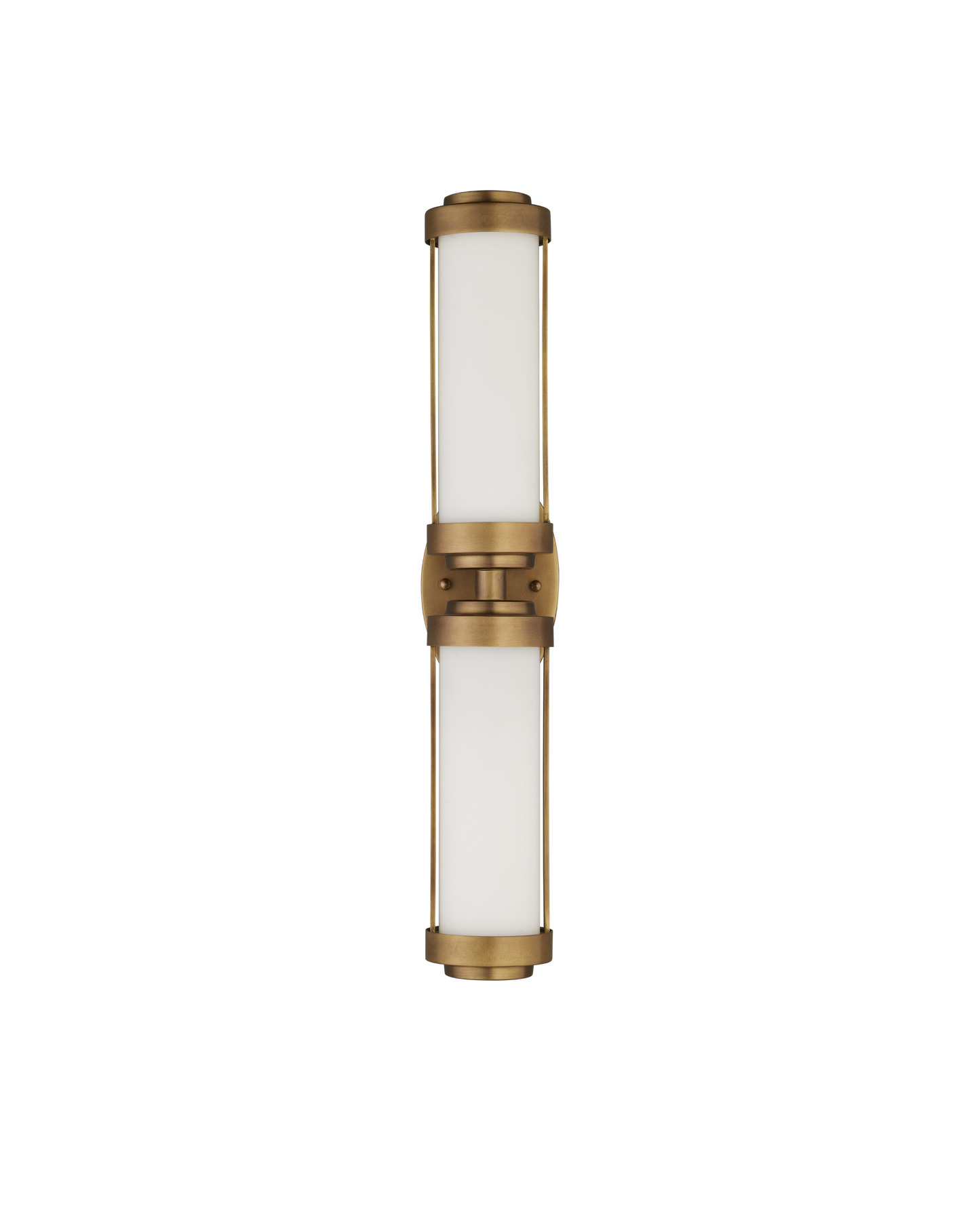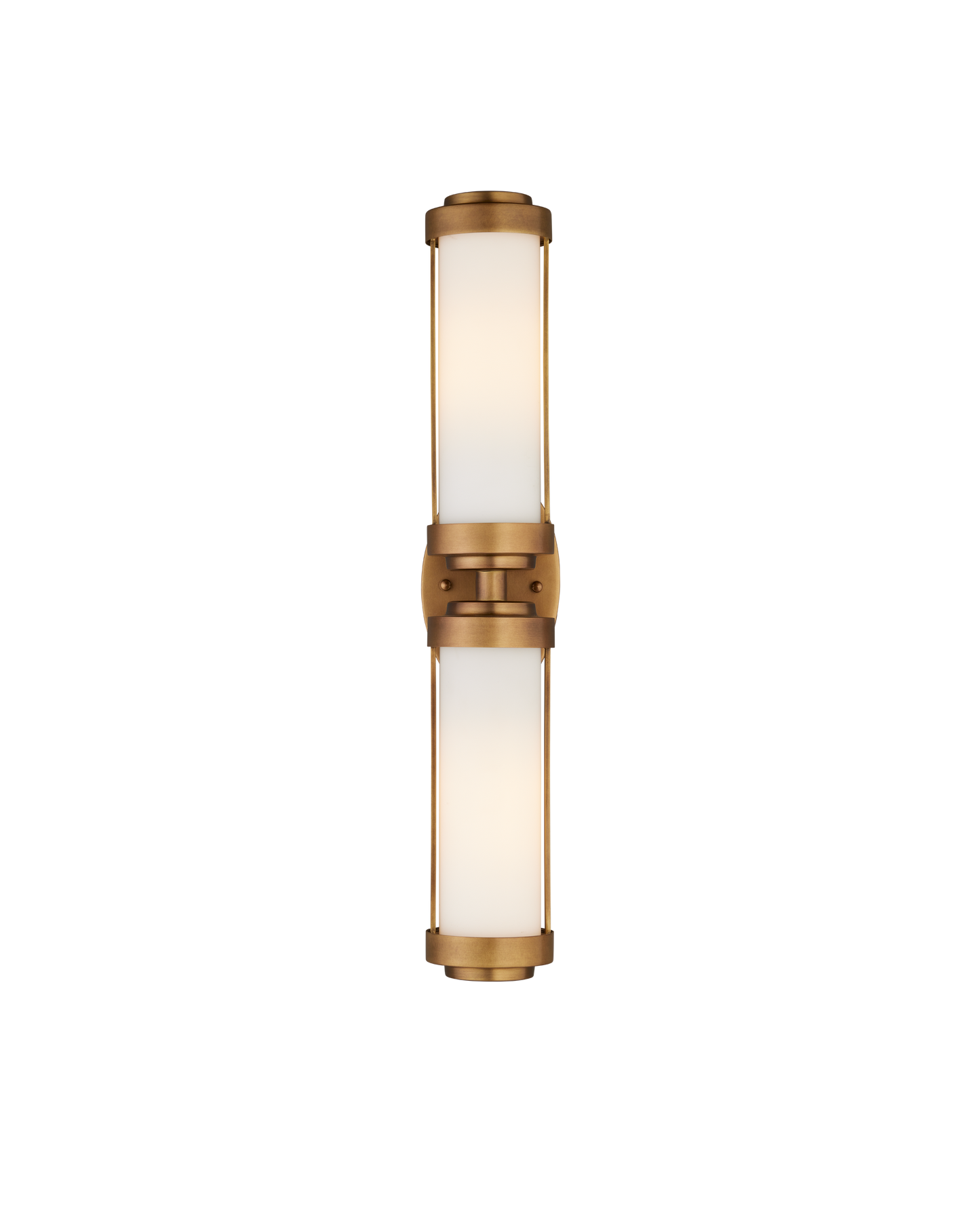 The Bowland Brass Bath Wall Sconce features a contemporized hourglass shape designed with a fresh, modern feel. Inspired by an antique fixture, the time-honored profile is updated with sleek caps surrounding the opaque glass tubes at the top and bottom. The articulate center transition between the two elements further enhances this modernization. The metal on this sconce is in an antique brass finish.