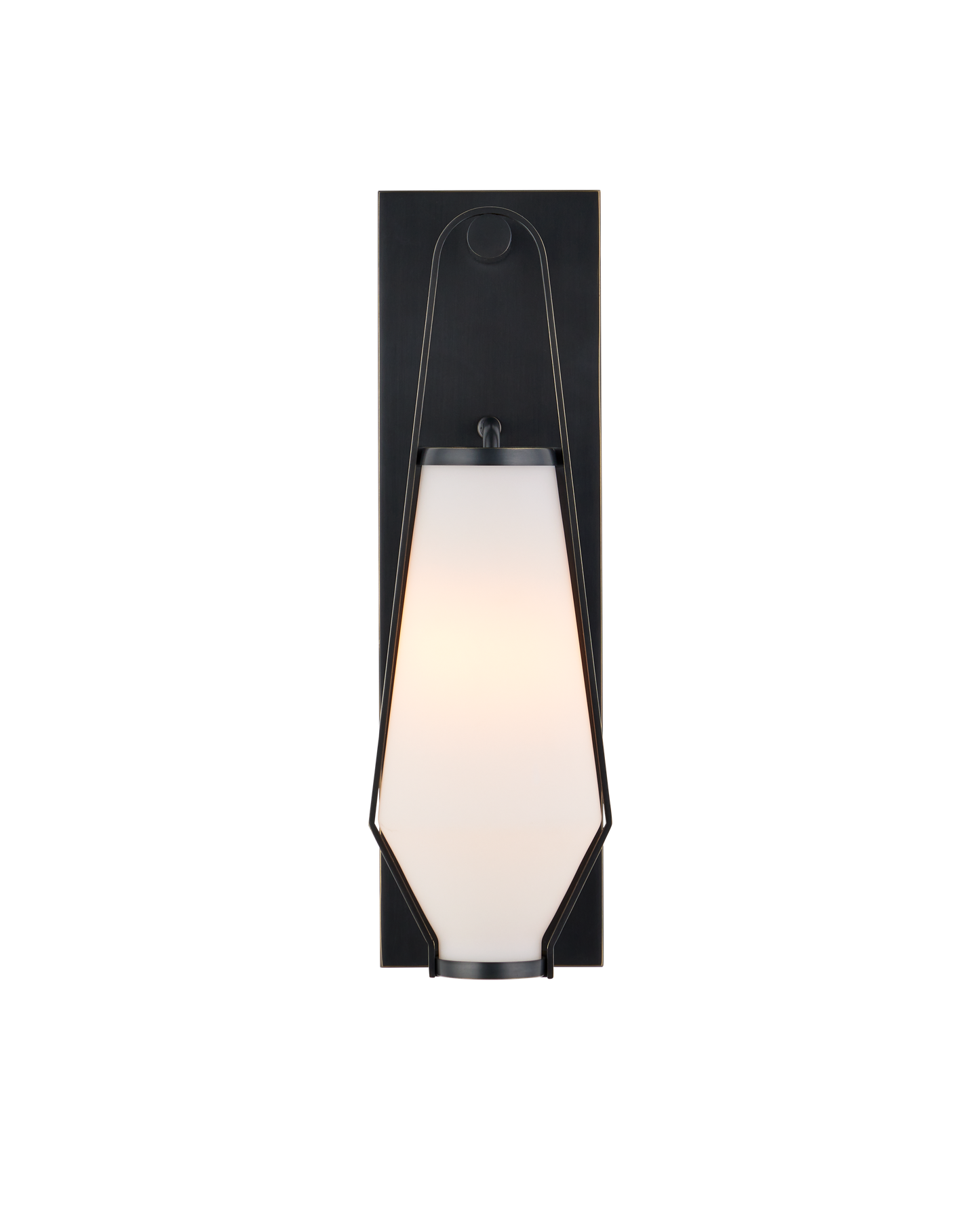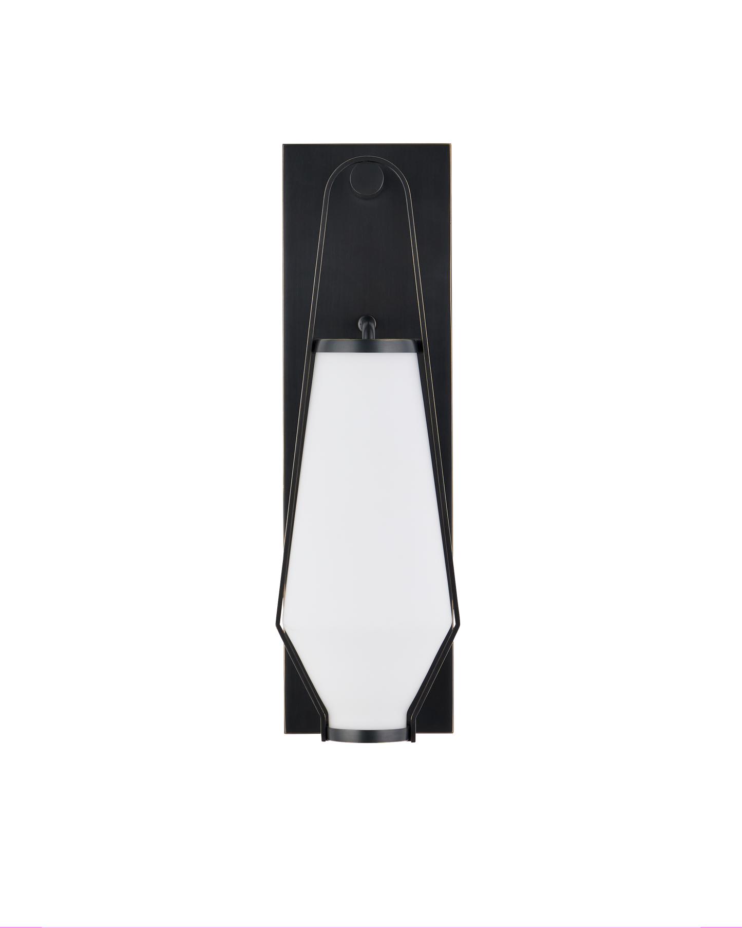 The Brompton Bronze Bath Wall Sconce dangles its shade like it is balancing a canister filled with illumination. Designed with a slim, rectangular wall-plate made of wrought iron in an oil-rubbed bronze finish, the knob from which the shade hangs and the handle that cradles it are also in metal in the same finish. The opacity of the beautifully shaped shade on the black wall sconce creates a luminous glow.