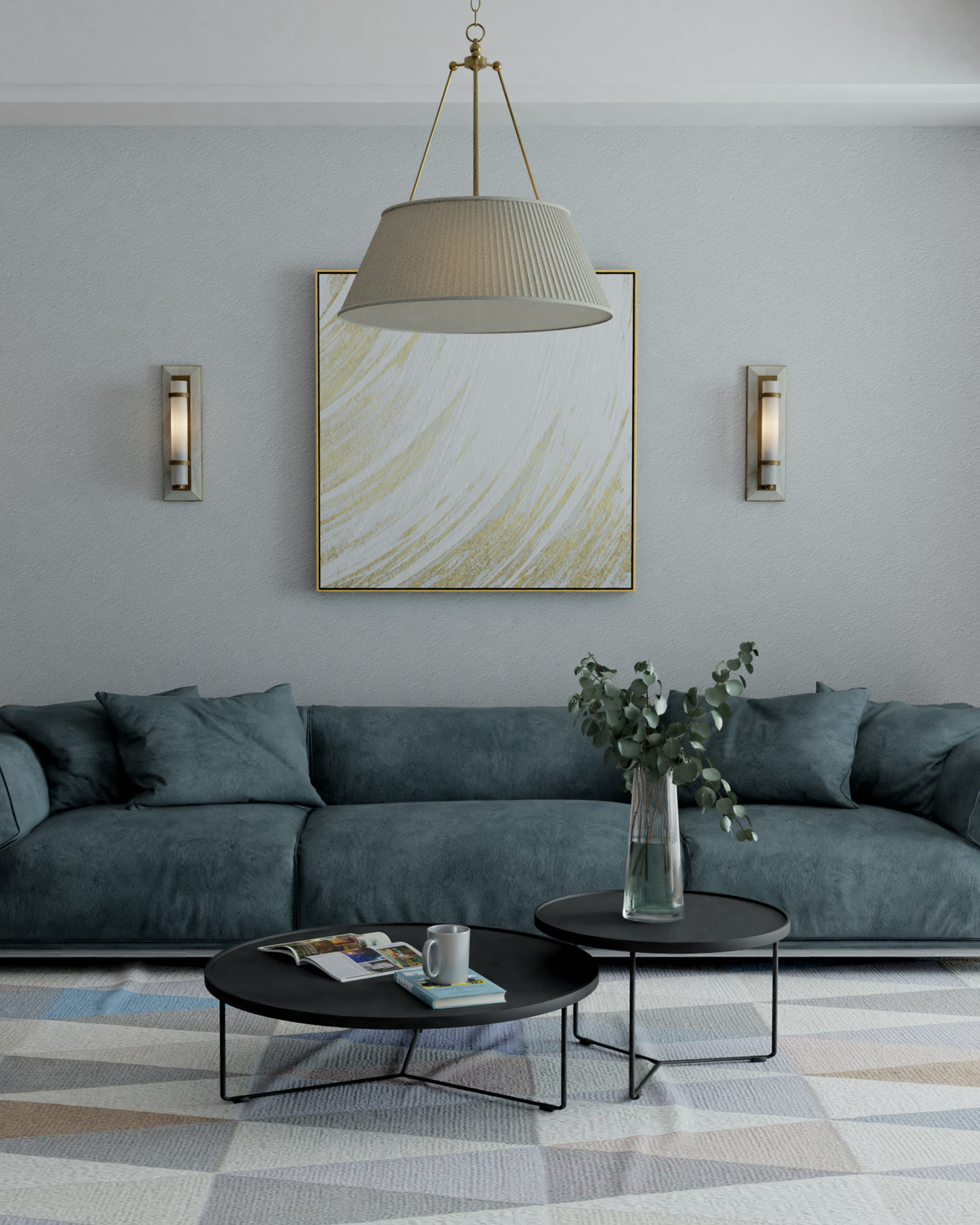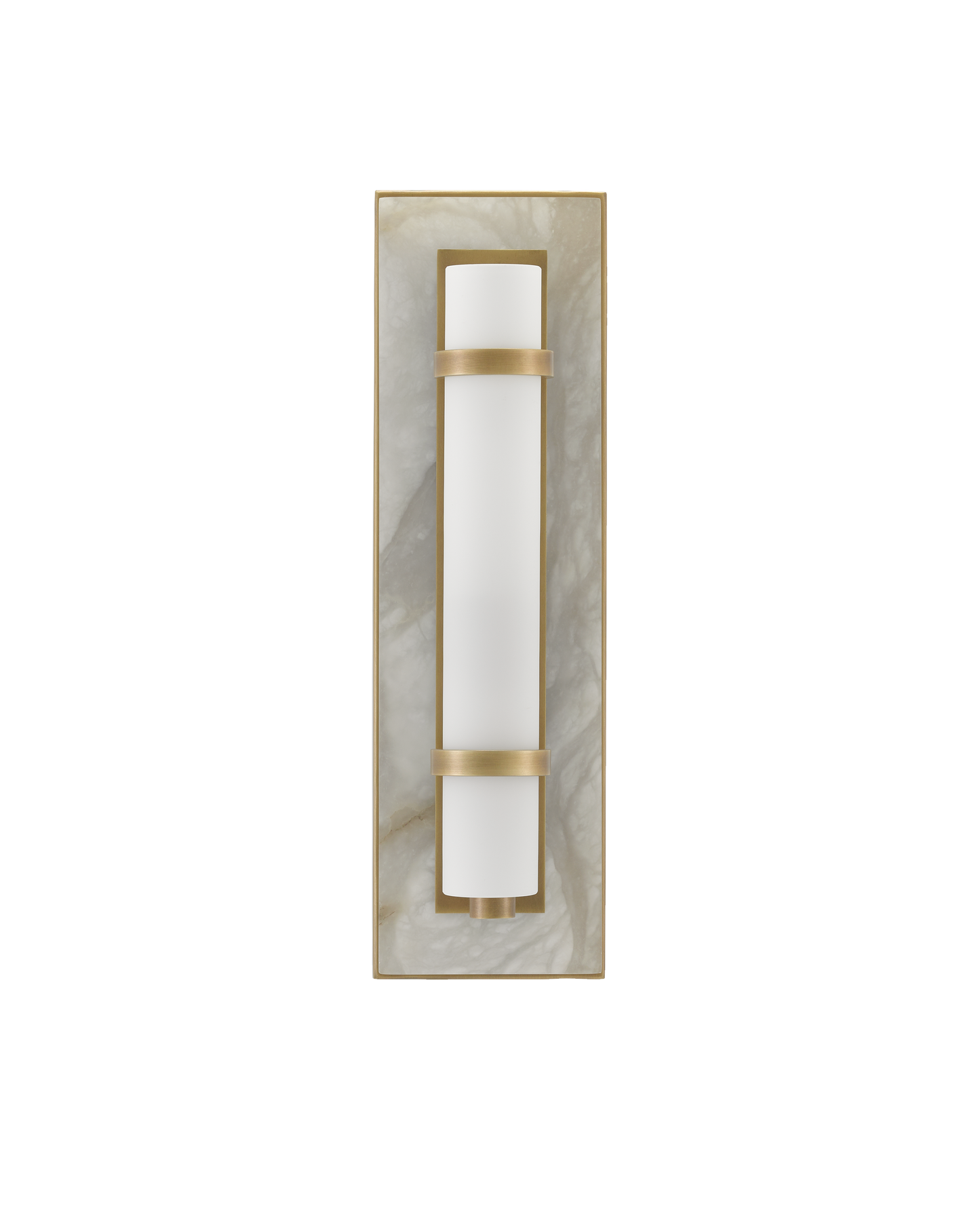 A masterful mix of materials describes the Bruneau Brass Wall Sconce. From the cloudy alabaster panel affixed to the wall plate, the metal in a warm antique brass finish, and the soft glow of the opaque glass shade, the layering of this design is sophisticated. The strap-like circlets that fasten the shade to the wall plate on this gold wall sconce is a design detail worth noting. Part of the Bruneau Collection of wall sconces designed for bathroom spaces.
