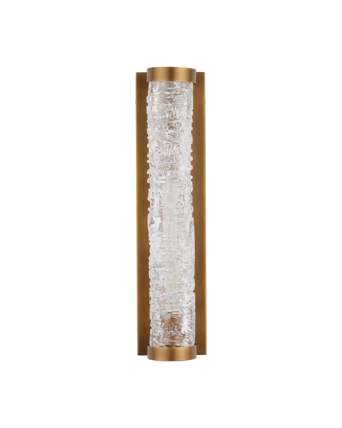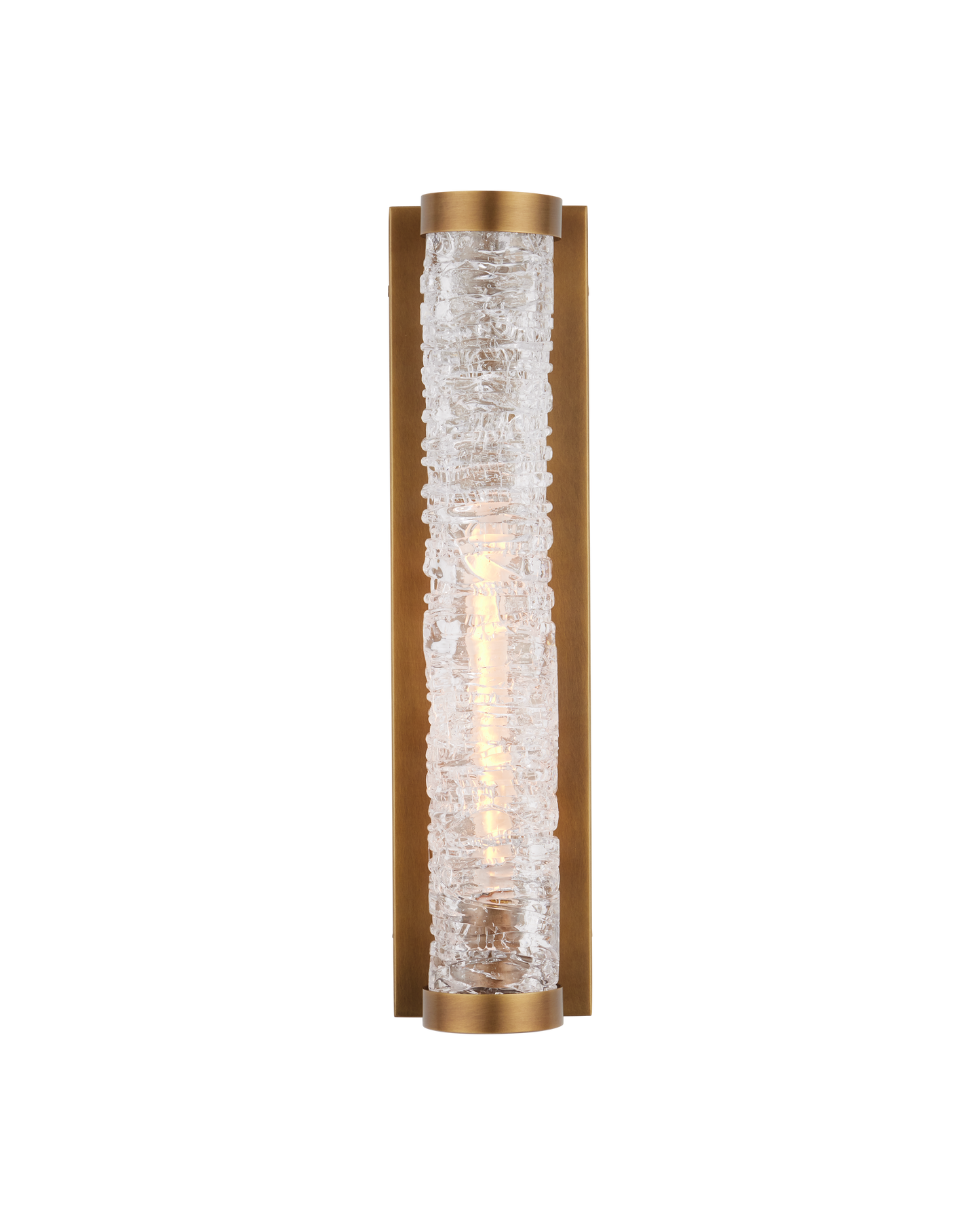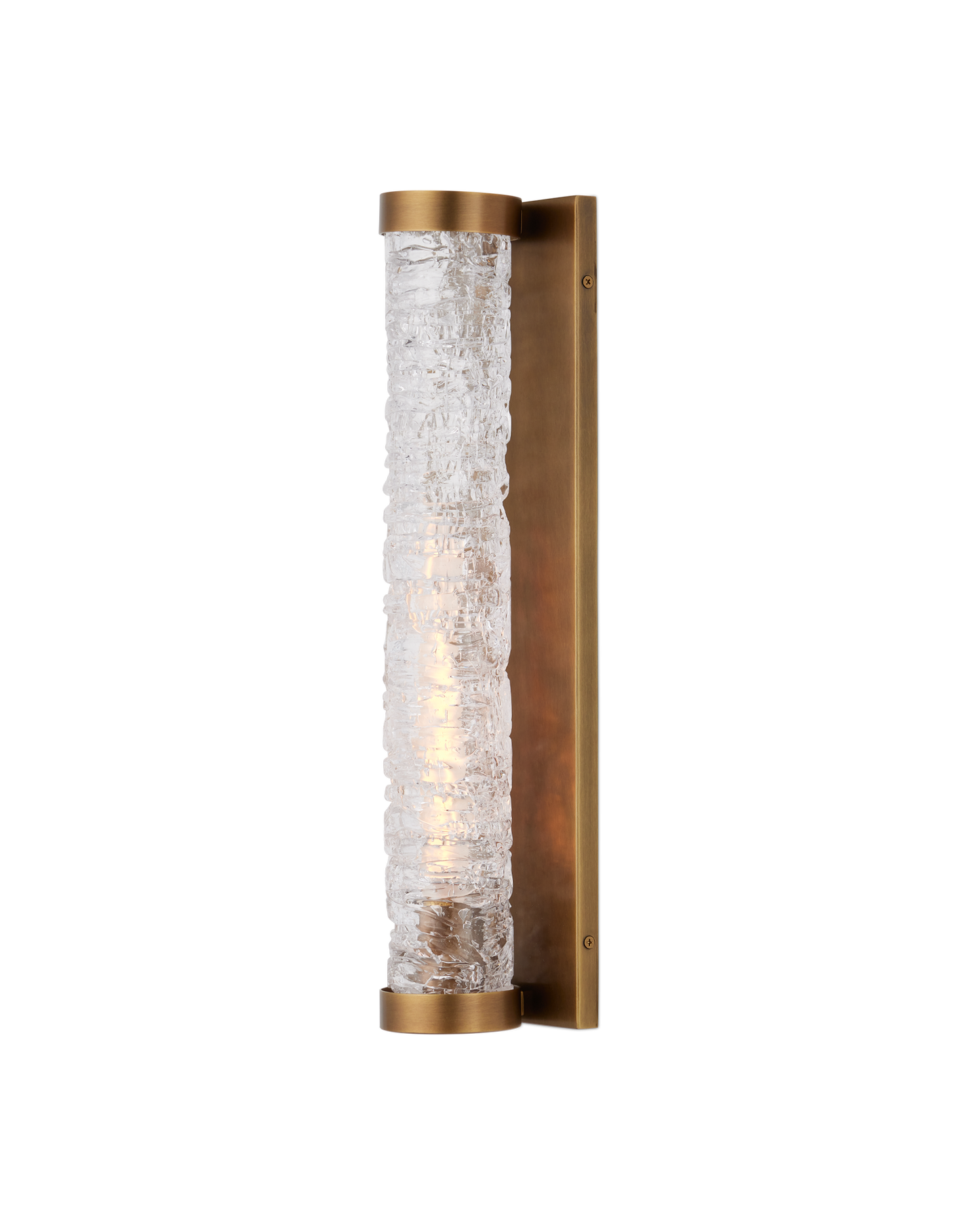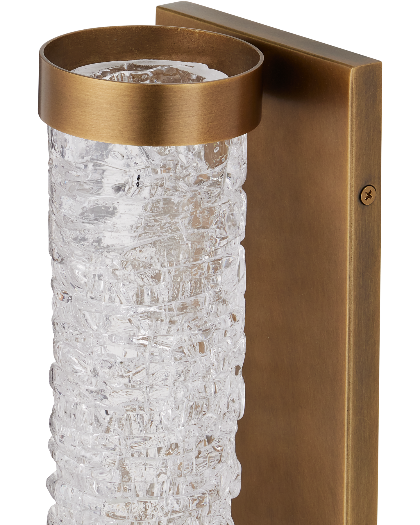 The Busby Brass Bath Wall Sconce has a metal frame in an antique brass finish fitted with a textural glass tube that is painstakingly created. To achieve the look of cracked frozen glass, molten glass is manipulated until it reaches the desired feel, which means the texture on each one of these gold sconces will be slightly different. The one-light sconce is dimmable and damp rated for bathrooms.