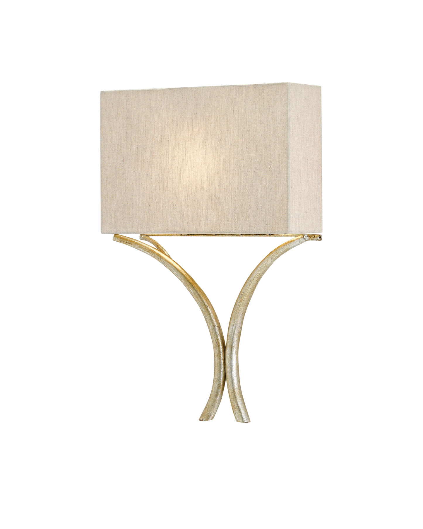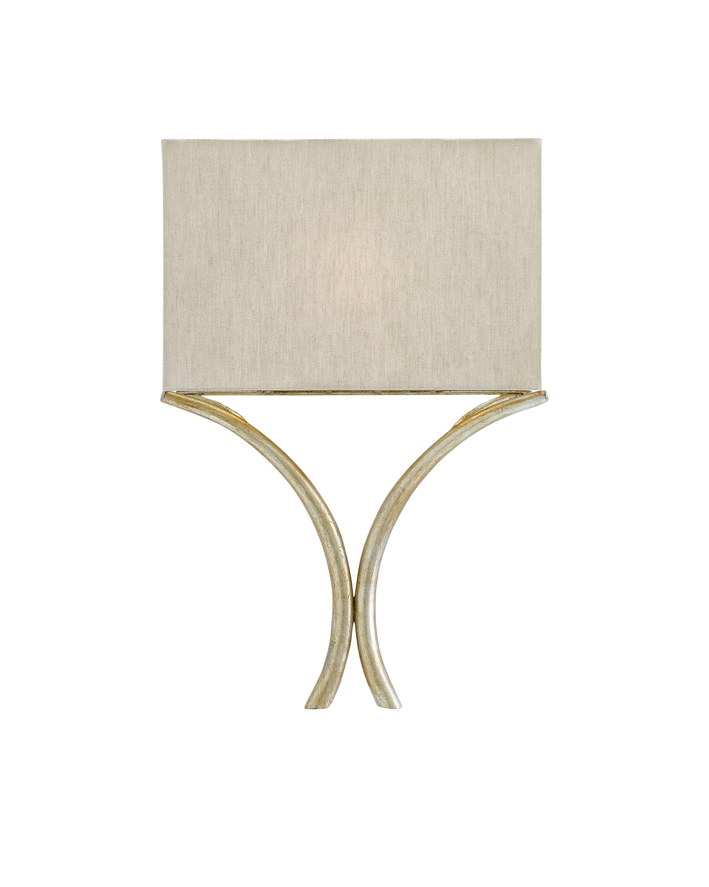 The wrought iron stems holding the natural linen shade of the Cornwall Silver Wall Sconce are fashioned in a wishbone shape. The rectangular shape of the shade and the silver leaf finish on the arching lines that balance it make this sconce a stylish one. The Cornwall meets ADA requirements.