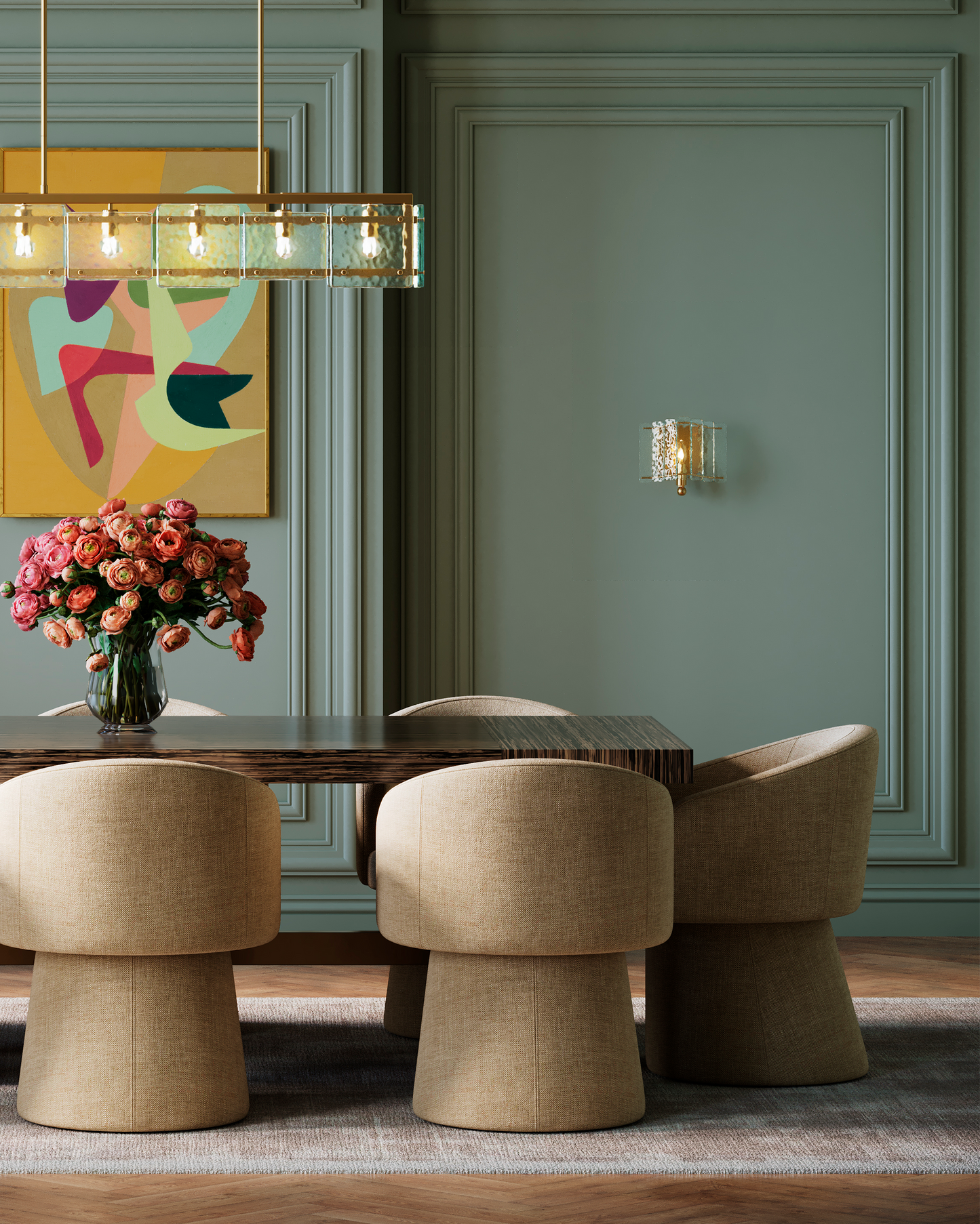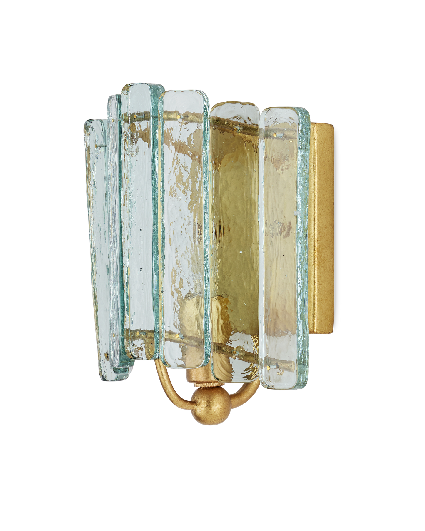 With thick panes of recycled glass flowing along its exterior, the Duvernell Wall Sconce feels like symmetry in motion. The wrought iron structure that supports the textured glass is made of wrought iron in a contemporary gold leaf finish, which adds to the gleam from this gold sconce.