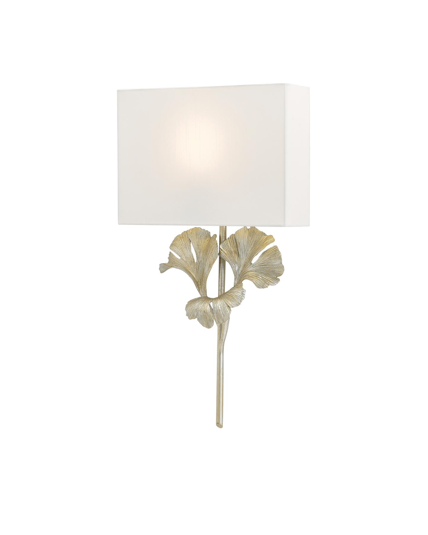 The Gingko Silver Wall Sconce is a botanical-inspired fixture with a distressed silver leaf finish on its wrought iron frame. The leaves that fan out from a central stem are in perfect scale to the off-white shantung shade. The fixture meets ADA requirements.