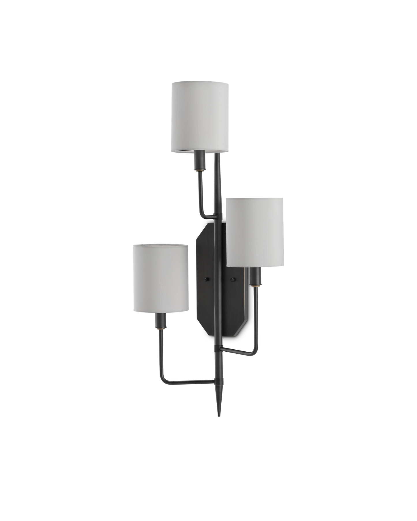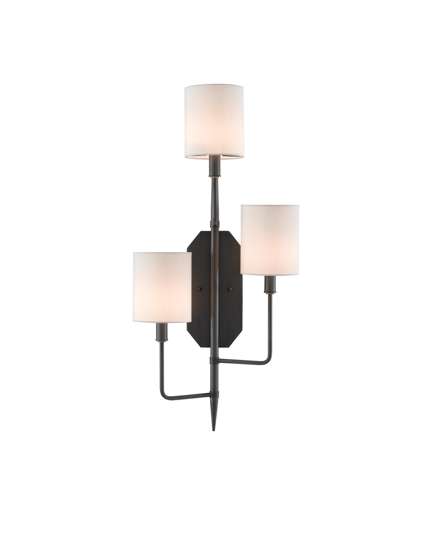 The Knowsley Right Wall Sconce has a thin armature in an oil-rubbed bronze finish that holds three tailored off-white shantung shades. The thinness of the arms and stem make this sconce a light design until the dark finish was added to give the bronze sconce heft.
