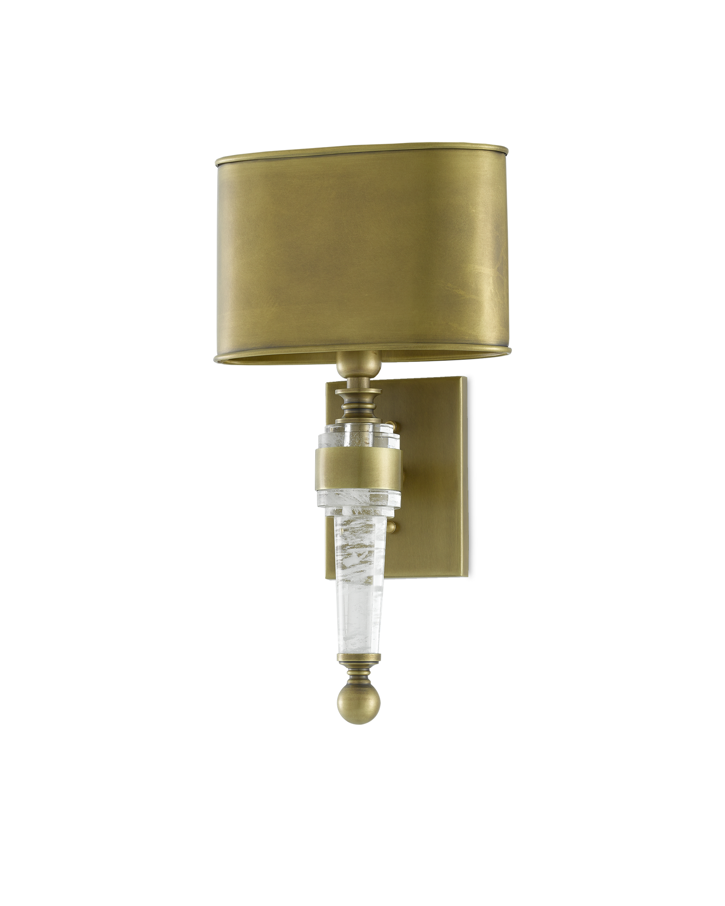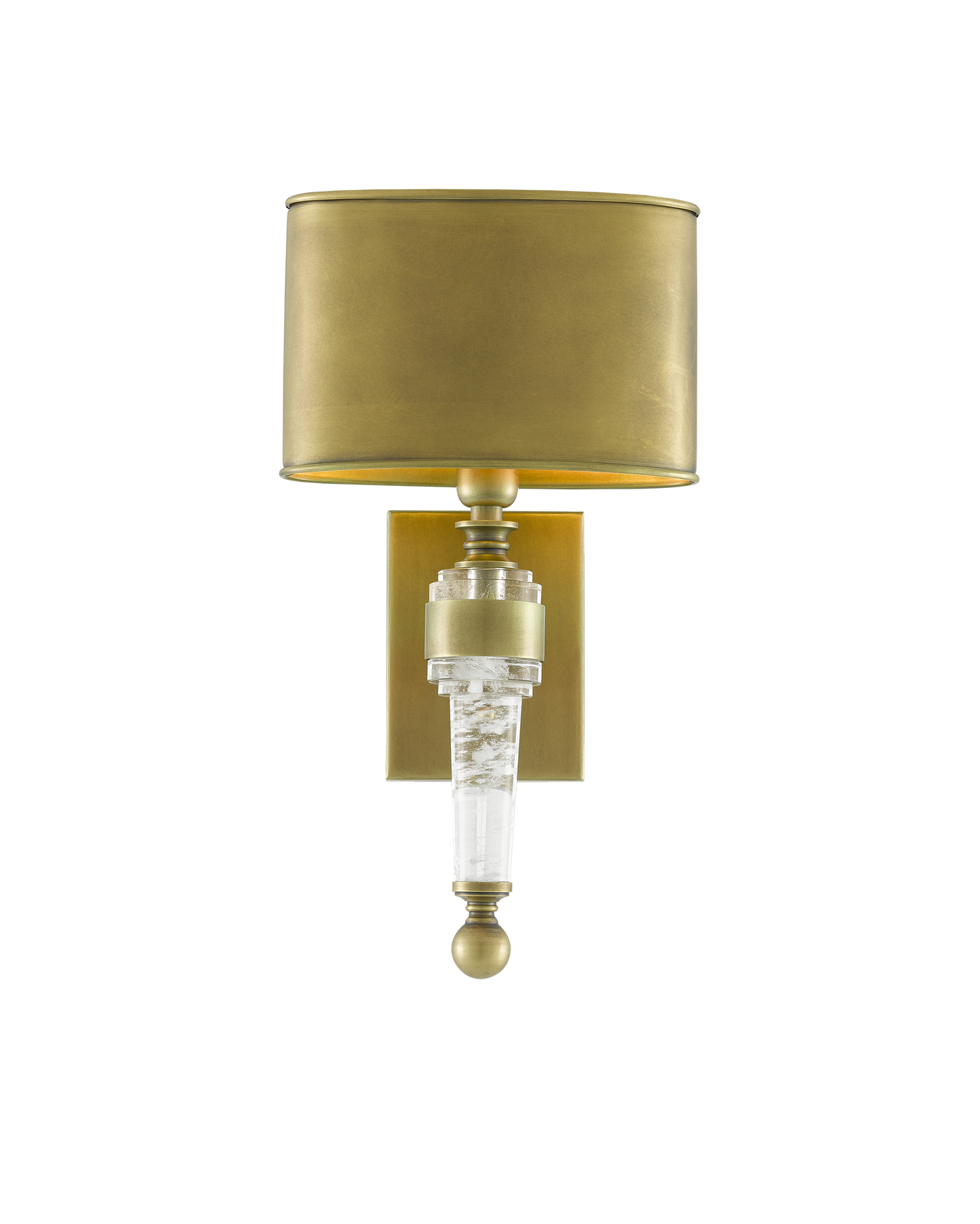 The Lindau Wall Sconce has its roots in the past and in the present, the time-honored design of the brass wall sconce made modern with the use of a faux rock crystal that has filmy white clouds floating within it. This masculine sconce is inspired by libraries and game rooms of the past. The Lindau, with its antique brass finish, is certified for damp locations.