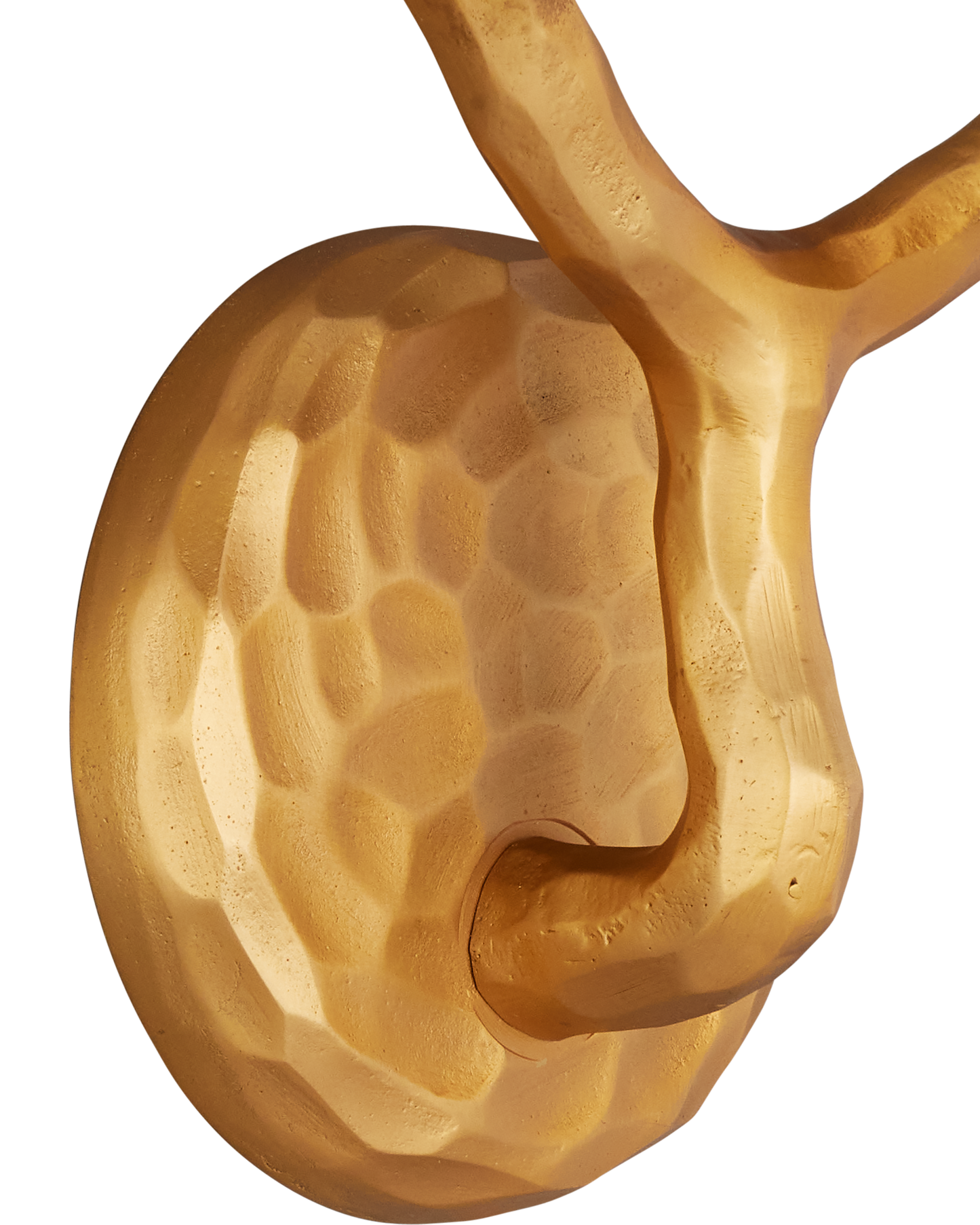 The Mathilda Wall Sconce, Left, has a wallplate and arms made of cast brass in a matt gold finish with markings on their surfaces that look as if they have has been smoothed in place with a palette knife. This brings the sconce a brutalist feel and adds extra texture to the design. The shades on the two-light sconce, made of milky white glass, slide into pronounced prongs that make the sconce look jewelry like. esigned by Marjorie Skouras, with a profile inspired by an antique, the gold sconce is dimmable.
