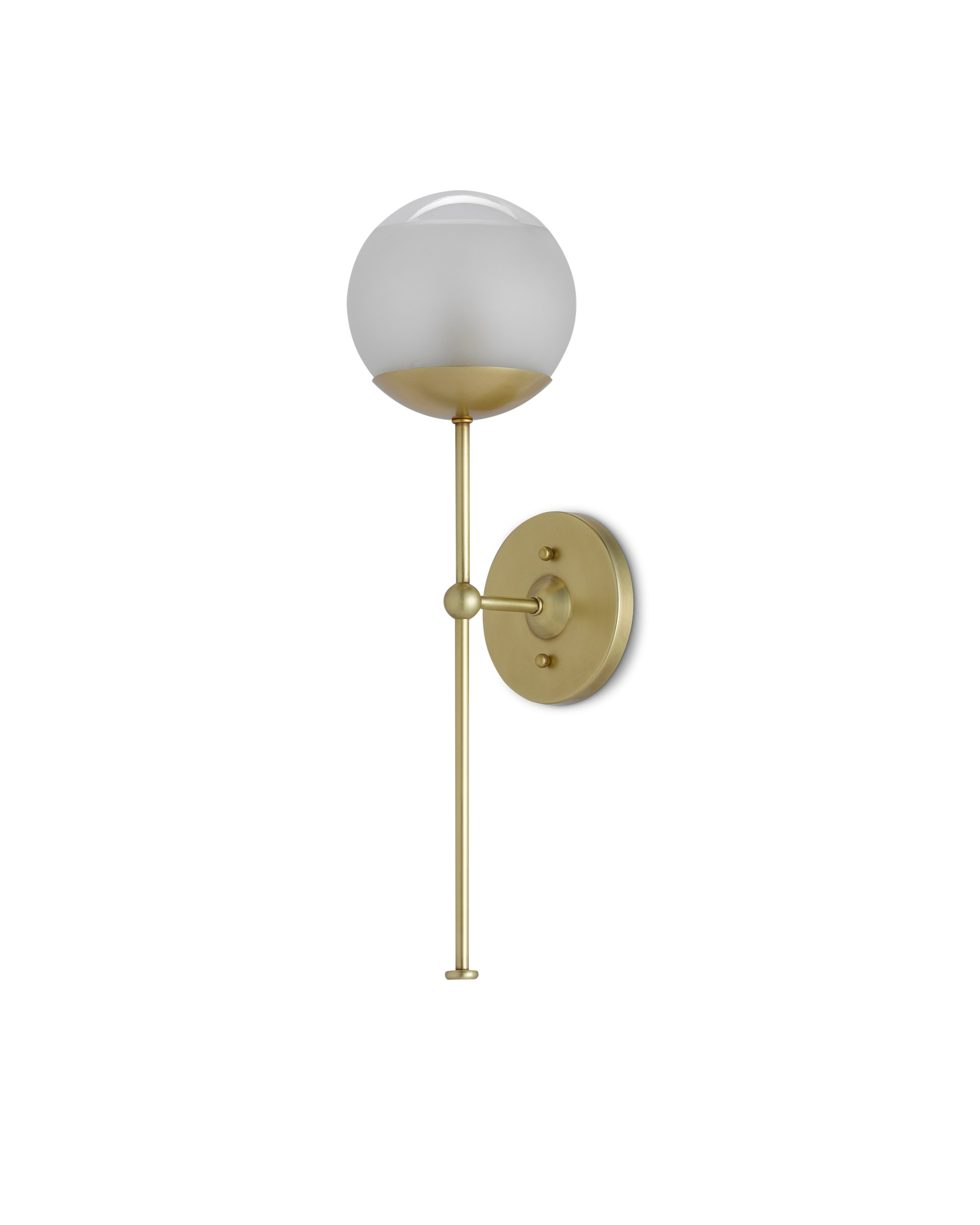 A distinctive feature of the Montview Wall Sconce is its long stem that holds the frosted glass globe in place. Made of metal in a brushed brass finish, this gold sconce evokes the image of a planet in the solar system. The Montview is certified for damp locations.