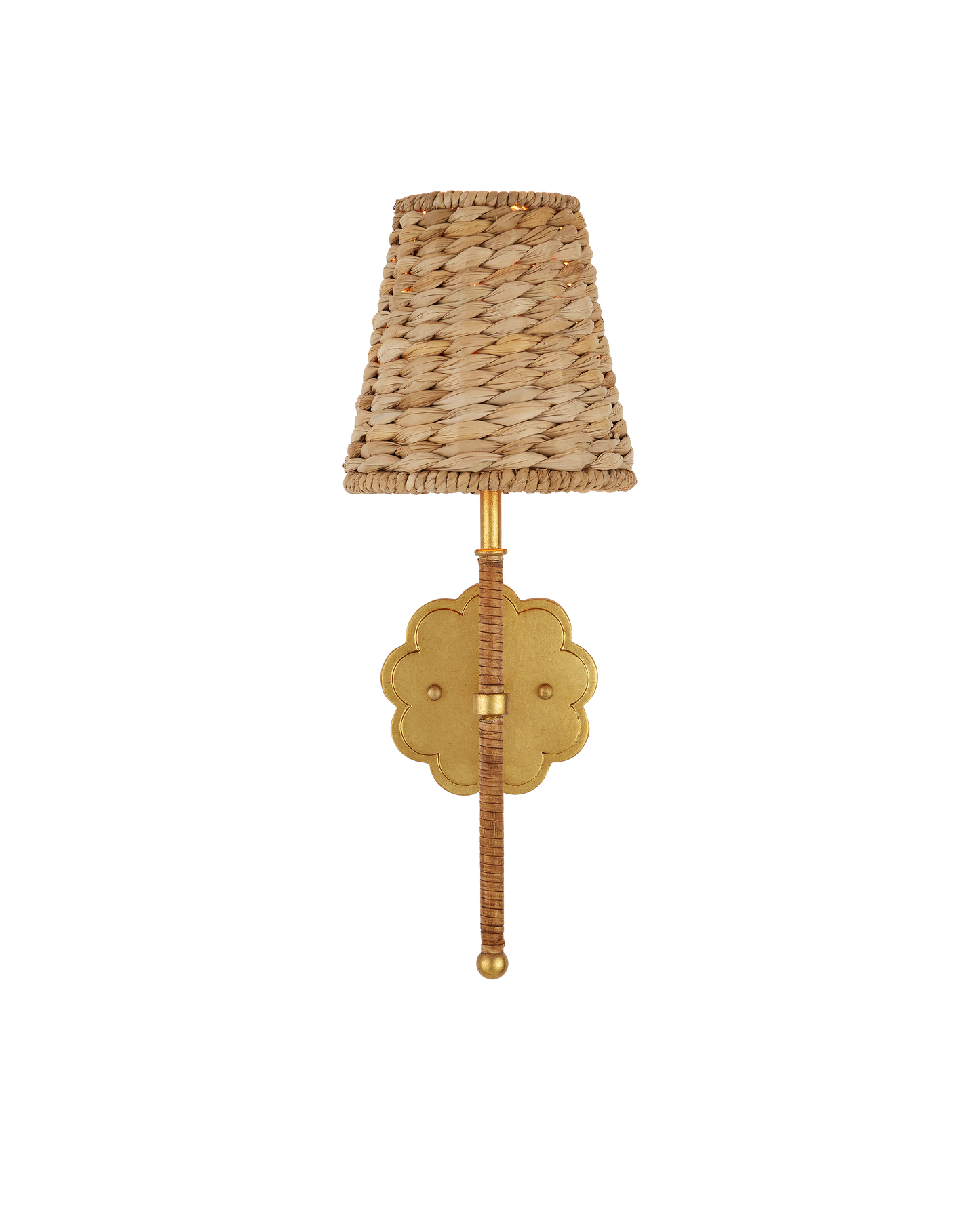 The Savoie Wall Sconce by Suzanne Duin has the French charm for which her designs are known. Made of water hyacinth, the shade is removable. The pretty floral-shaped backplate in a contemporary gold leaf finish matches the parts of the stem that are not covered in rattan. This lovely rope-wrapped sconce will grace its place on the wall with warmth and will introduce the allure for which the South of France is renowned.