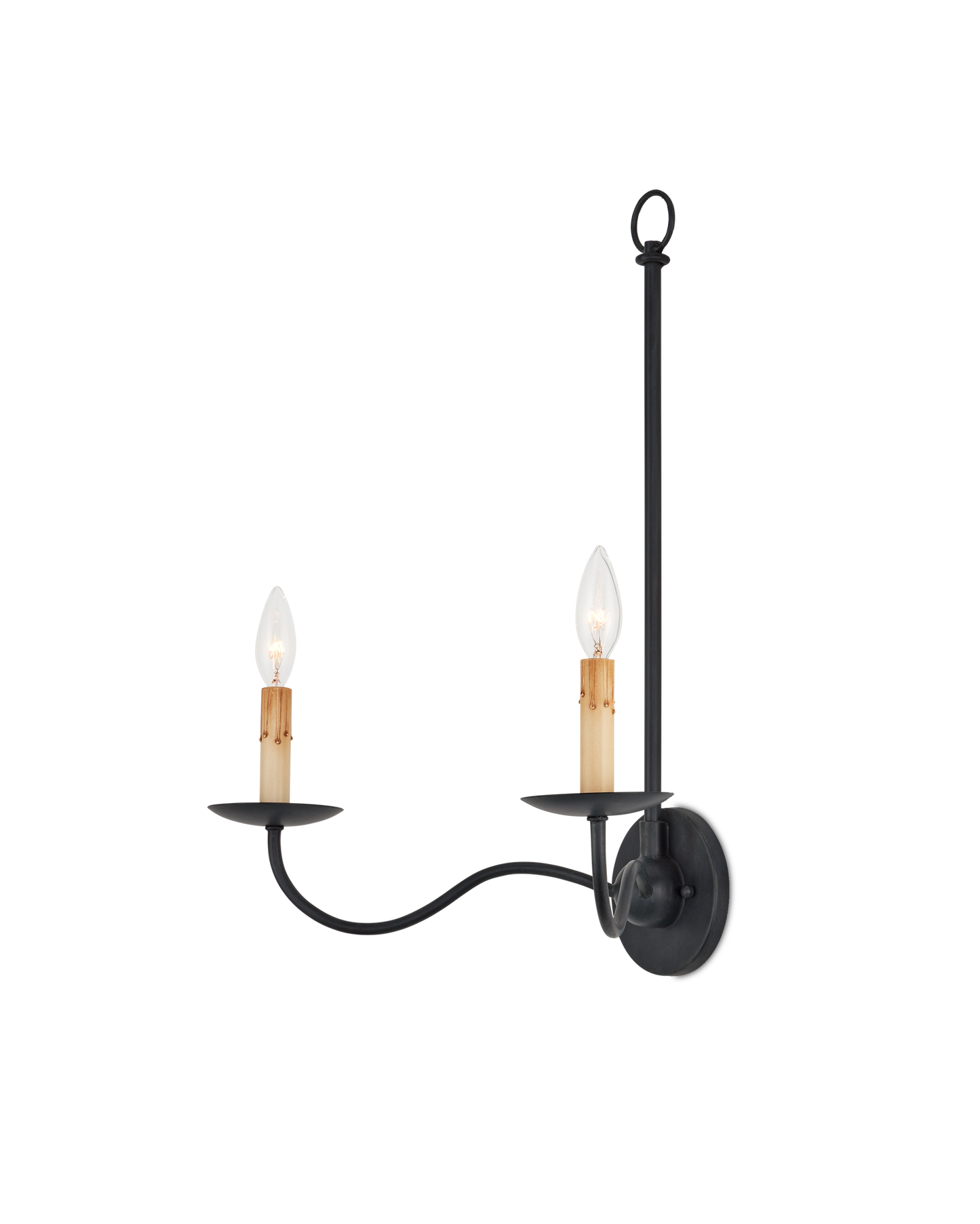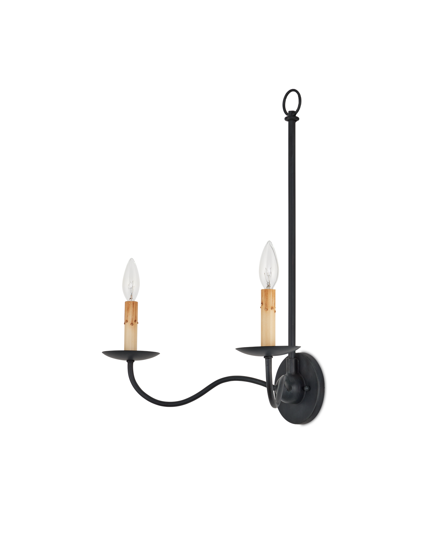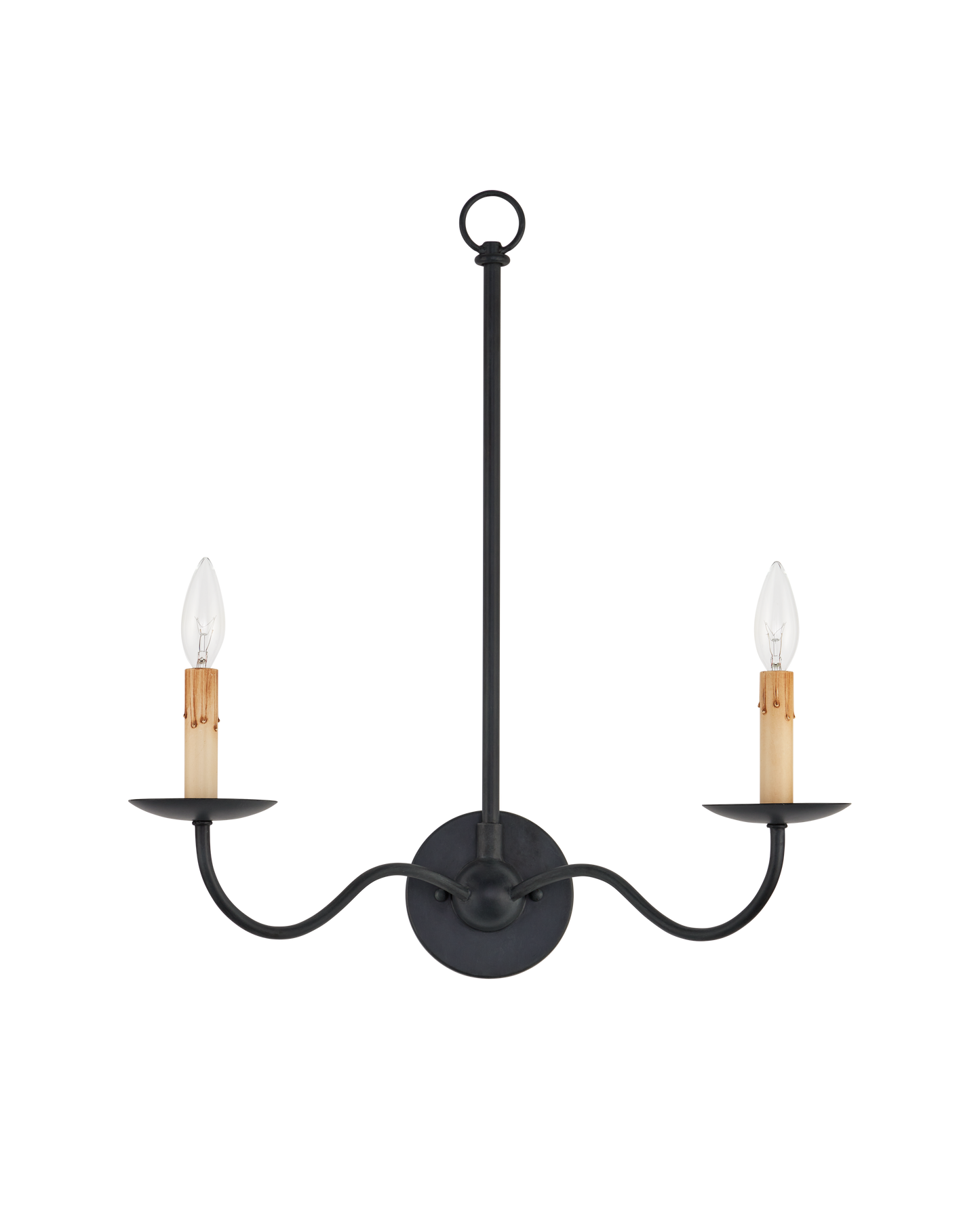 The Saxon Double-Light Black Wall Sconce harkens back to the early days of design in America with its nostalgic references. The Zanzibar black finish, its slender lines, and its candle-sleeves with their faux drips make this black sconce a terrific choice for modern farmhouse interiors, and its shape is perfect for even somewhat narrow walls where slenderness is a must.