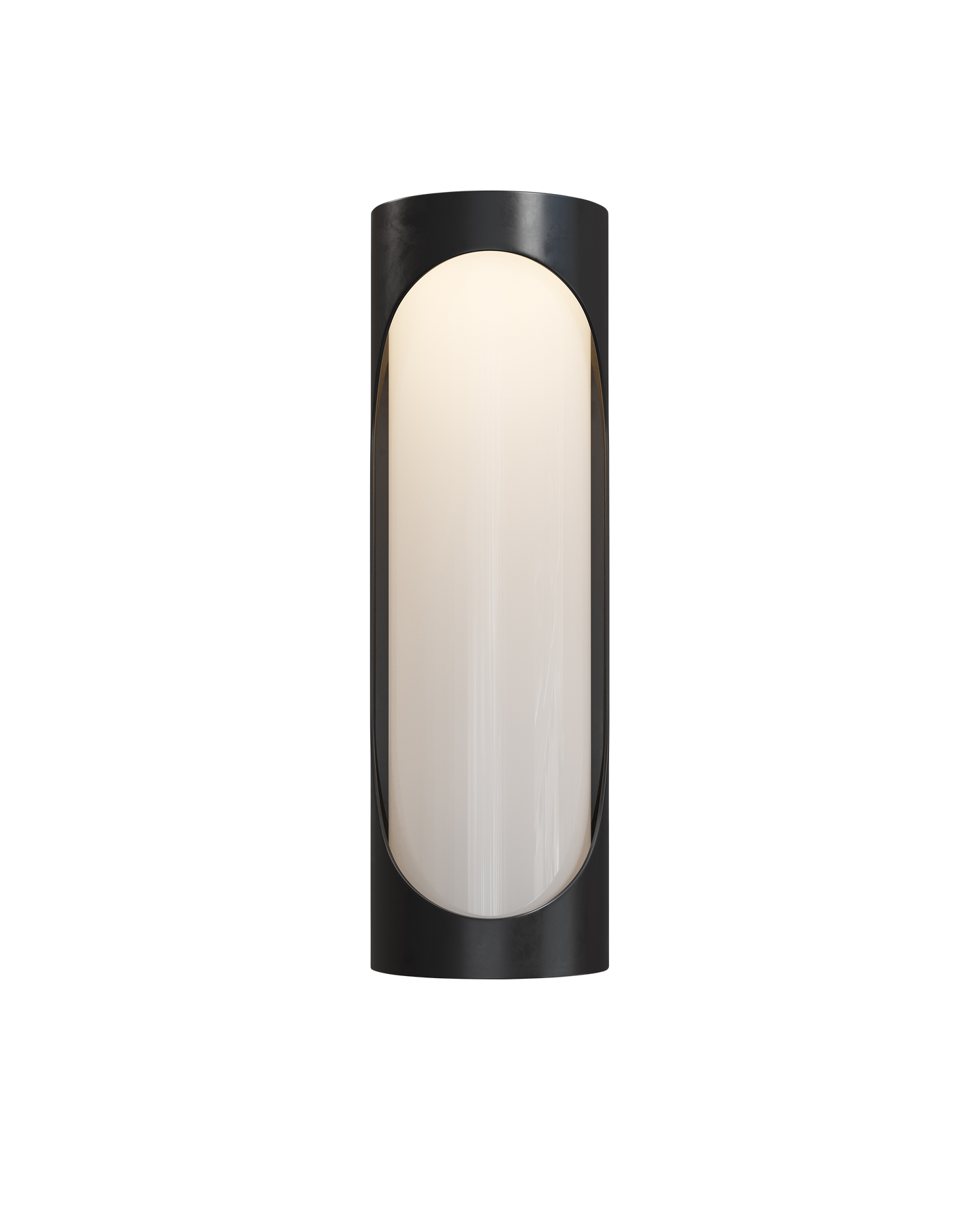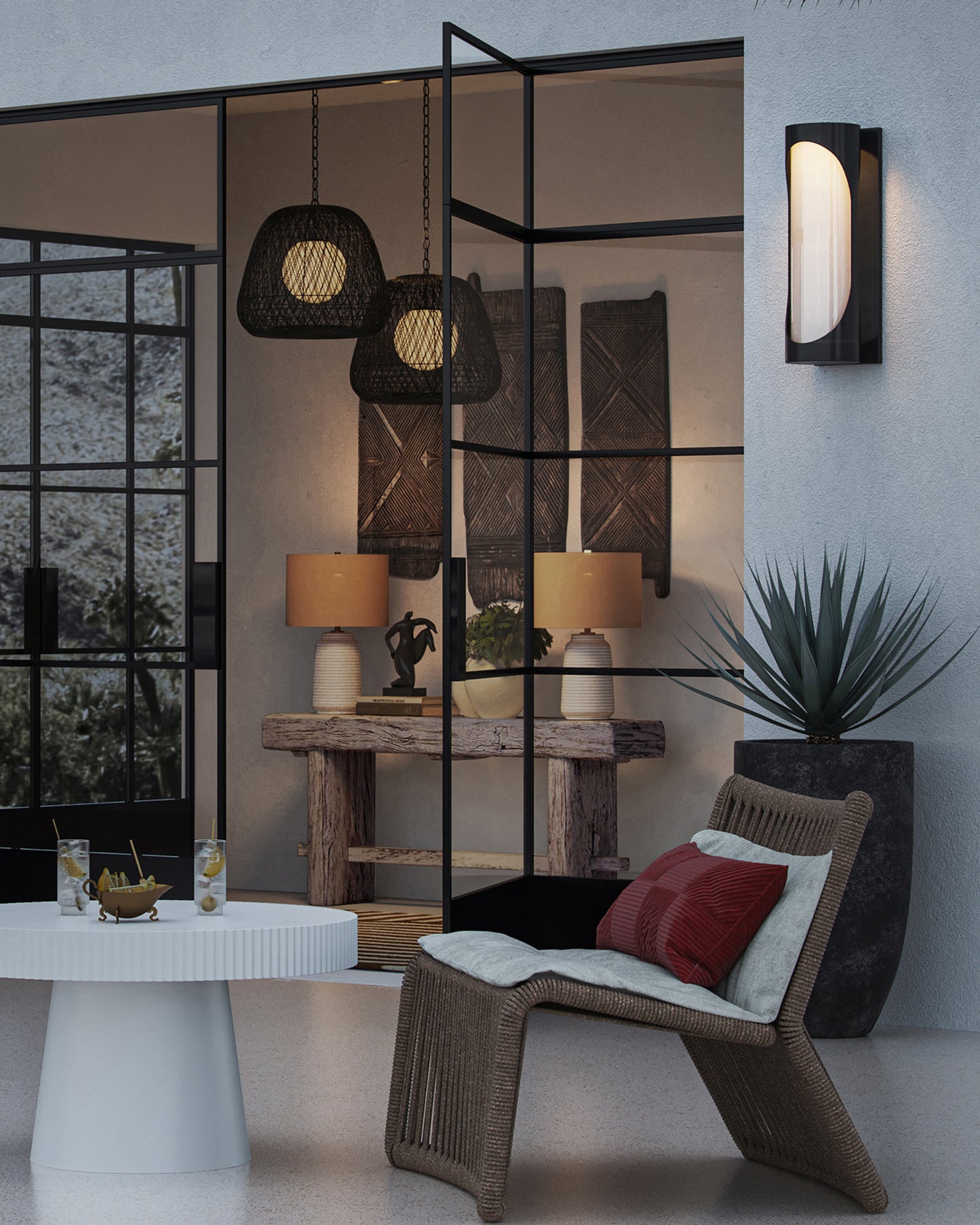The Swale Large Outdoor Wall Sconce has a graphic silhouette with cut outs where illumination can escape. The front of the black sconce is covered with a milky white glass that illuminates uniformly when the integrated LEDs shine through it. The metal is powdercoated to make this outdoor sconce weather worthy.