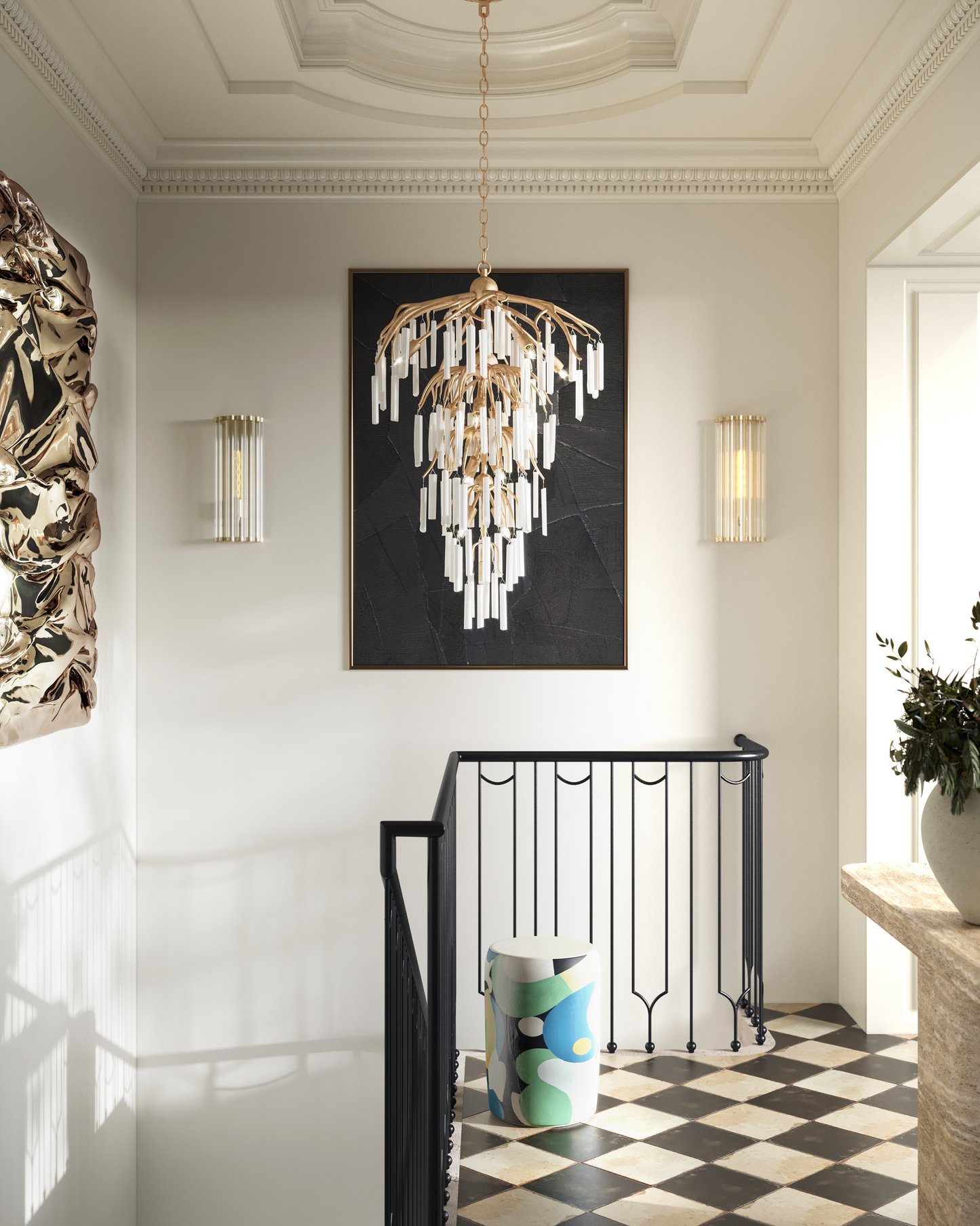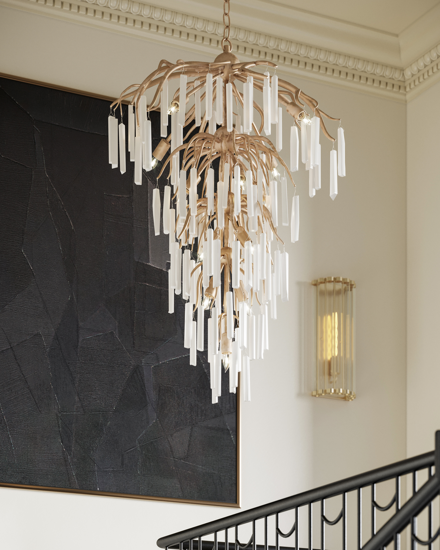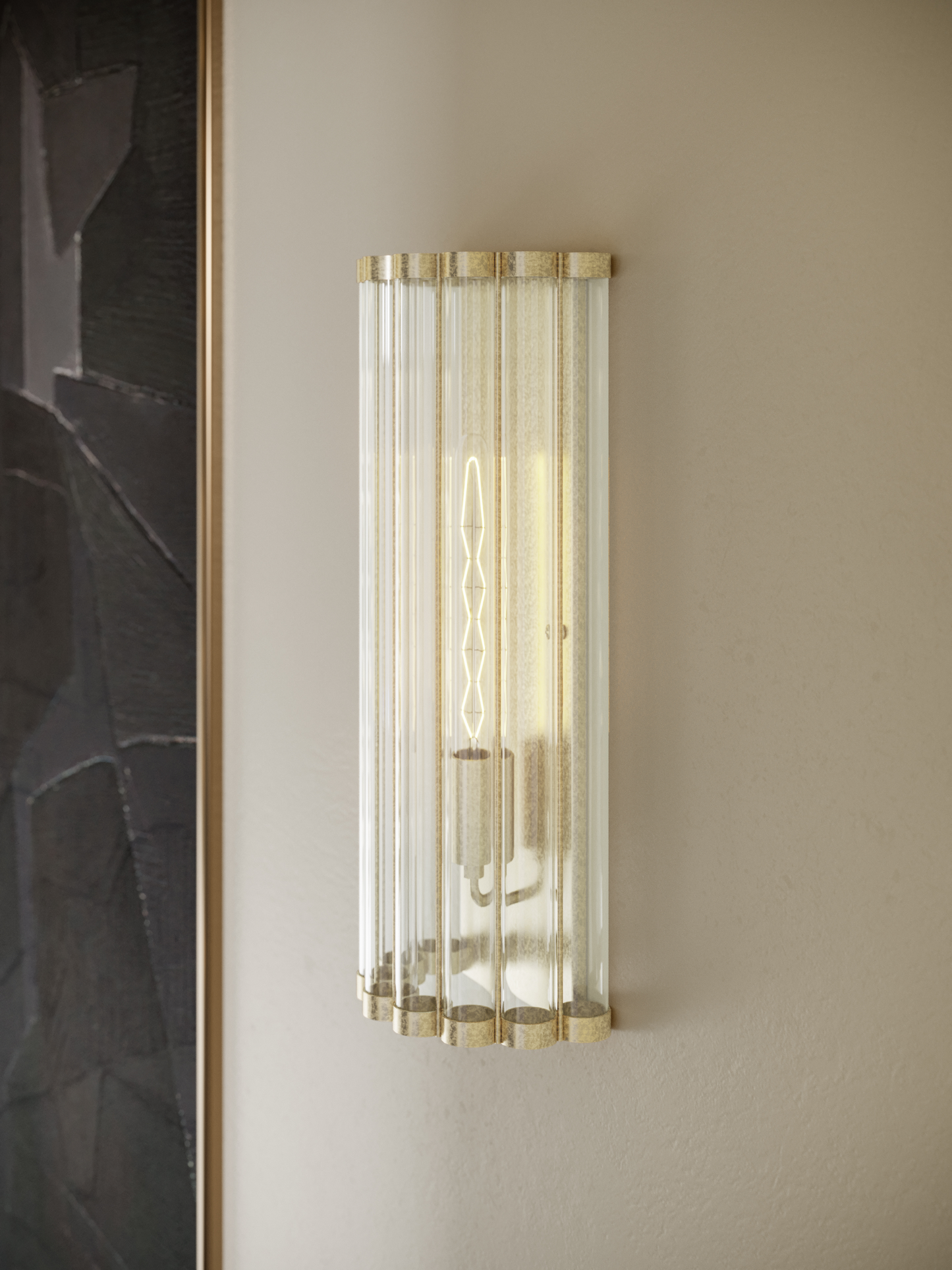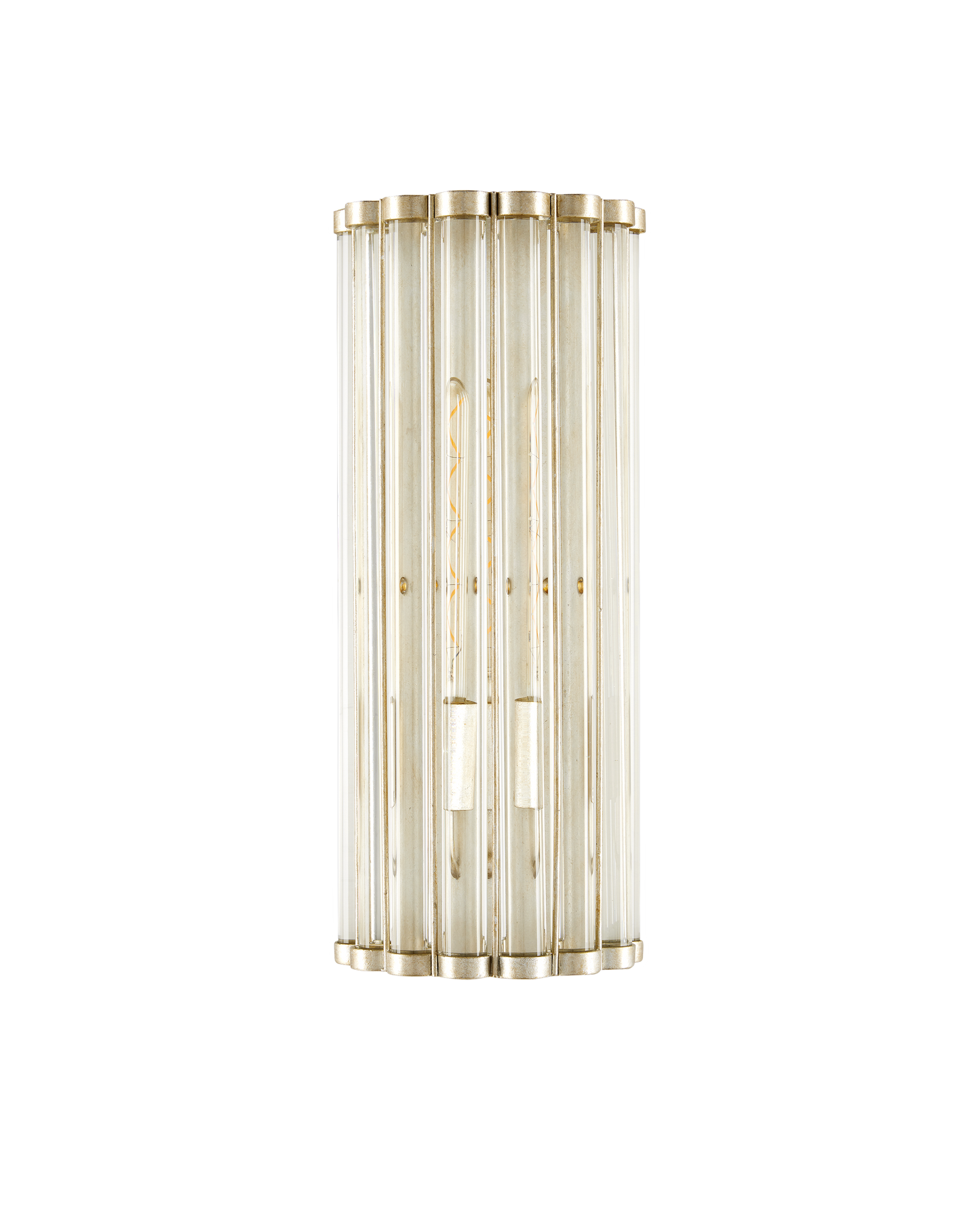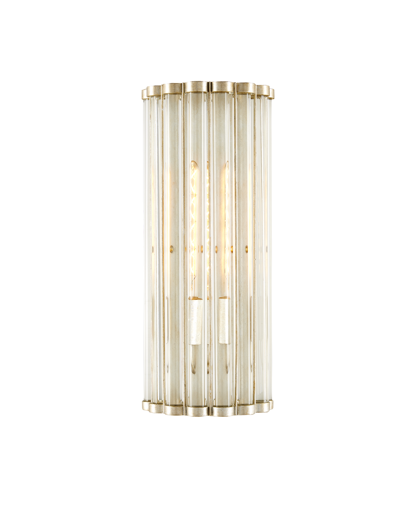 Bunny Williams has achieved a timeless profile with the Warwick Tall Wall Sconce that diffuses light through high-grade optic crystal tubes. Ribbons of wrought iron in a contemporary silver leaf finish hold the cylinders of illumination in place so that the curved form is barely discernable from the front. This clear glass wall sconce is ADA compliant.