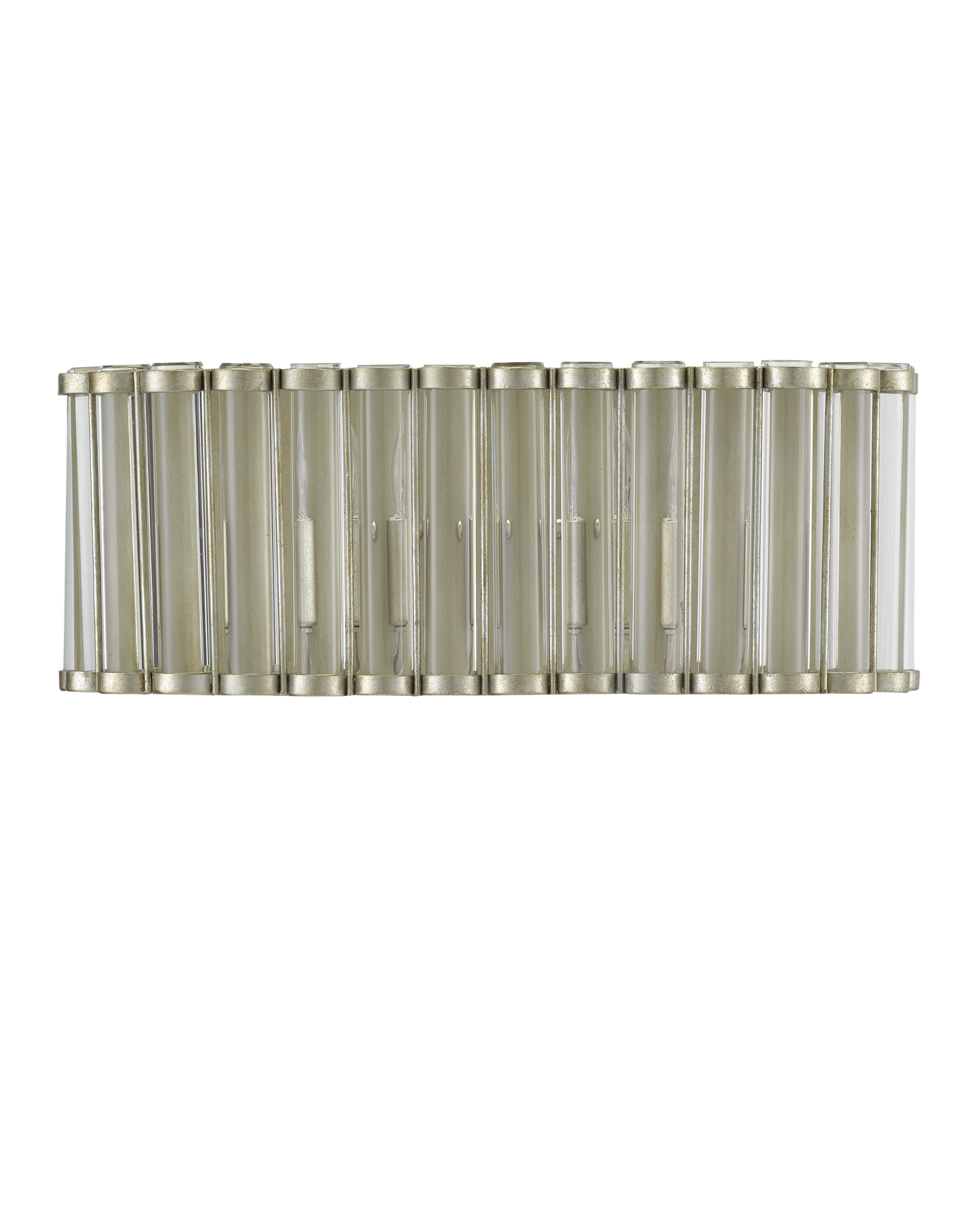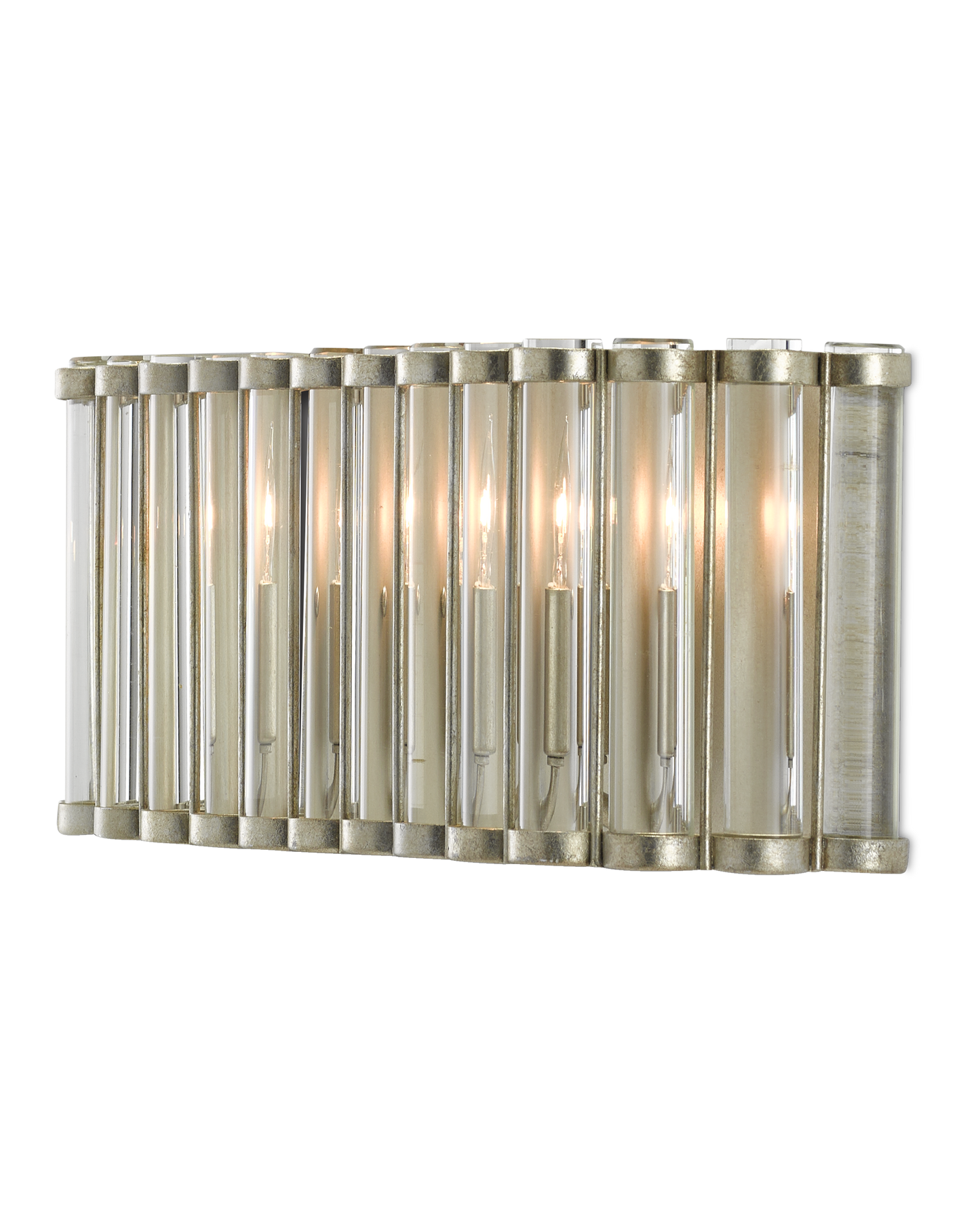Bunny Williams has achieved a timeless profile with the Warwick Wall Sconce that diffuses light through high-grade optic crystal tubes. Ribbons of wrought iron in a contemporary silver leaf finish hold the canisters of illumination in place so that the curved form is barely discernable from the front. This silver wall sconce is certified for damp locations.