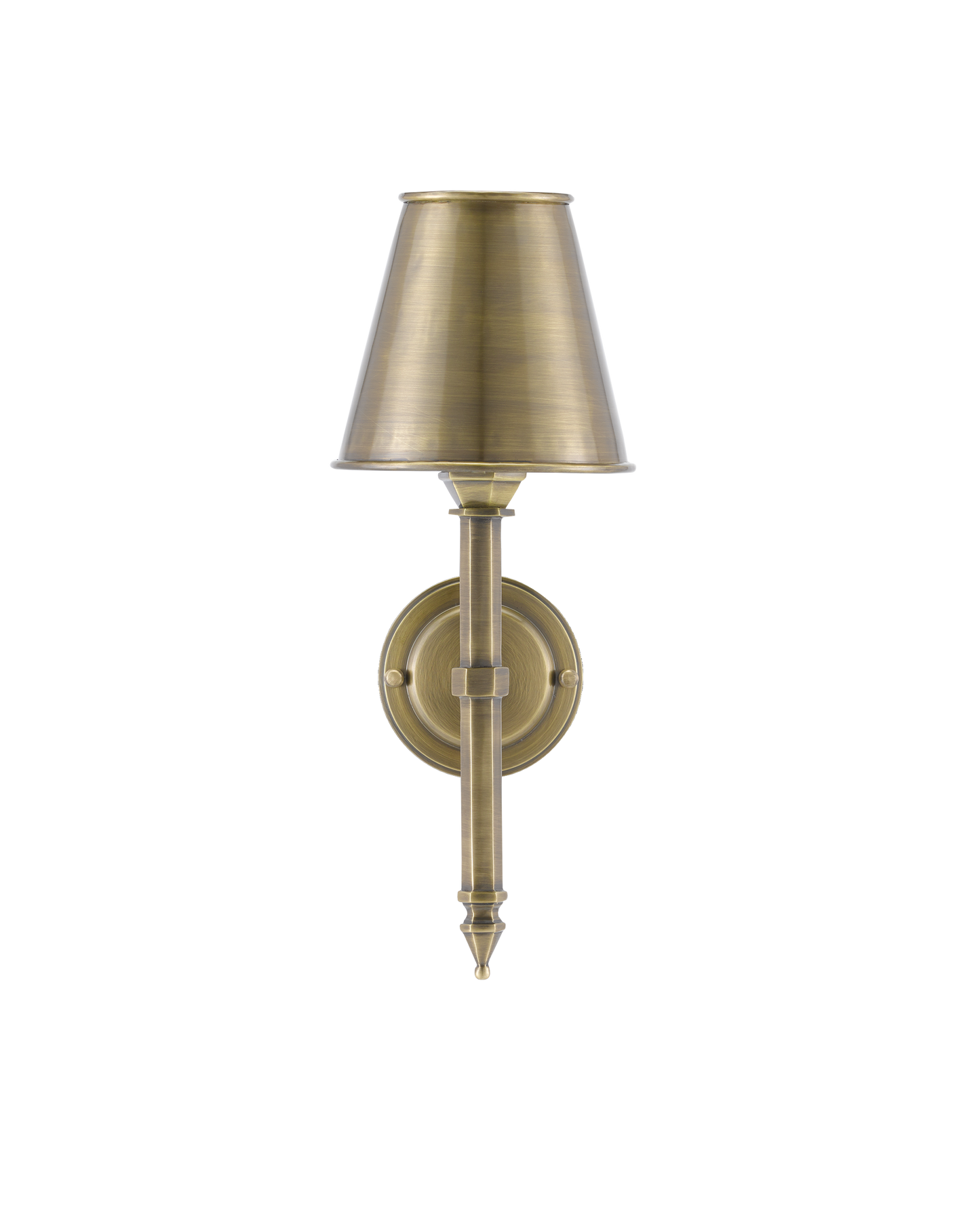 Classically-designed lighting is a hallmark of the Bunny Williams' aesthetic, which applies to the Wollaton Wall Sconce in her collection. Made of brass in a light Moroccan antique finish, the intermingling of finely design geometric shapes and the brass shade in a matching finish are details of note. The gold wall sconce is certified for damp locations.