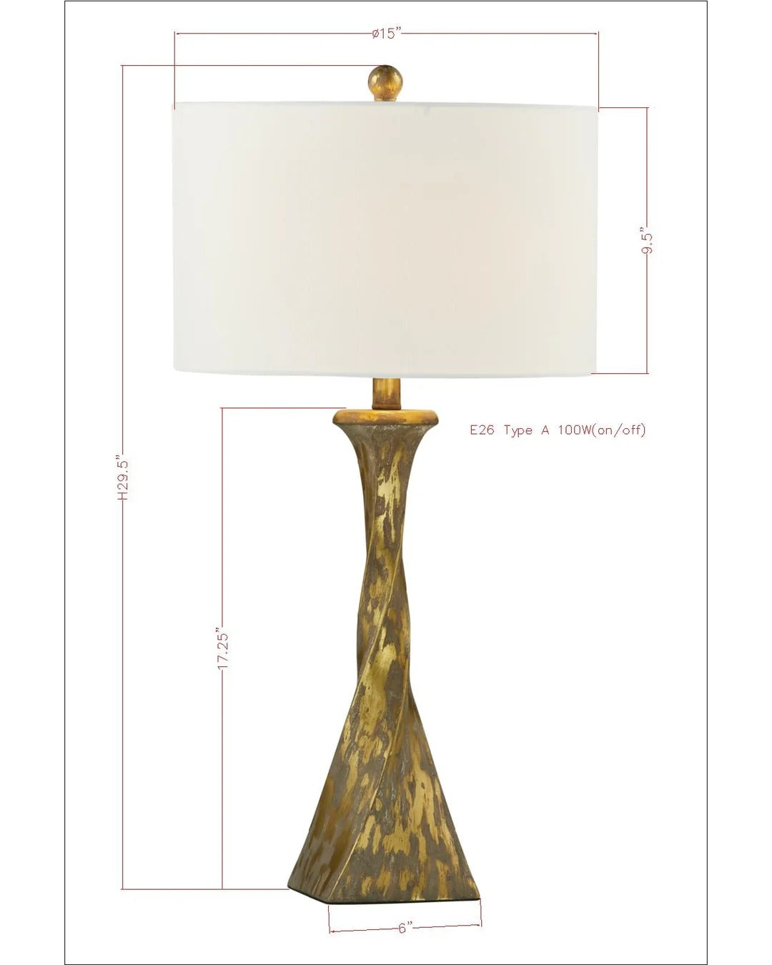 Gracefully twisting upward, this resin table lamp captures the essence of sculptural elegance with its fluid, spiral-inspired base. The antique gold finish enhances its artisanal appeal, adding depth and character reminiscent of hand-carved antique pieces. A crisp, drum-shaped fabric shade balances the design, offering a refined contrast to the base’s intricate movement.