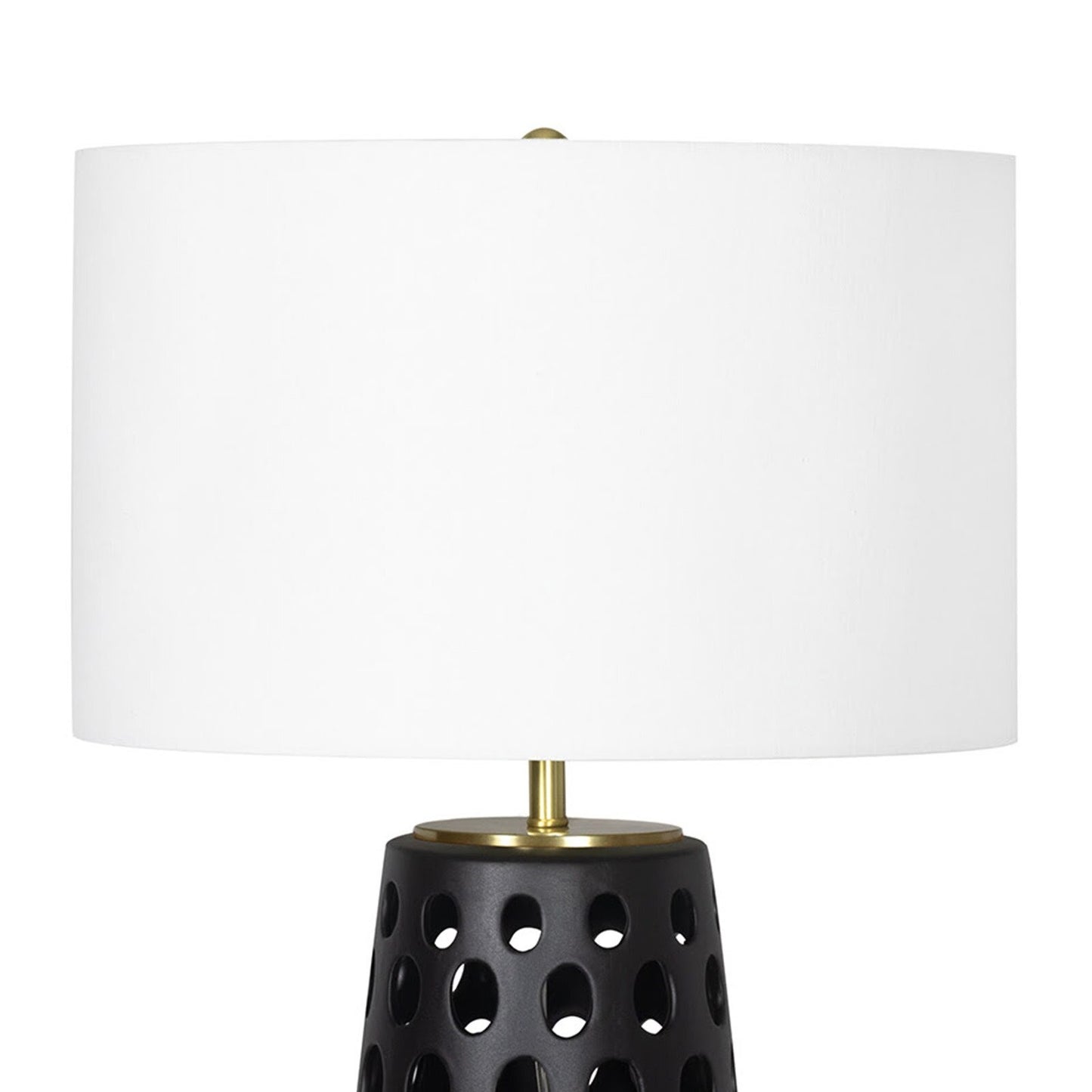 Natural light can filter through perforations on the base of the Kelvin Ceramic Table Lamp, creating a beautiful effect by day as much as it has while illuminated during the evening. Finished with a black glaze and paired with a crisp linen shade and natural brass fittings, the Kelvin would look incredible as a pair on either side of a sofa or bedside.