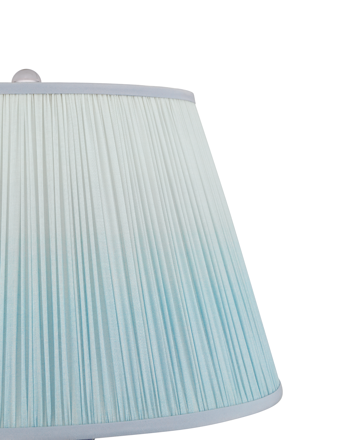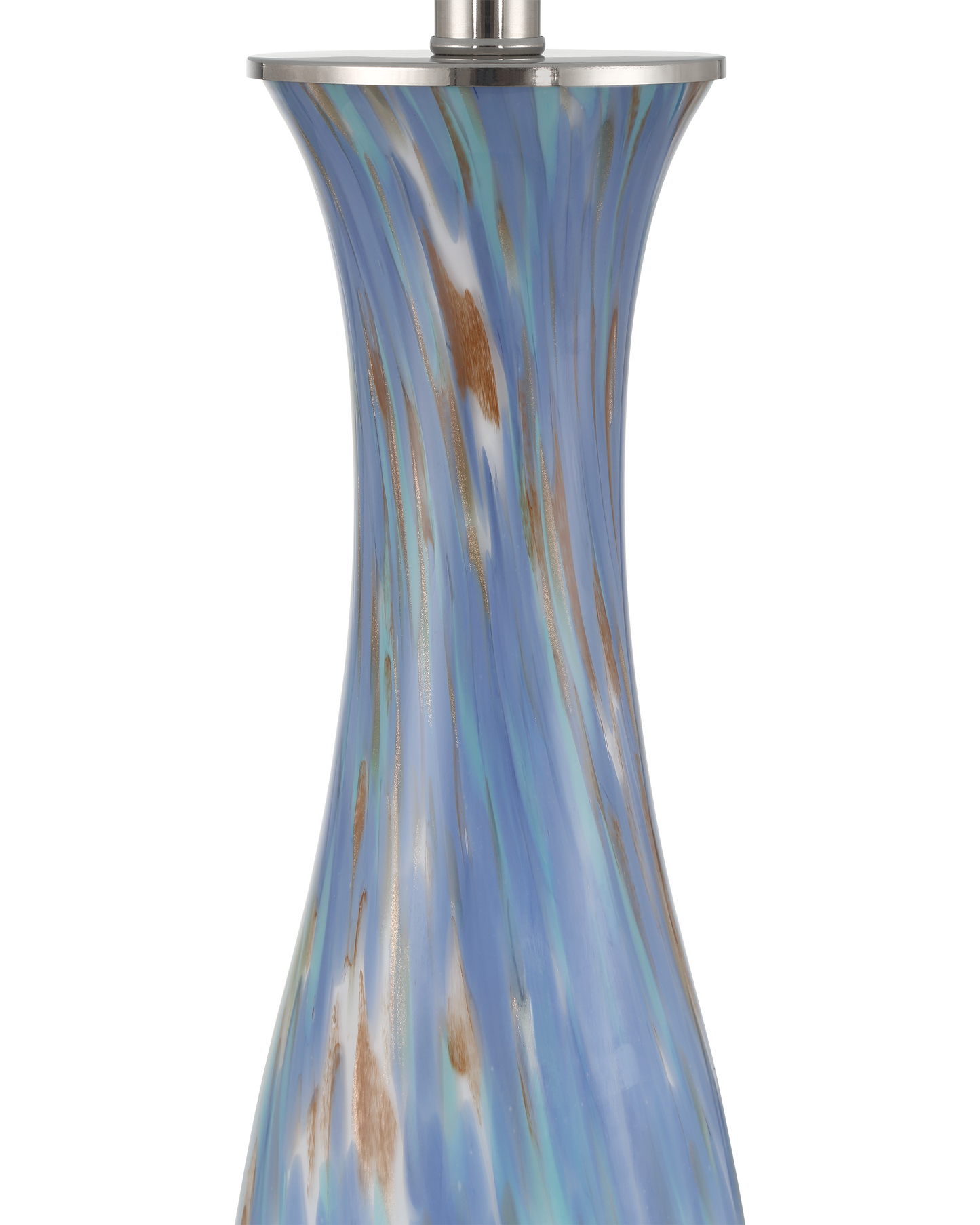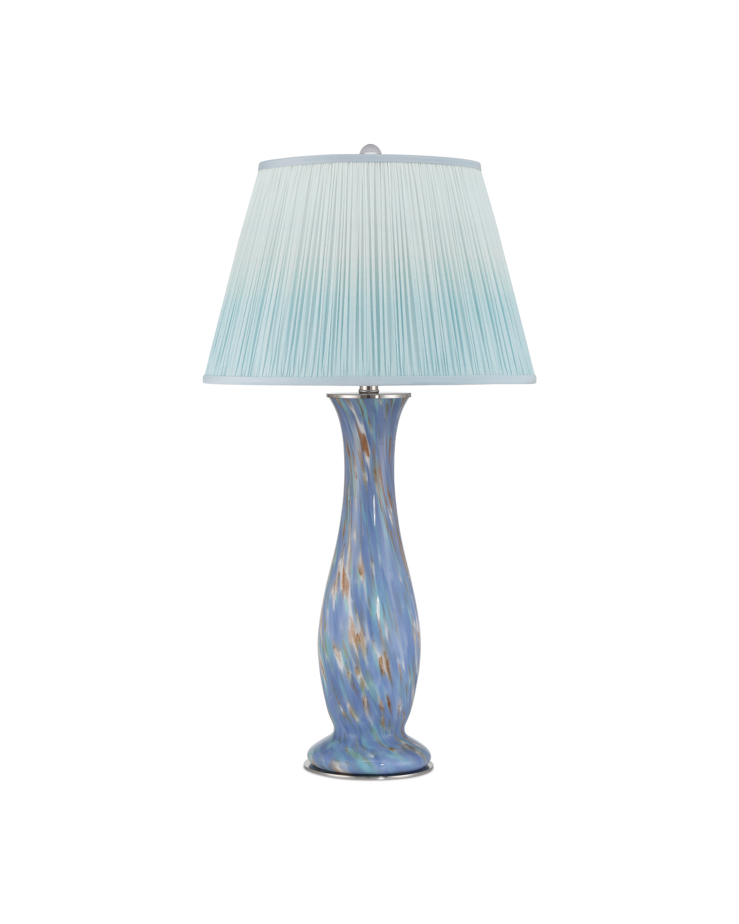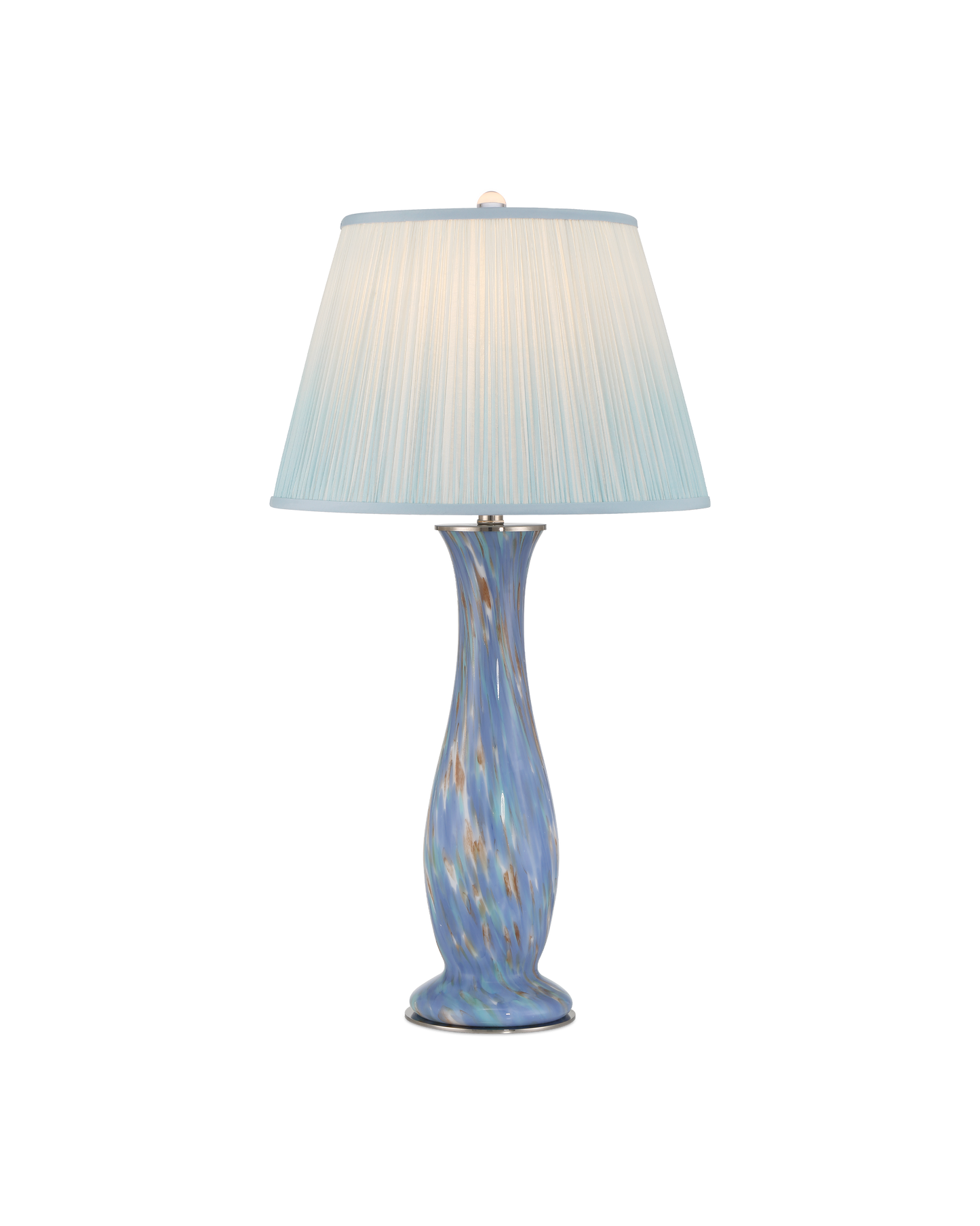 The Lapis Blue Table Lamp has a gleaming glass body on which streaks of white, deep blue, and iridescent copper twist together to create a mesmerizing Easter-egg effect. Fitted with a pleated ombré blue shade, the body was inspired by the tallest vase the prominent French glassmaker and designer Charles Schneider ever made. The swirling pattern brings the lamp a strong sense of movement achieved through a painstaking combination of marbling and glass-fusing techniques, which are difficult to do in tandem.
