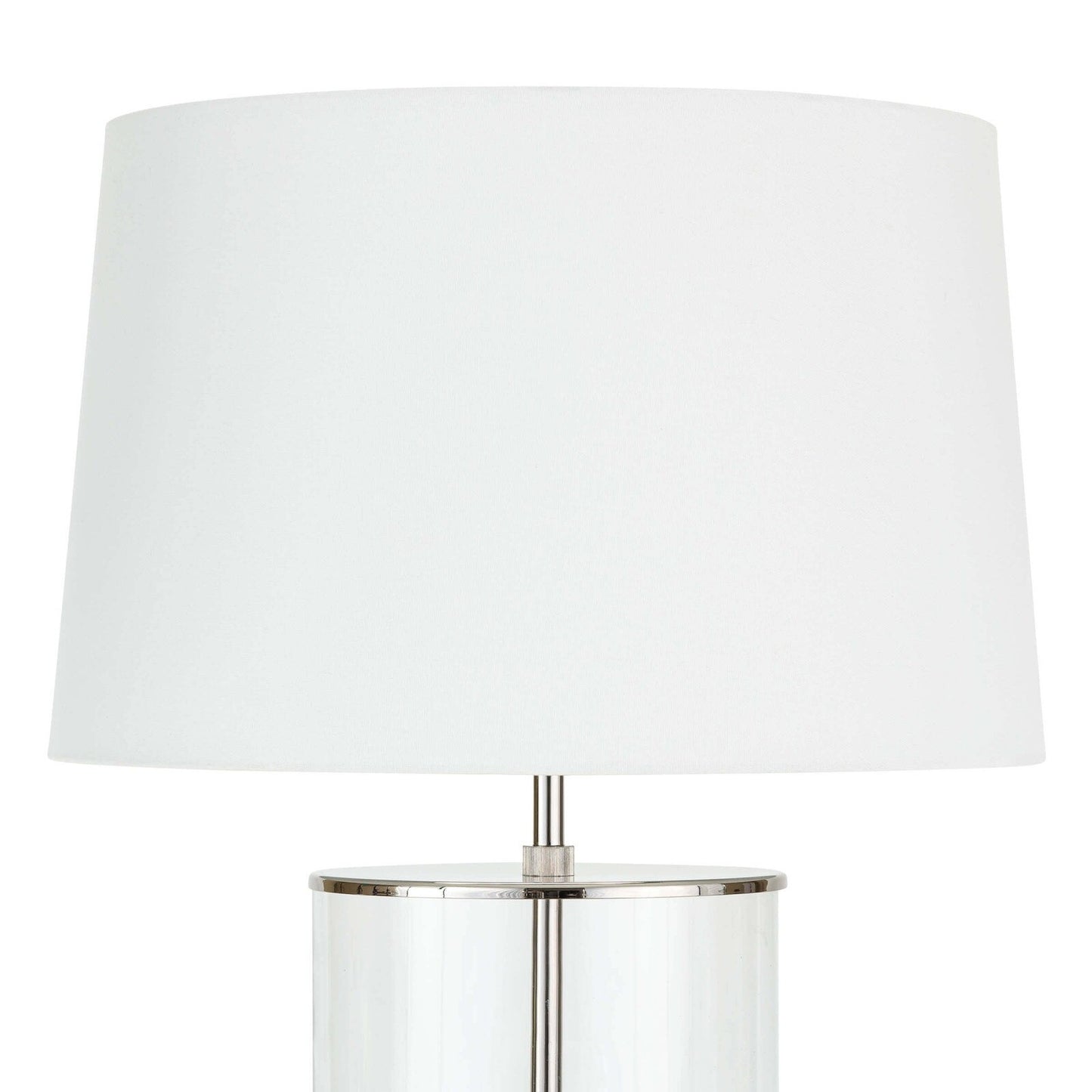 With its classic, cylindrical glass body and polished nickel detailing, the Magelian Glass Table Lamp is well suited to both traditional and modern spaces. Create depth and texture by filling with collectibles such as shells, coral, or other seaside memorabilia for an added air of coastal appeal. The shade and lid easily lift off for arranging and cleaning.