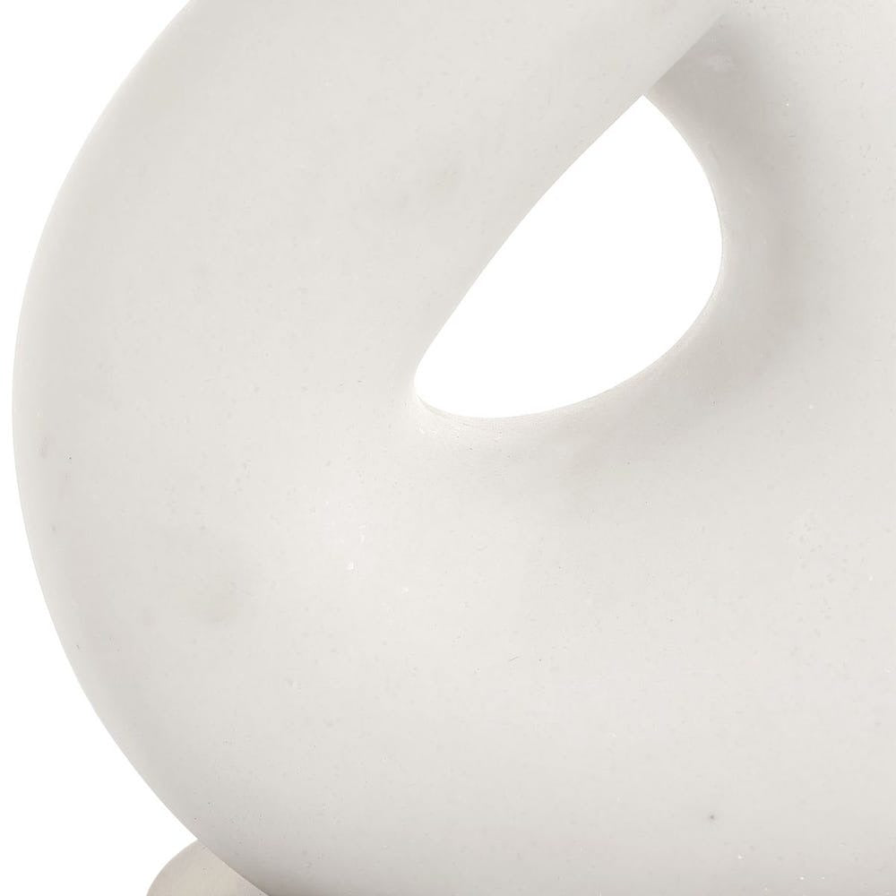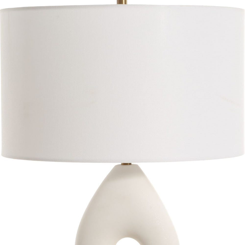 The Meridian Table Lamp Features A Unique Infinity Shape That Adds A Modern Flair To Classic Design. Its Rich Ivory Man-made Stone That Accurately Replicates The Look Of Thassos Marble Is Complemented By A Plated Antique Brass Foot And Matching Hardware. The Lamp Is Paired With A Hardback Drum Shade Covered In A White Linen Fabric.