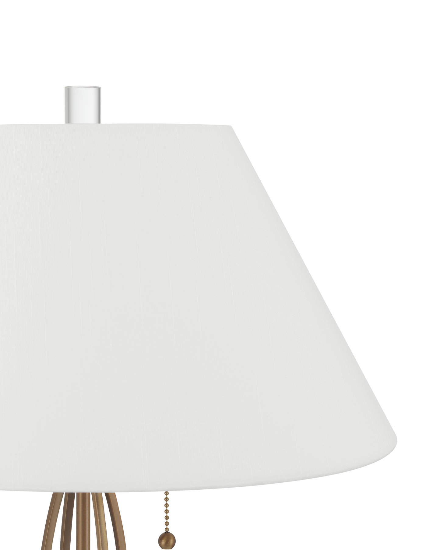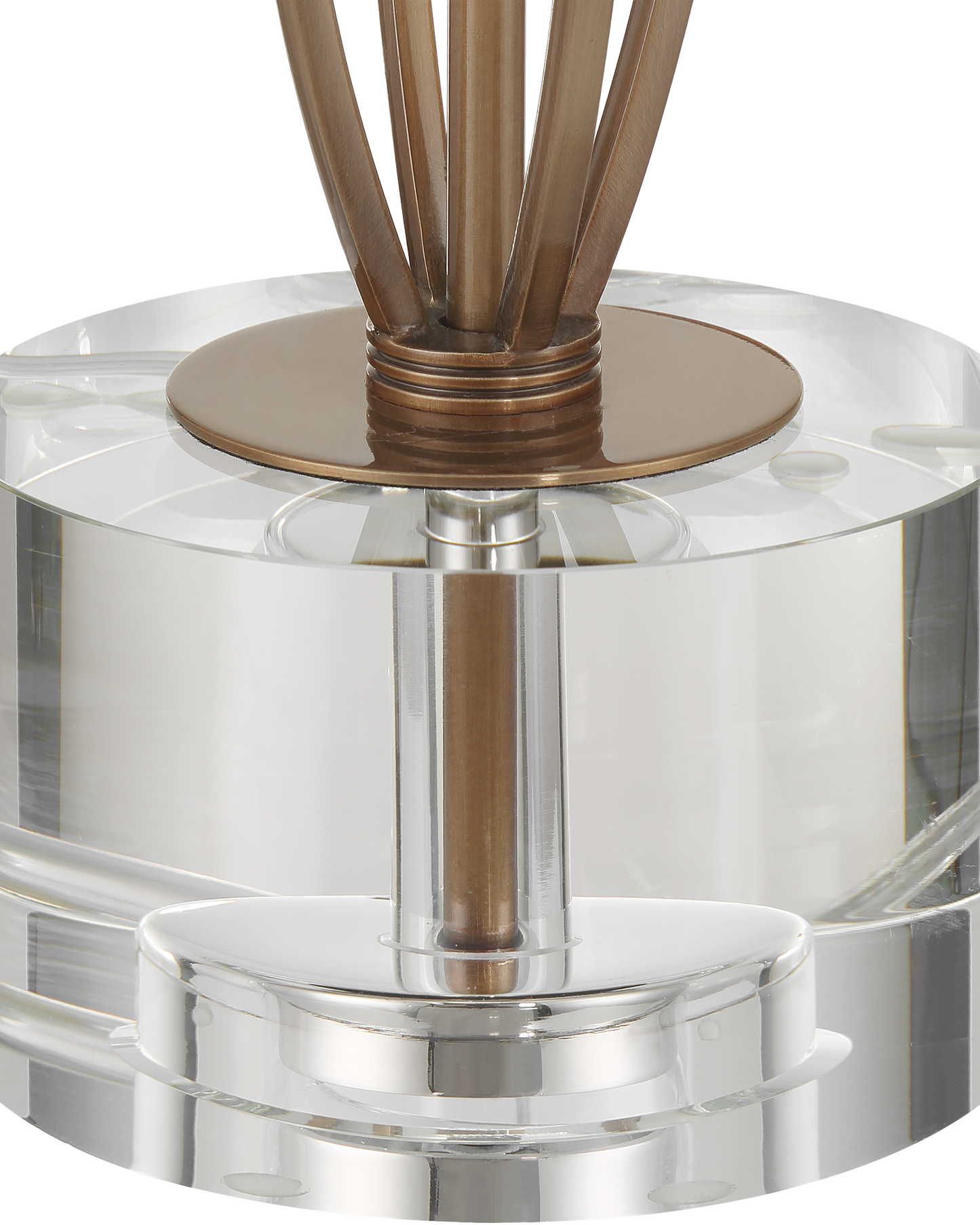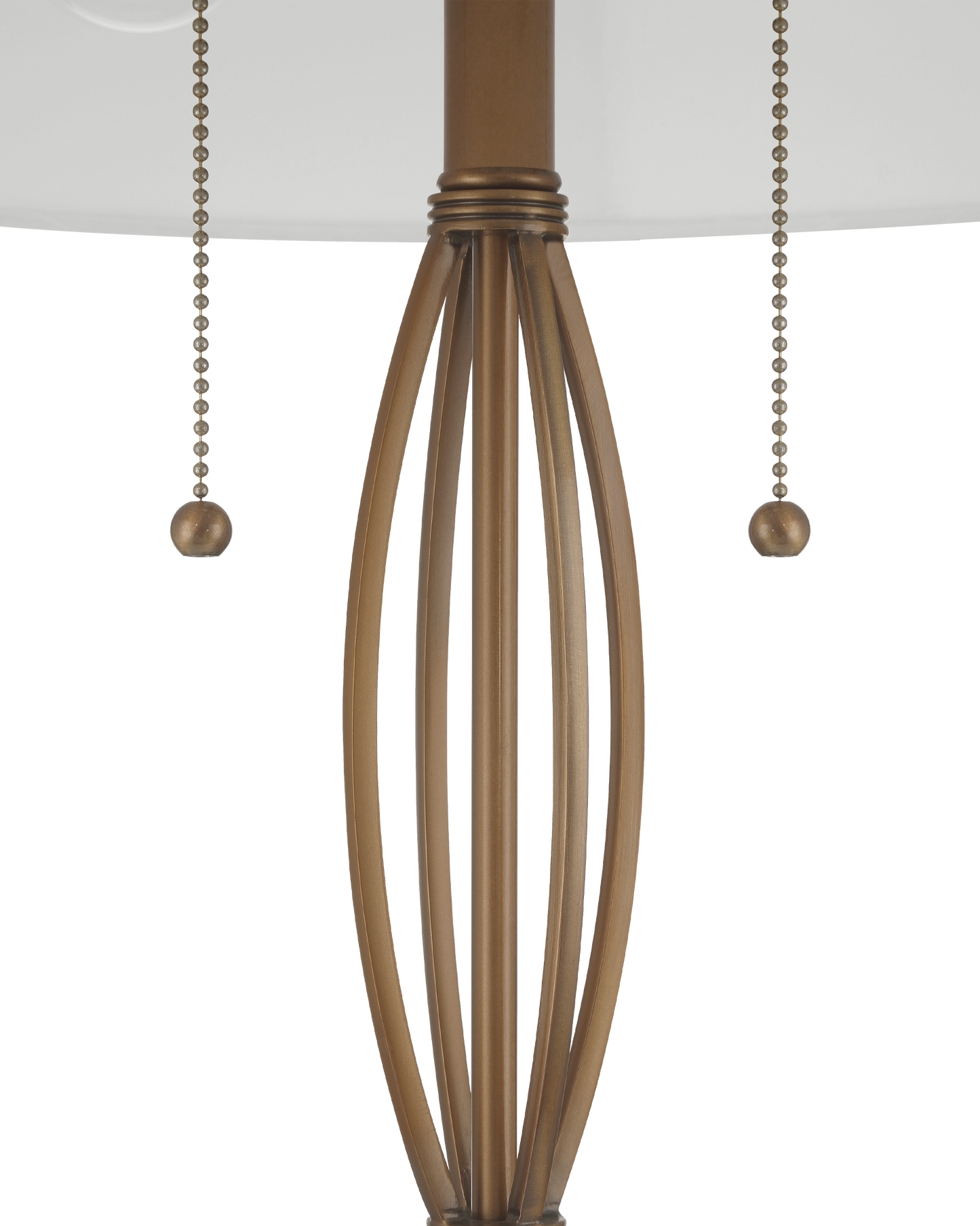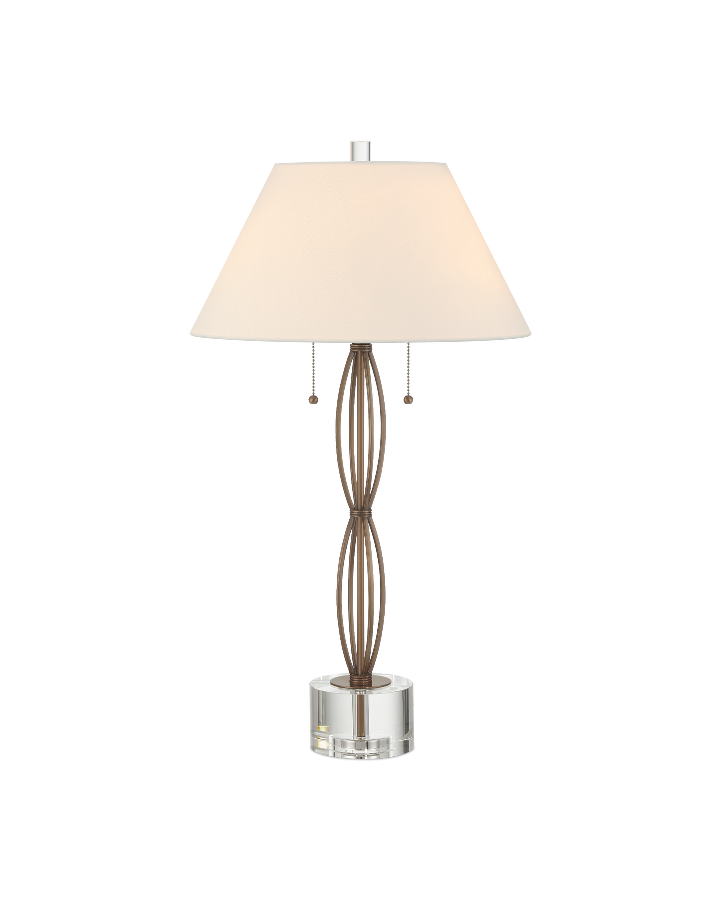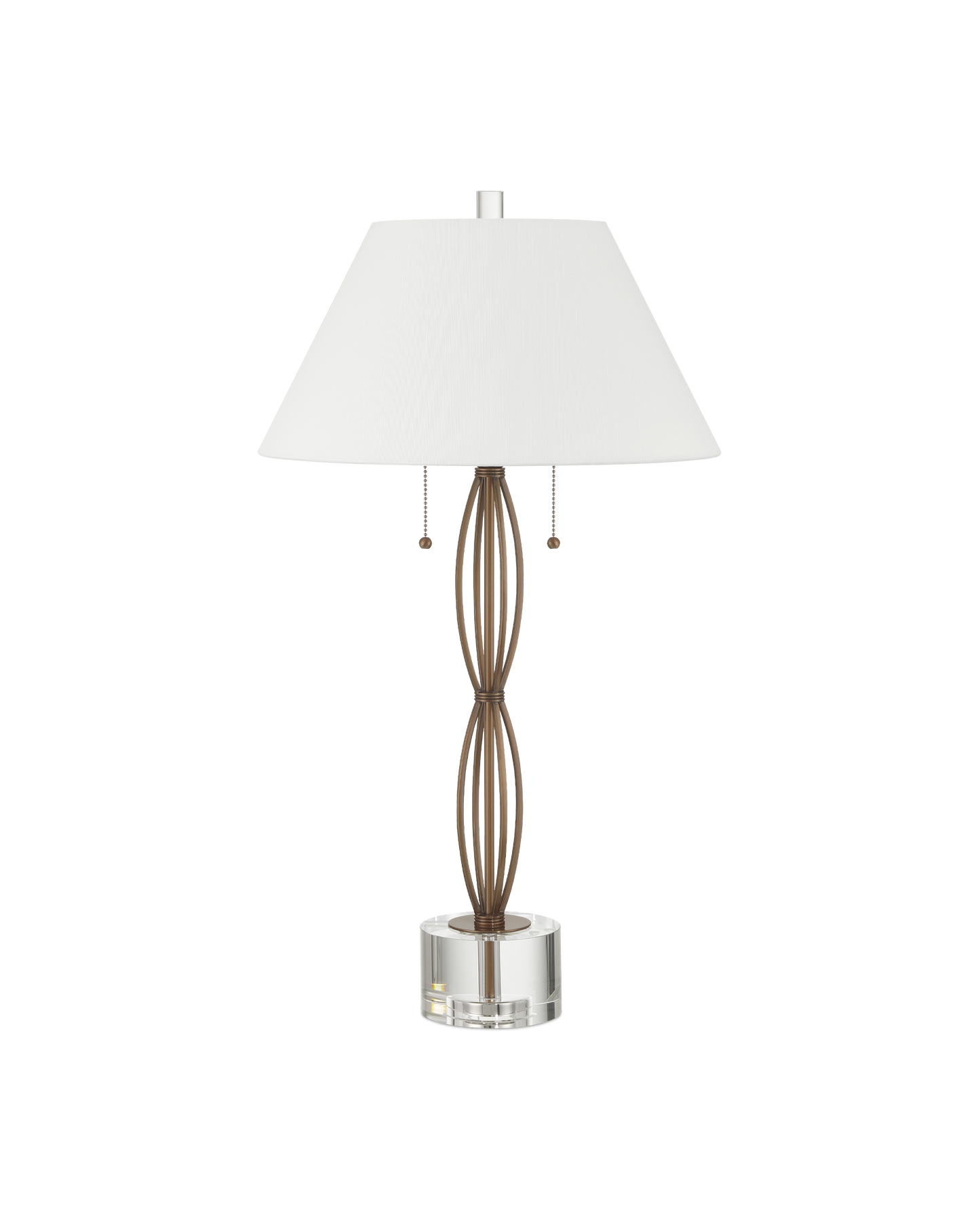 The Mizner Table Lamp has an airy shape made of rods of metal in an antique brass finish that are banded together at the top and bottom, and cinched in the middle, to create a swelling profile. The fluted body rises from an optic crystal base toward the truncated empire shade that is fastened to the lamp with an optic crystal finial. The two-light lamp has dual pull-chains to enhance its streamlined traditional feel.