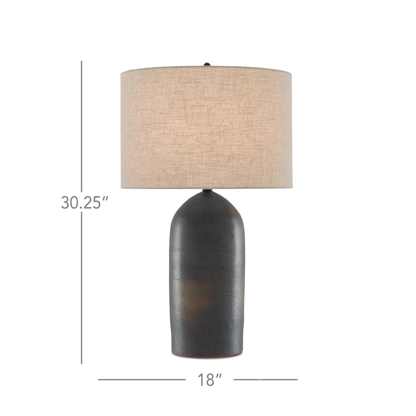 Regular price $696.96The torpedo-shaped body of the Munby Table Lamp has subtle variations in texture. Made of rust-colored and iron-hued ceramic, dark gray tones dominate on the lamp's body with rust patches showing through. Metal hardware in a semi-glossy black finish and a matching finial secure the natural linen shade to the gray lamp.