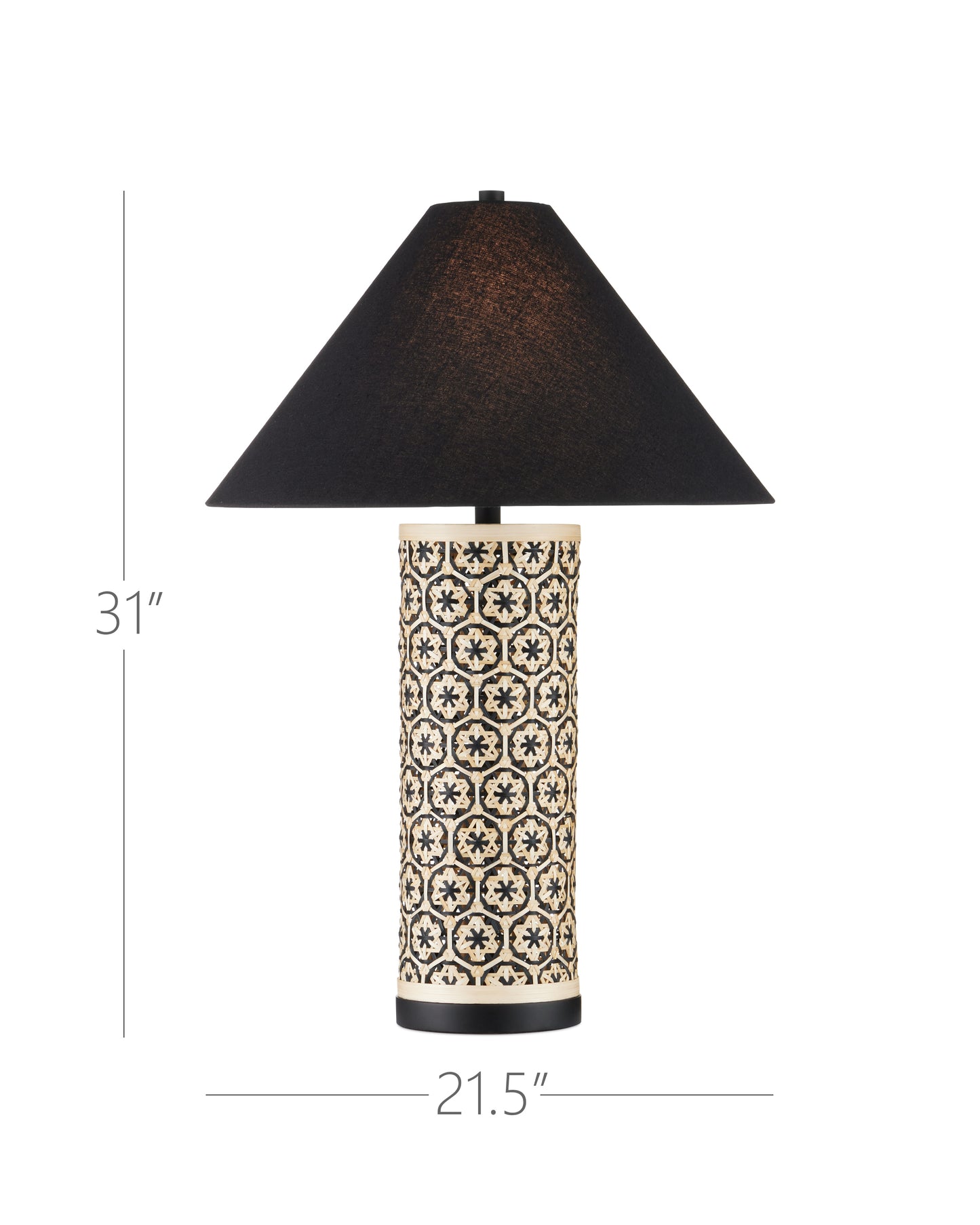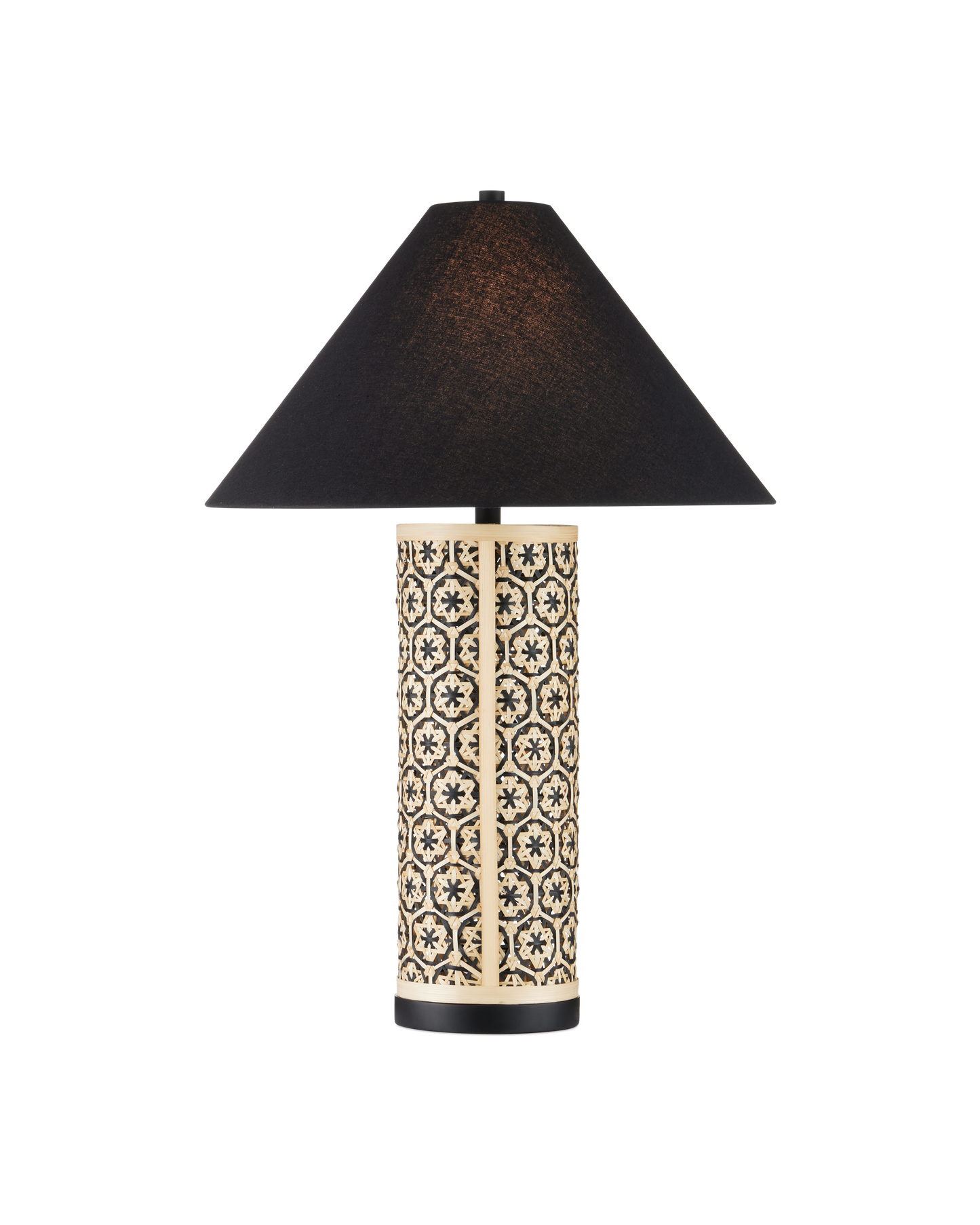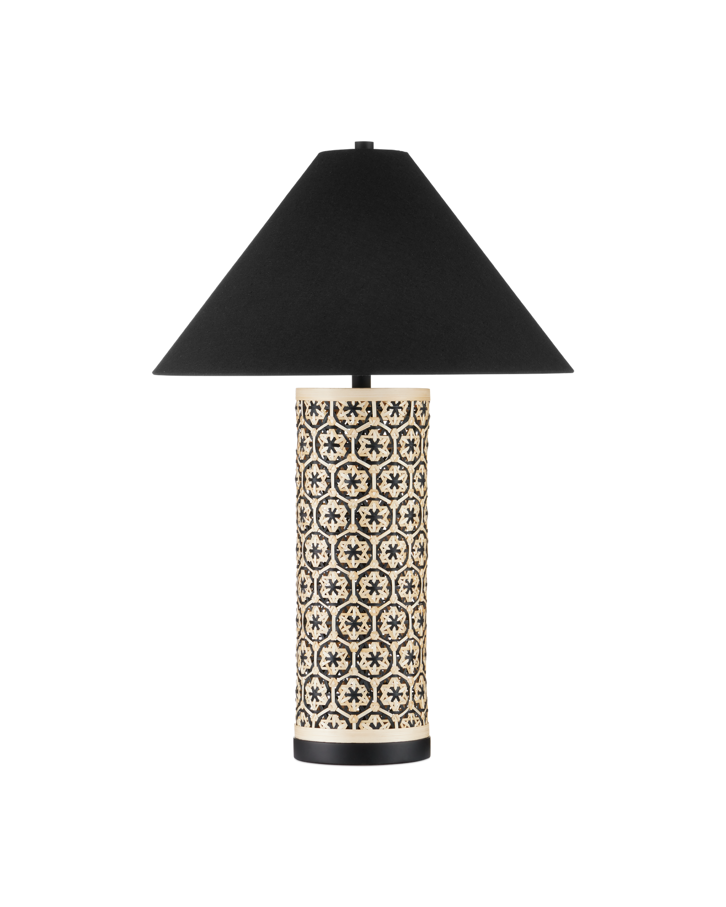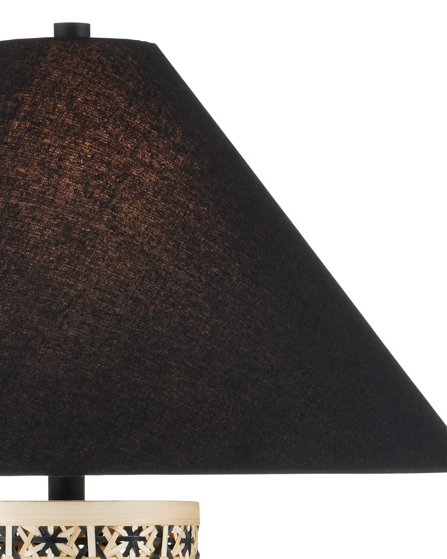 The motifs on the columnar body of the Nebulon Table Lamp are hand woven in a traditional Vietnamese pattern called star-weaving. The artform, which is generations old, involves intermingling black-dyed and natural bamboo into the pattern. The metal base and hardware complement the black empire shade, which amplifies the dark tones in the lamps body. Each lamp will vary slightly due to the hand-made uniqueness of each weave.