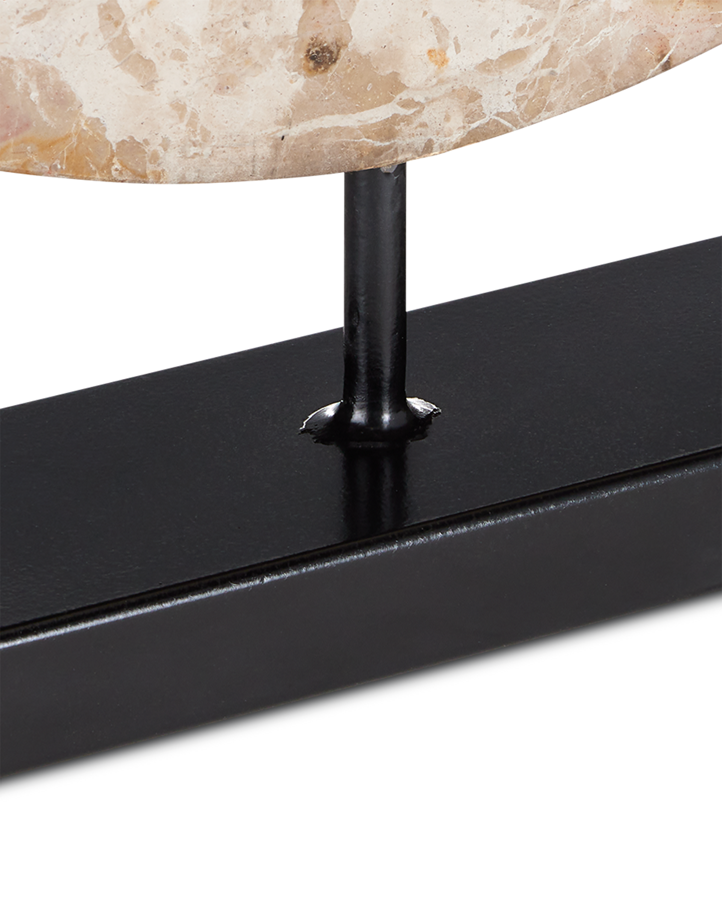 The Anu Marble Disc is a textural marvel. The pitting and mottling of the natural stone make the tan sculpture feel like a fossilized artifact, while the simplicity of the black metal base furthers the feel that this stone disc is museum-worthy. Because the personality of each slice of stone varies, each of these decorative accessories will be unique.