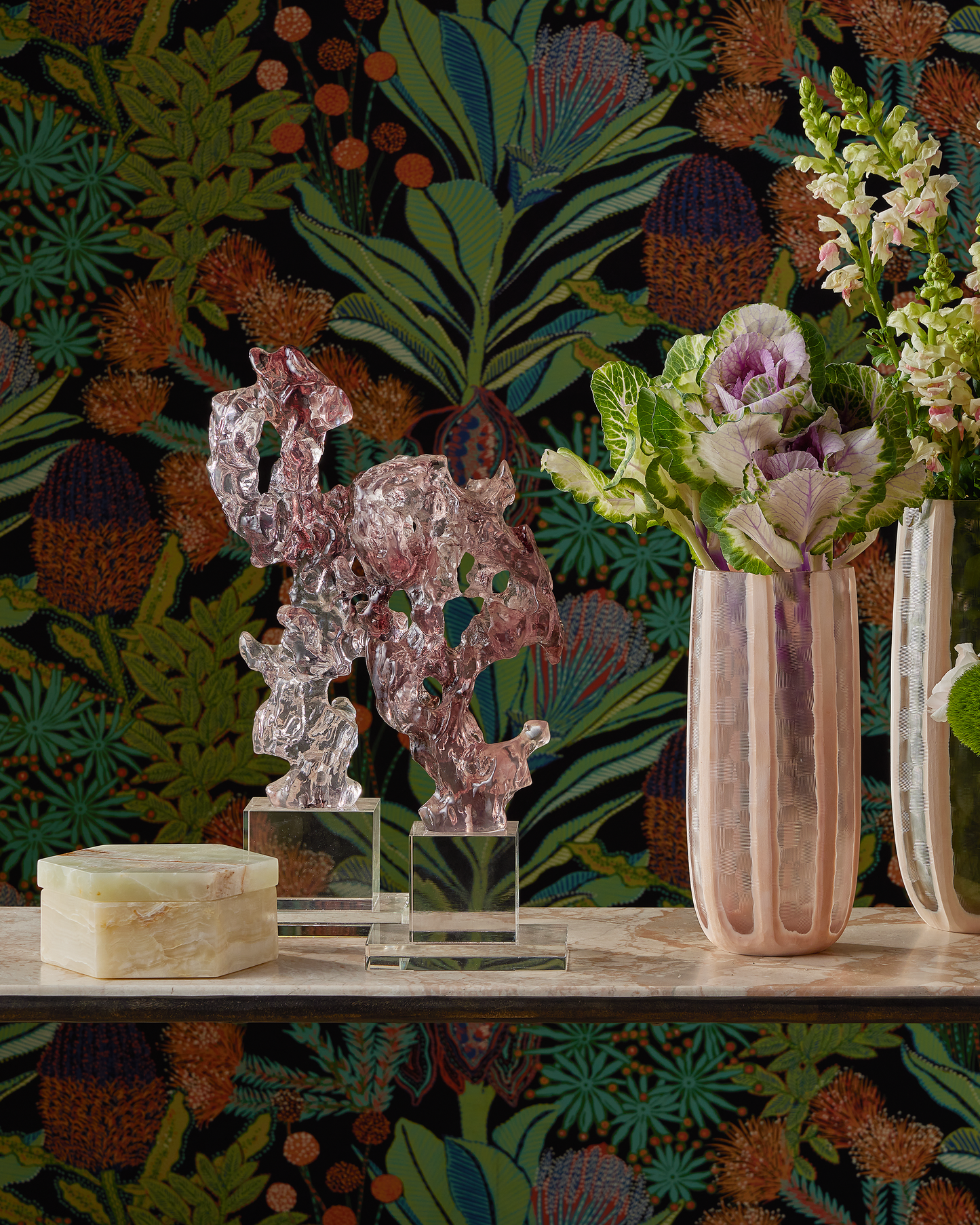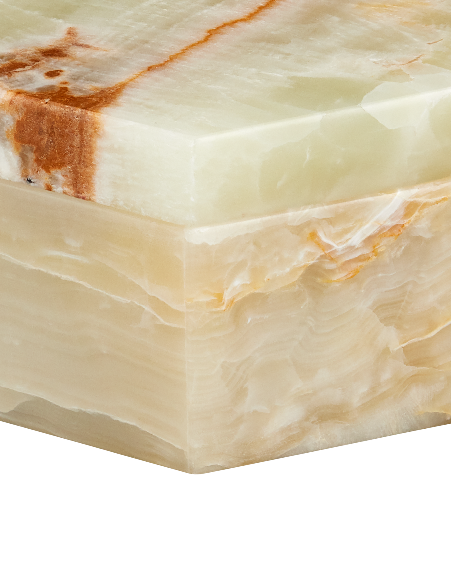 The Arco Green Onyx Hexagon Box has contemporary lines contrasted by lively veining that is natural to the luminous stone. The patterns on these ancient stones are painterly when sections are smoothed to reveal them. The variations are endless, so each of these pale green boxes will vary slightly. On some decorative boxes, the bright rust veining with be subtler while on others, it will be bolder.