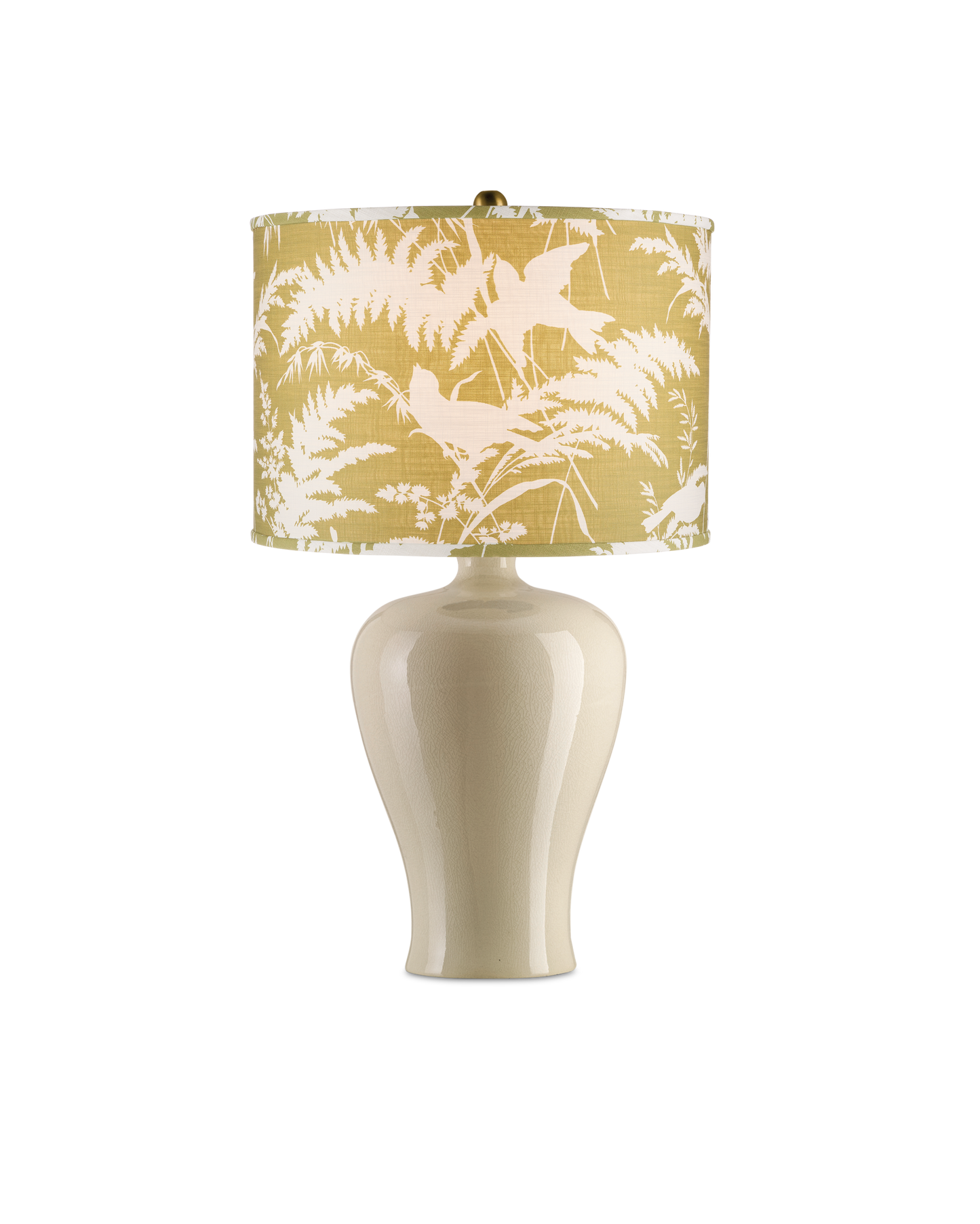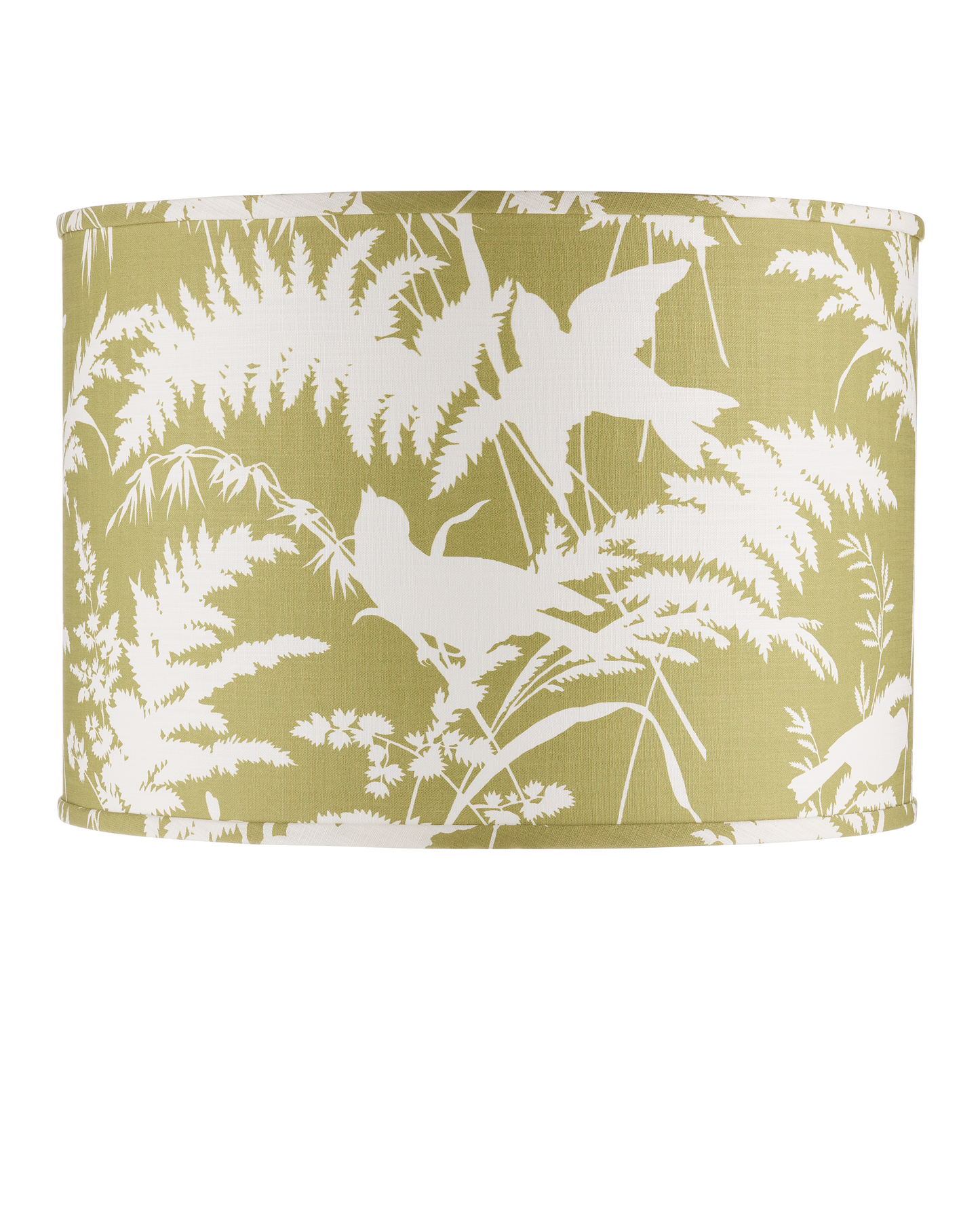 A reverse-printed image of birds amidst fern fronds stands out against a citron green background on this drum-shaped lampshade from our partnership with Lacefield Designs.