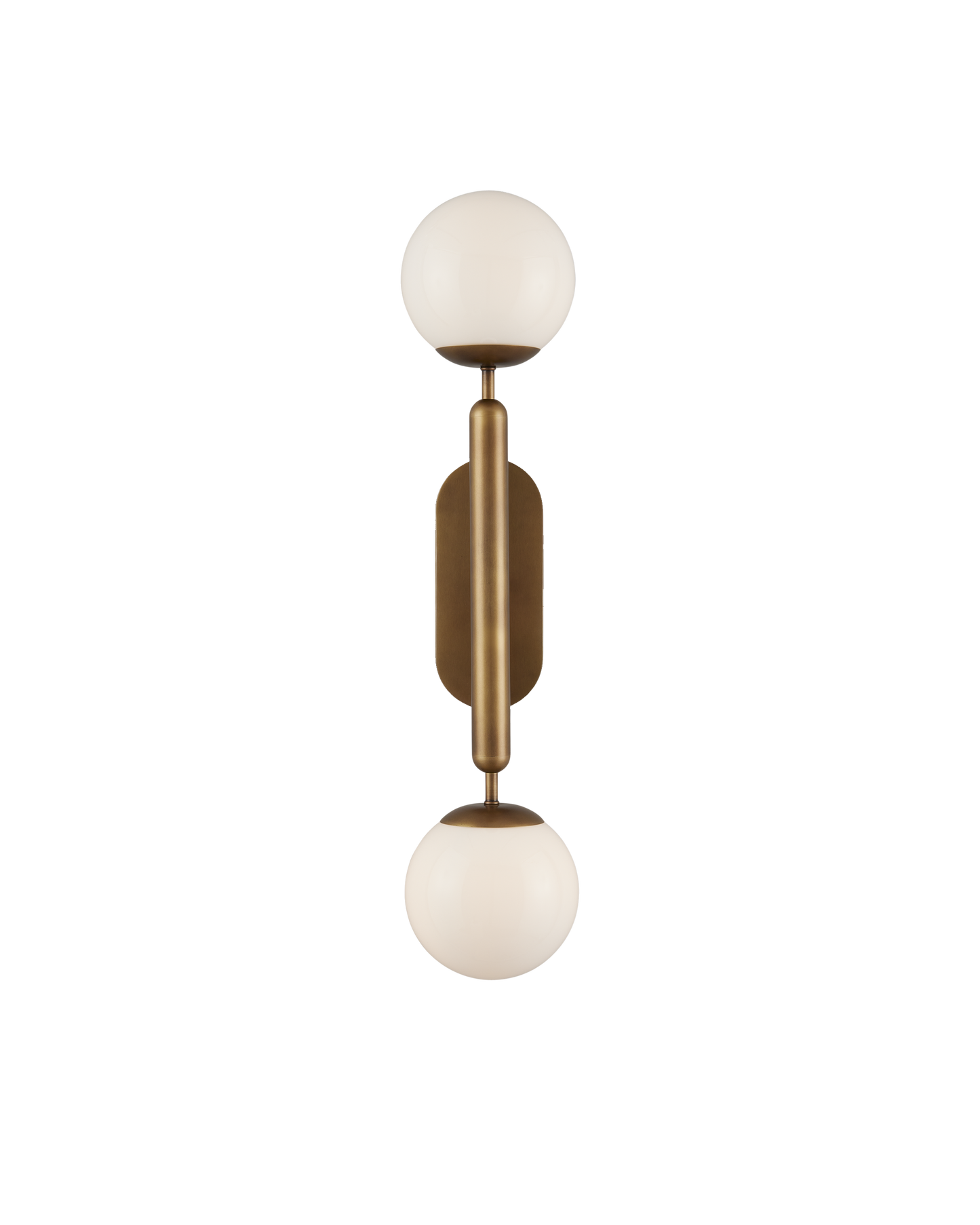 The Barbican Double-Light Brass Wall Sconce features a tubular stem that balances cup-like shapes into which translucent glass globes nestle. Keeping the design minimal, the button-like hardware is as streamlined as possible. This gold sconce is included in our Barbican Collection of damp-rated lighting, designed specifically for bathrooms. The Barbican can also be mounted sideways to fit over a mirror.