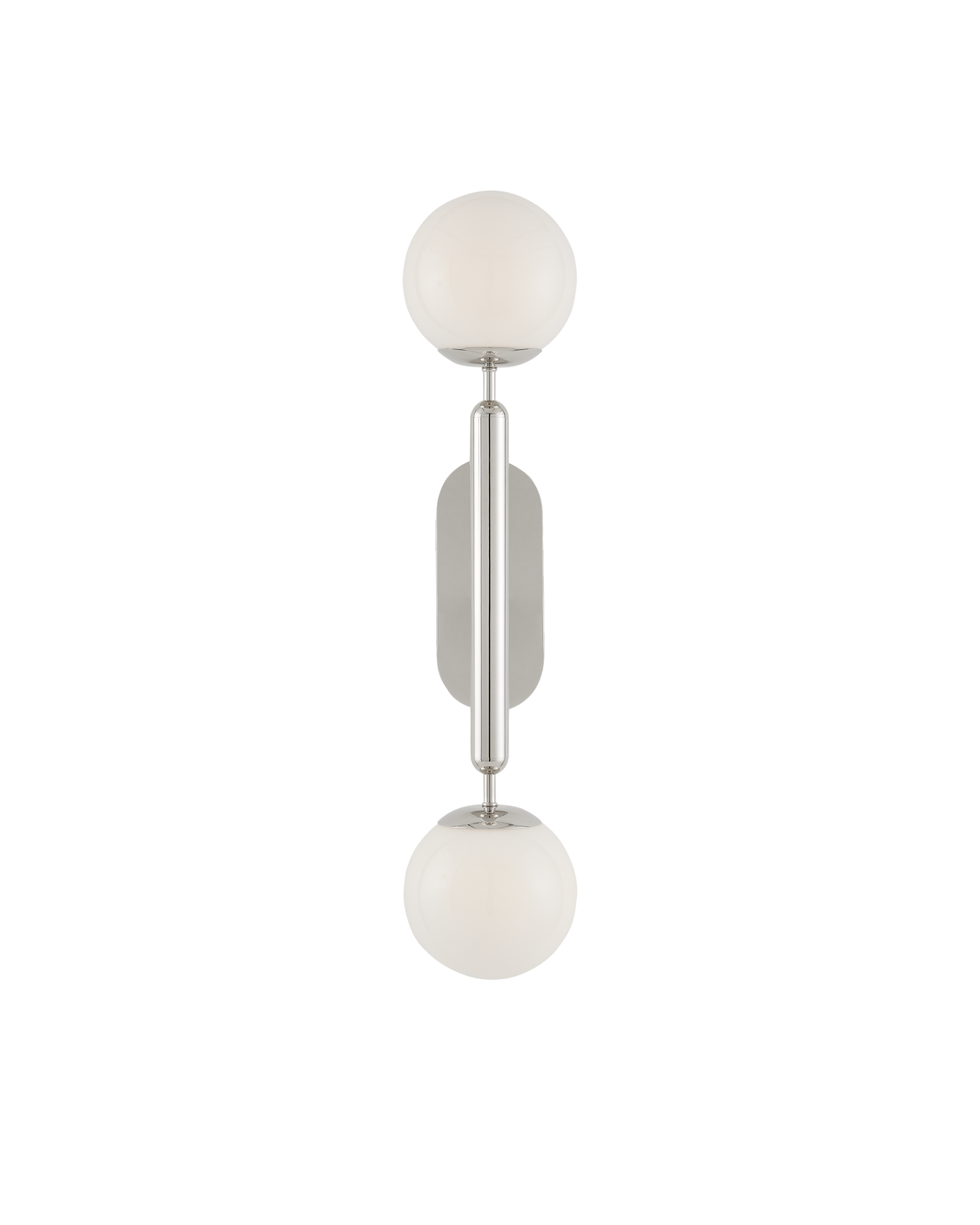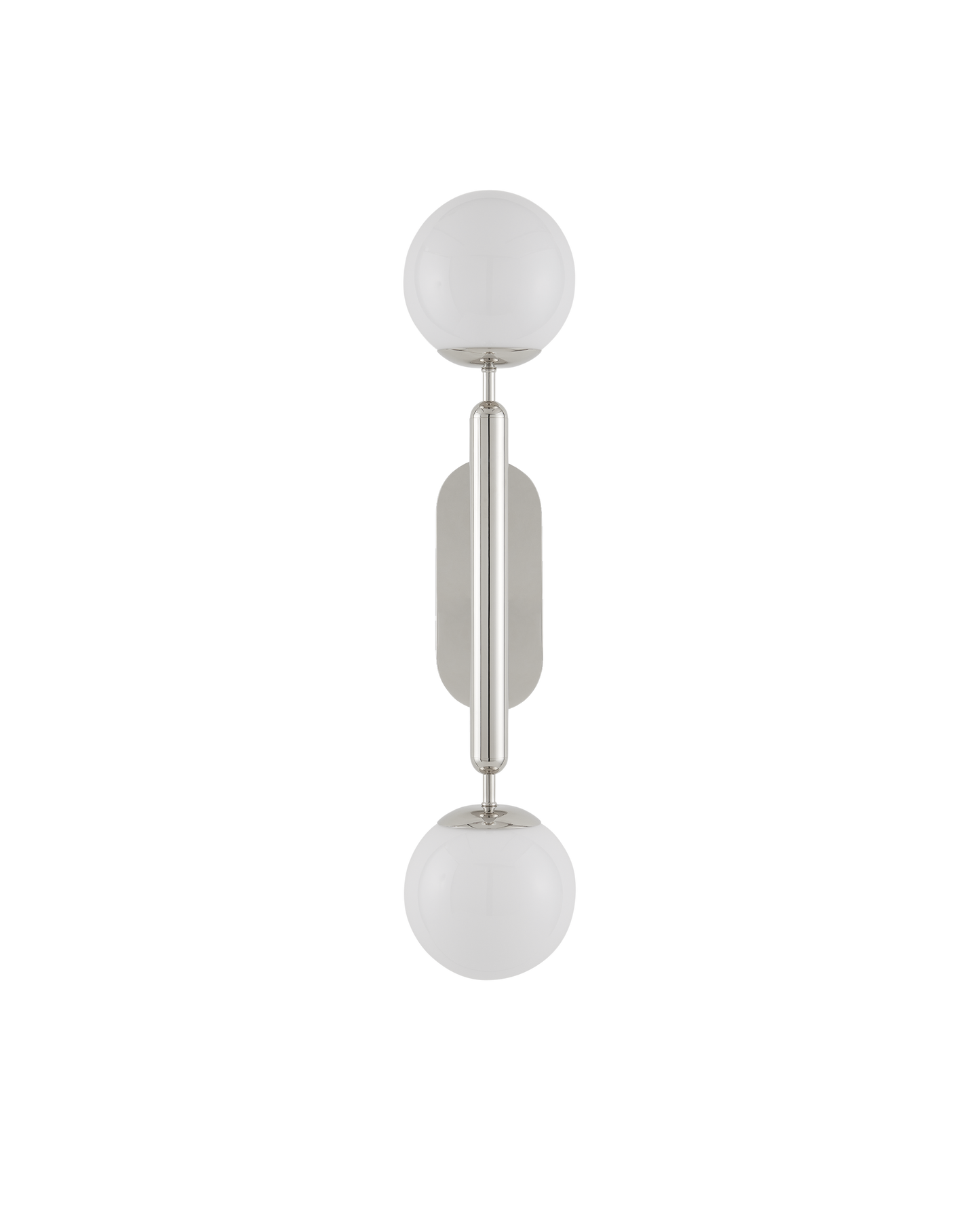 The Barbican Double-Light Nickel Wall Sconce features a tubular stem that balances cup-like shapes, into which translucent glass globes nestle. Keeping the design minimal, the button-like hardware is streamlined to perfection. This silver sconce is part of the Barbican Collection of damp-rated lighting, designed specifically for bathrooms. The Barbican can also be mounted sideways to fit over a mirror.