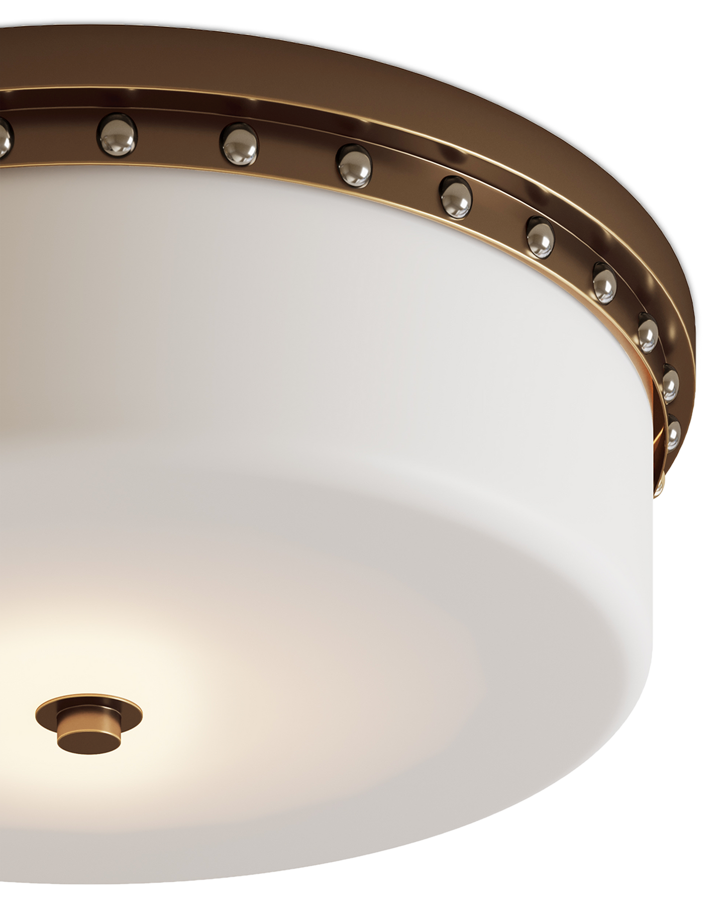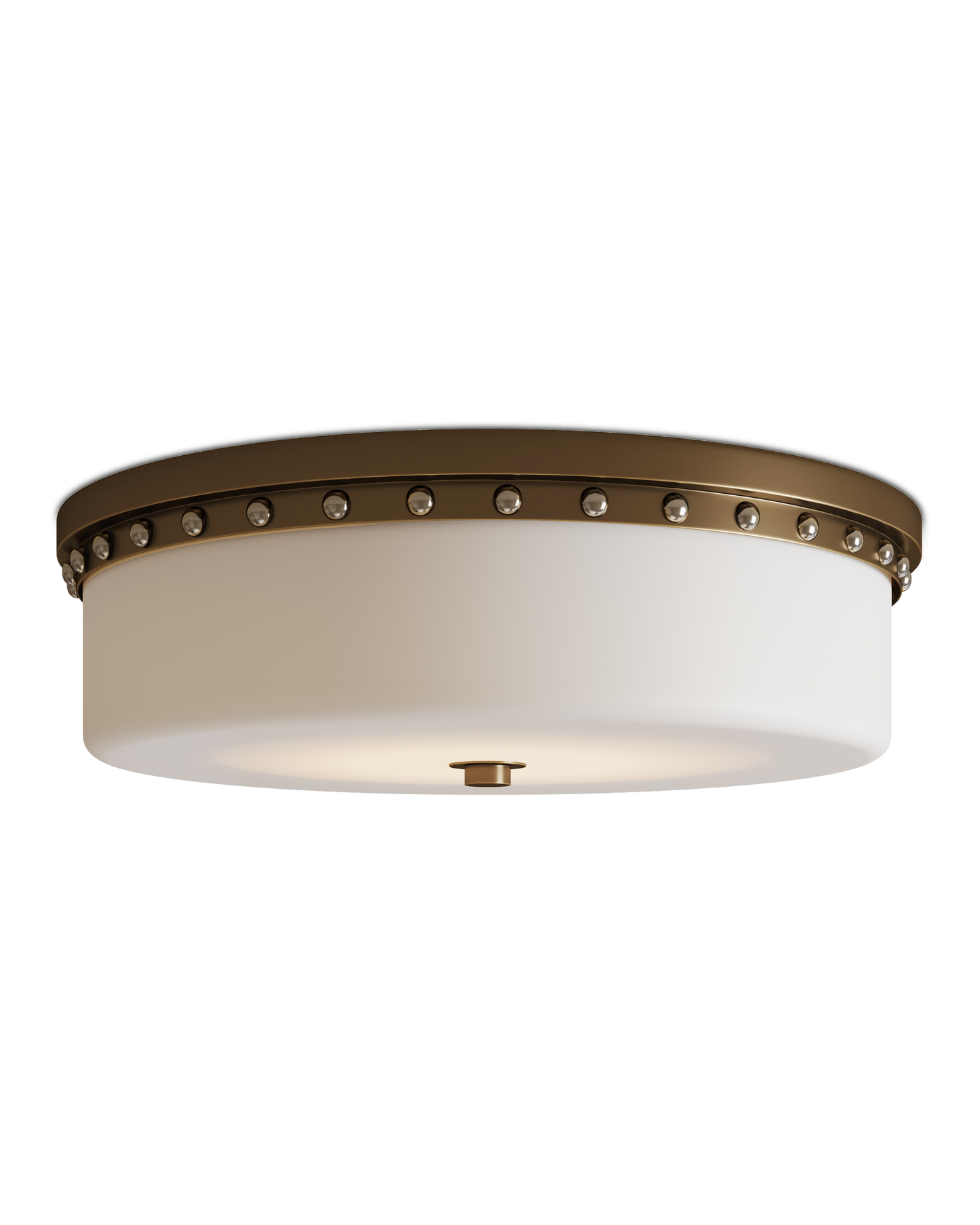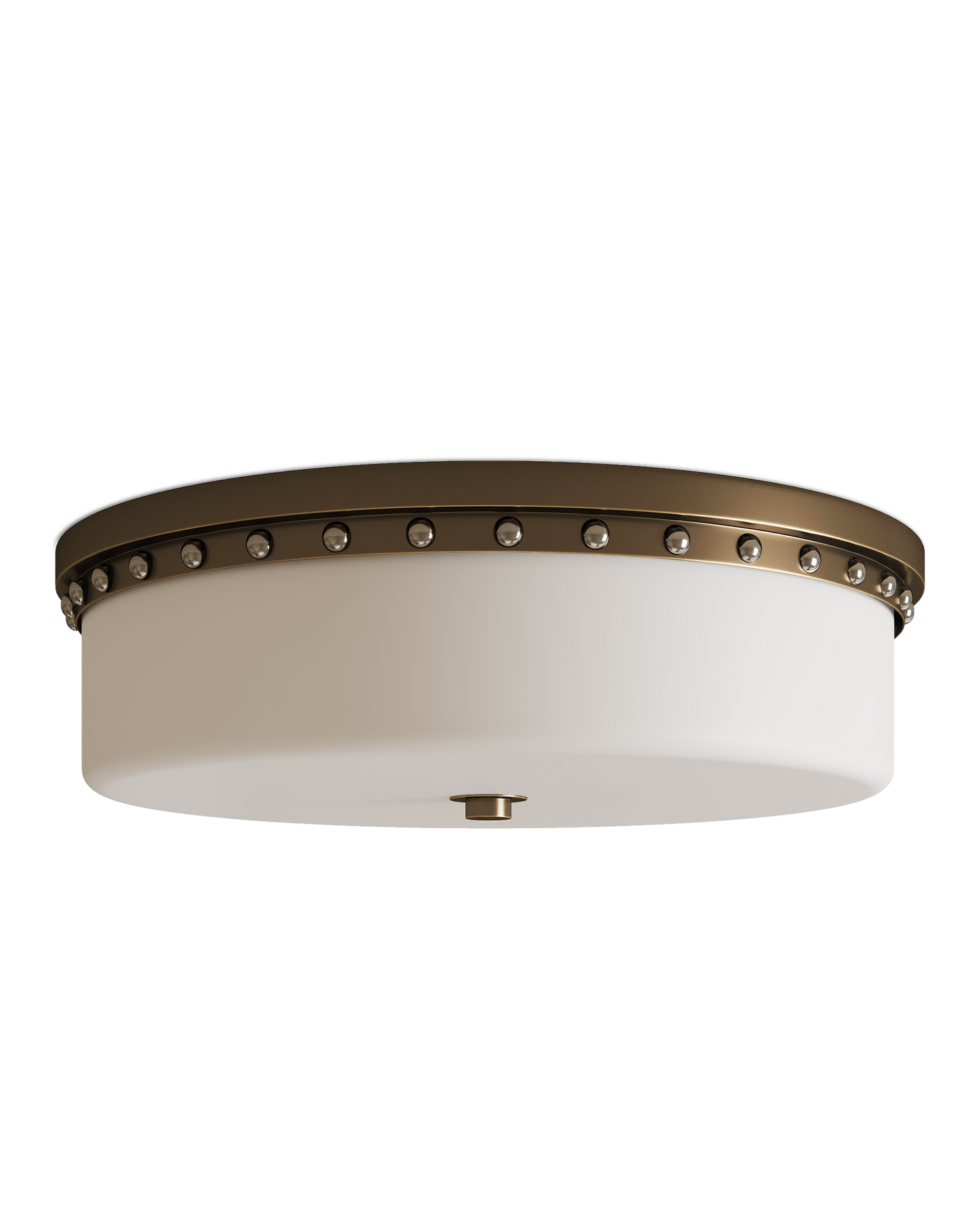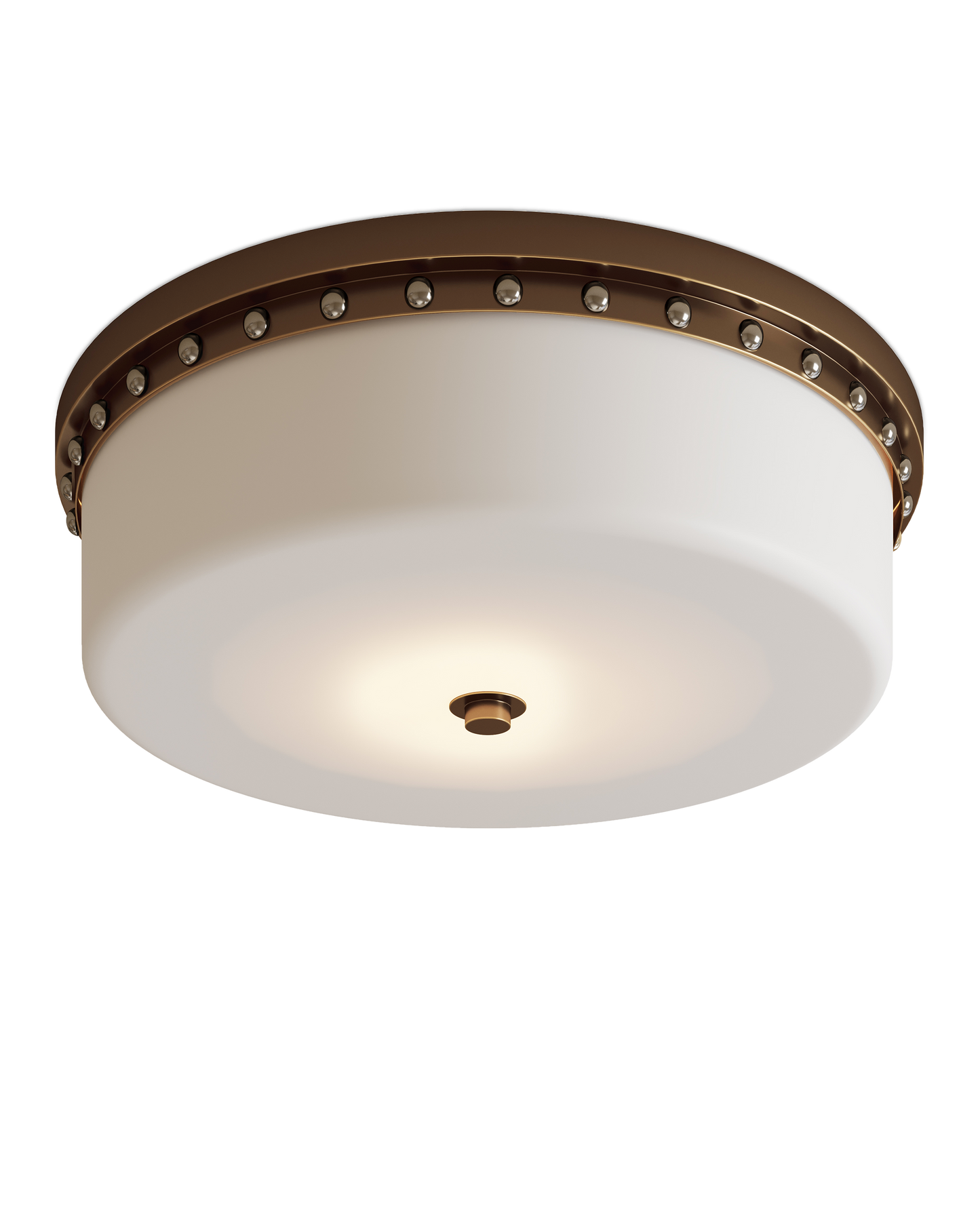 The Barnabe Brass Flush Mount is a tailored design with a technological advantage. Damp-location certified, it is lit by integrated LED that can be adjusted temperature-wise. The opaque glass diffuser fits seamlessly into the ceiling mount made from metal in an antique brass finish. The decorative rivets are in a contrasting polished nickel finish. This flush mount is suitable for illuminating bathrooms.