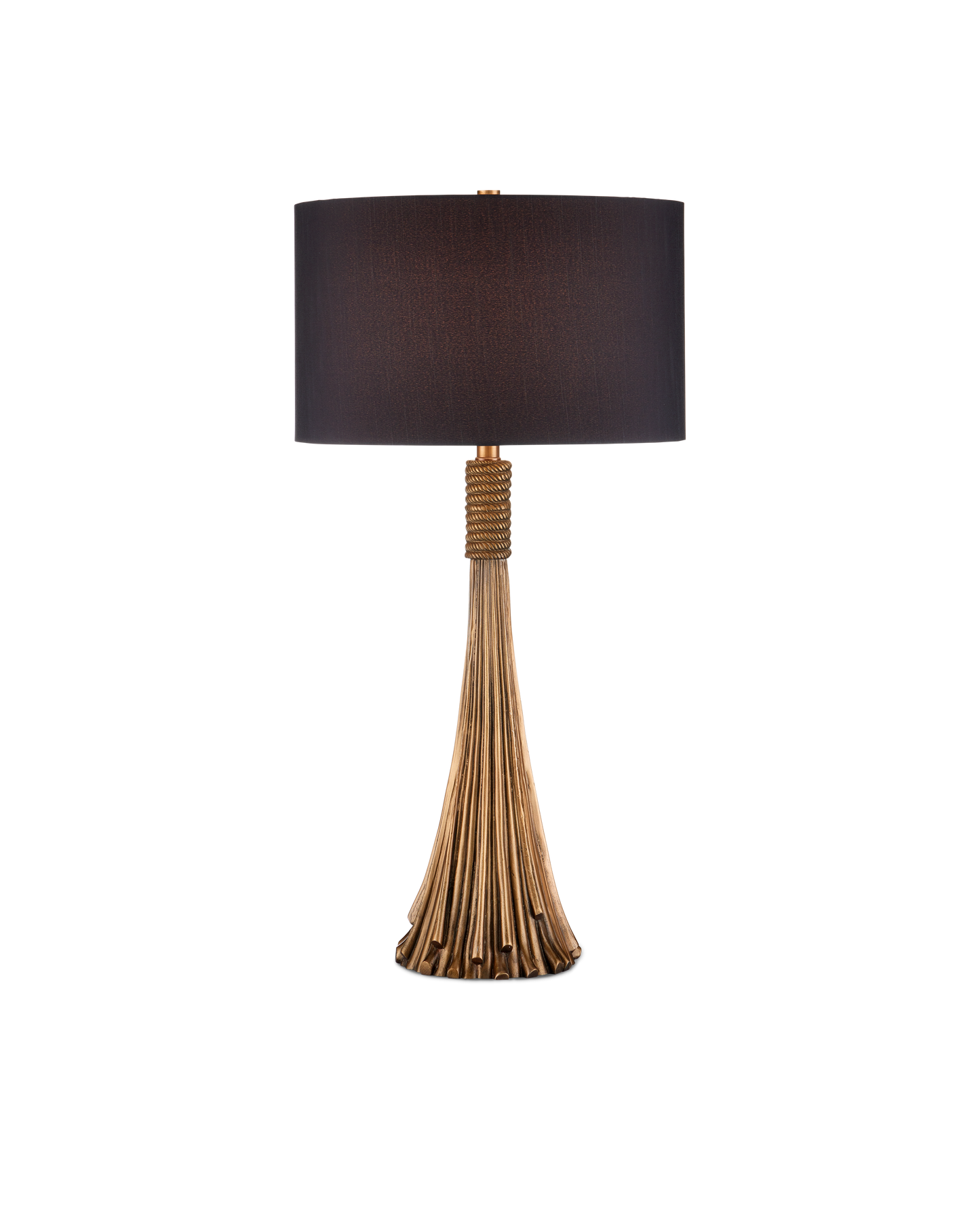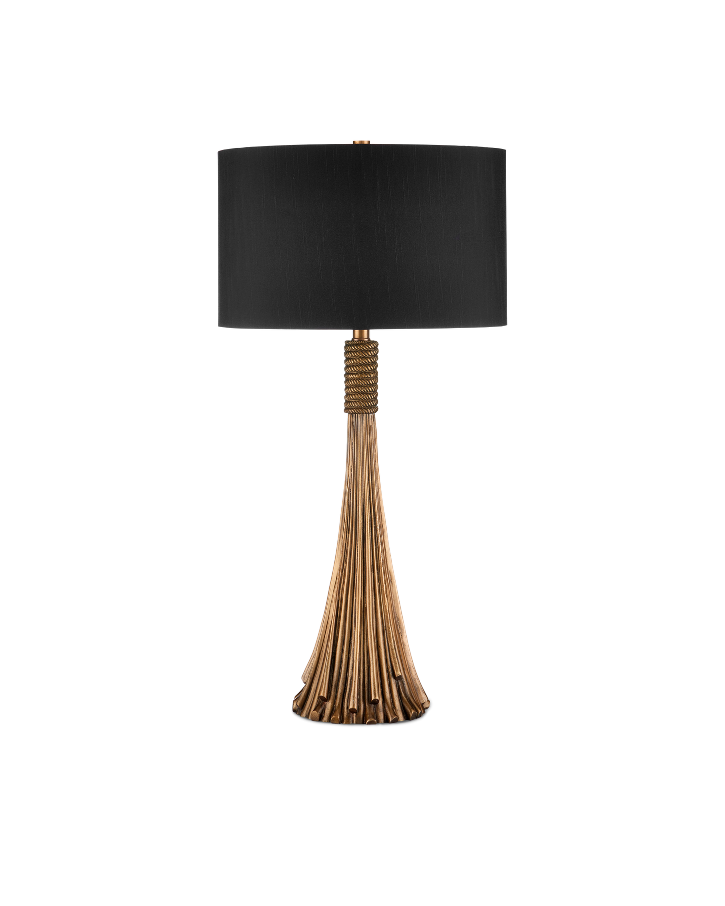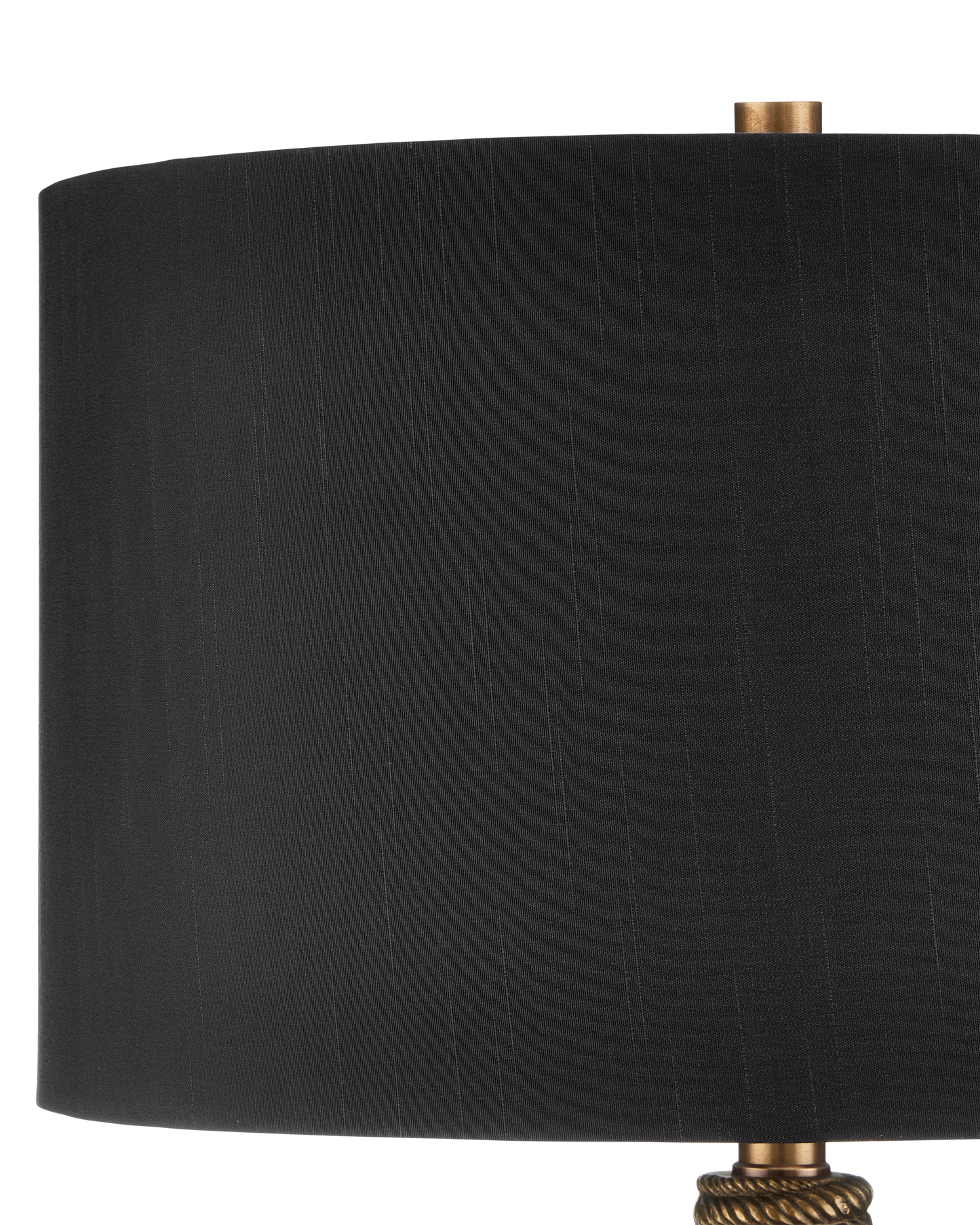 A beautiful representation of an interior ornamentation that rose to popularity during the early 17th century, the Baroque Table Lamp is shaped like a luxurious tassel. The convincing sense of movement it reflects is all the more impressive because it is made of aluminum. An antique brass finish and the black shade make their own statements within this luxe composition.