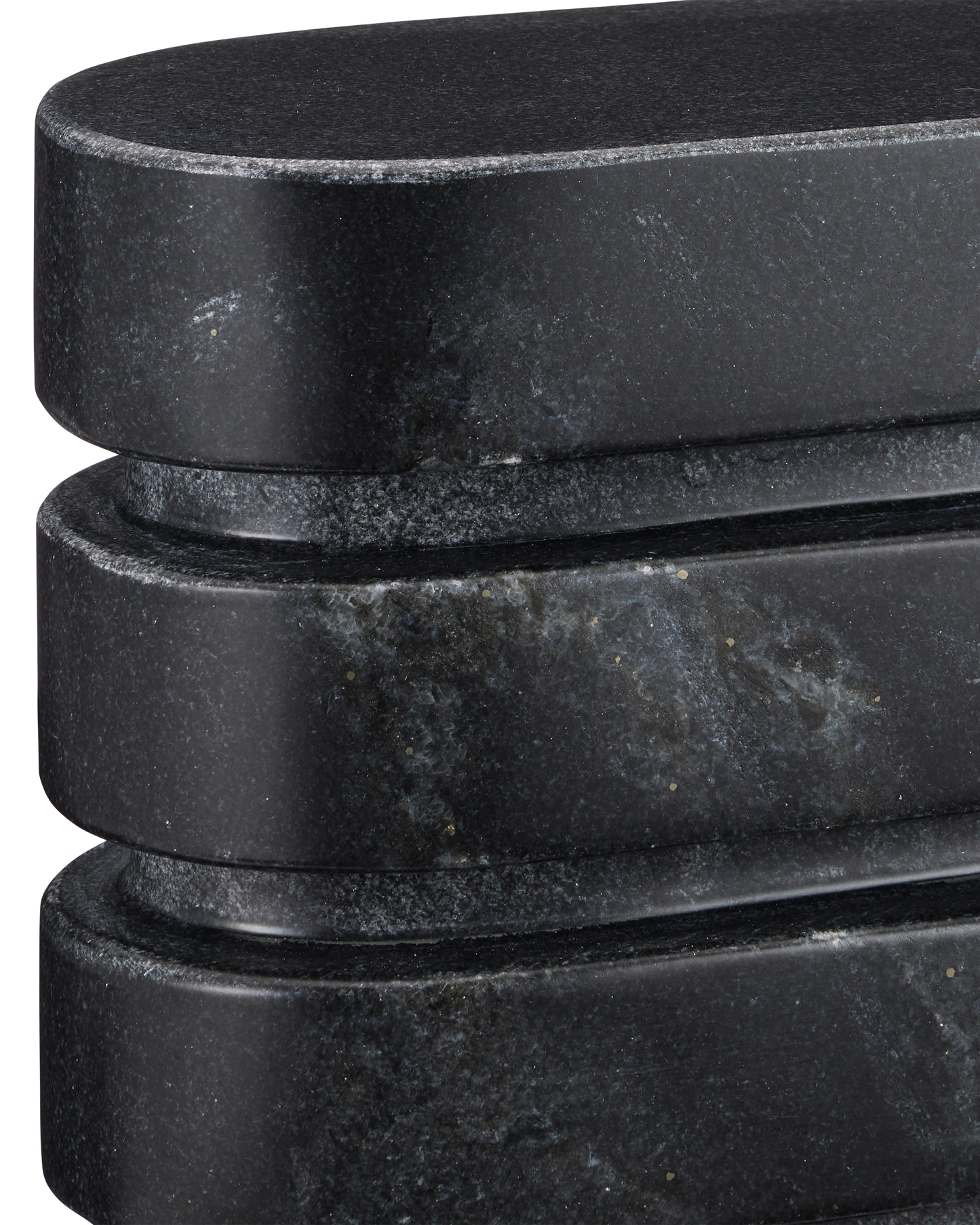 The Bheslana Marble Black Object Set includes two sculptures made of their namesake stone to bring the pieces subtle hints of patina. The veining that creates personality on the outer surfaces makes each of the decorative accessories unique. Rather brutalist in style, these are perfect decorative objects for contemporary interiors.