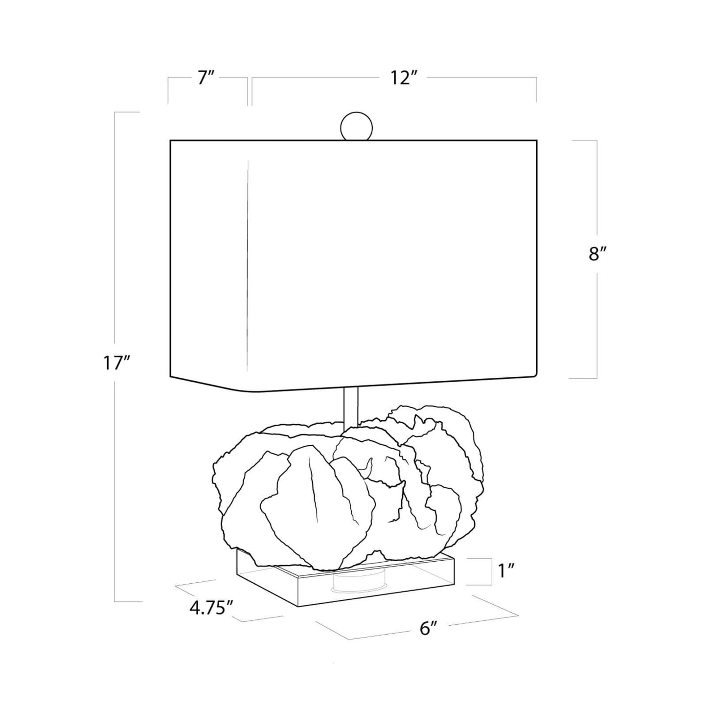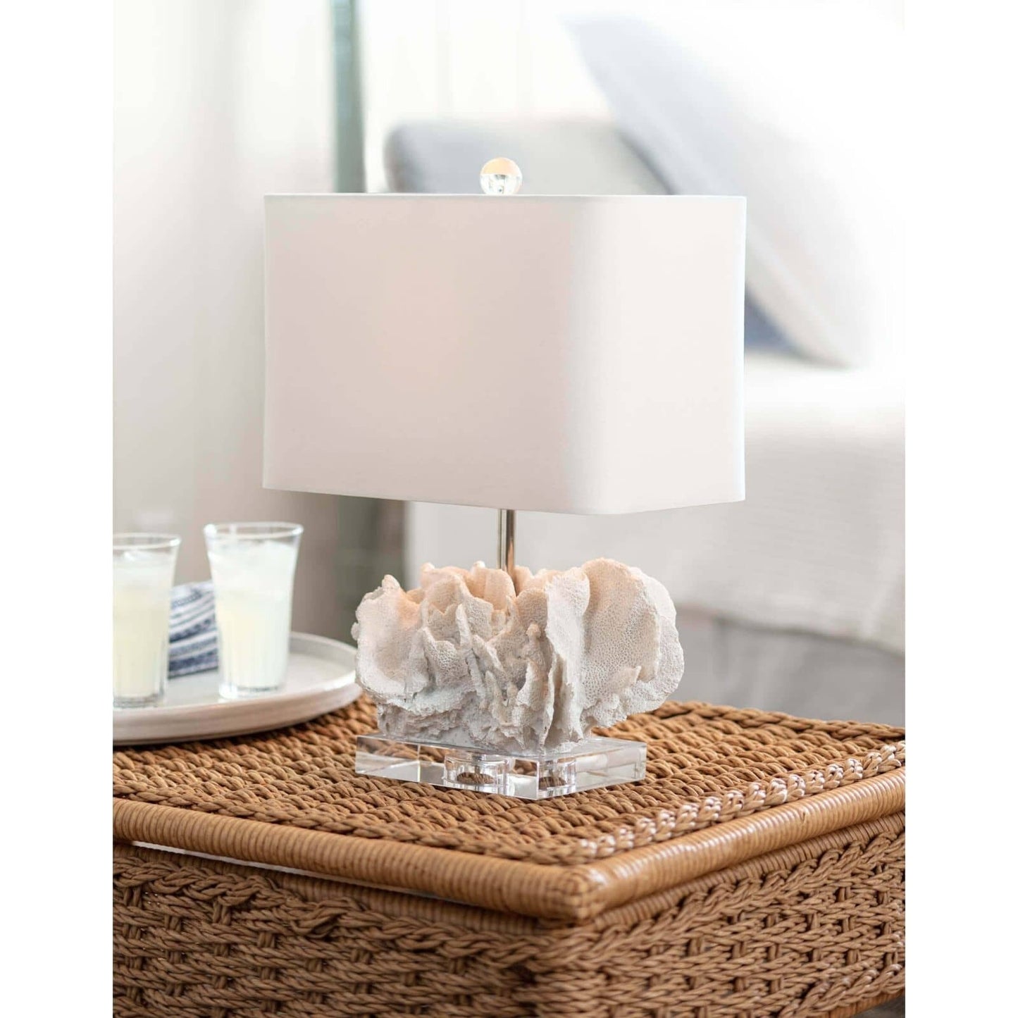 An eco-conscious alternative to endangered natural coral, our reproduction white coral lamp is complemented by a crystal base and crisp natural linen shade. This lamp features a pleasing contrast between simple and organic.
