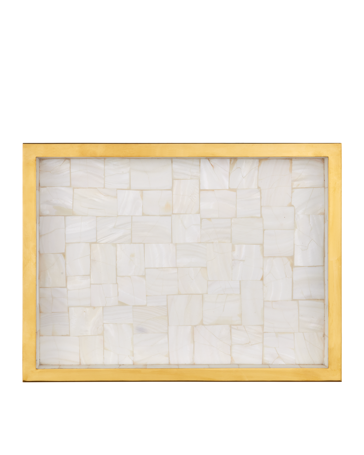 The luxuriousness of mother-of-pearl has been prized in interiors through the ages and the Casey Mother of Pearl Tray Set -- a pair of nesting decorative trays -- is a fine example of the artisanship that has given the material lasting appeal. Made of wood, the trays' crisp ivory surfaces are rimmed in rich gold on the tops and bottom of the sides. These trays are not food safe and not heat- or cold-resistant.