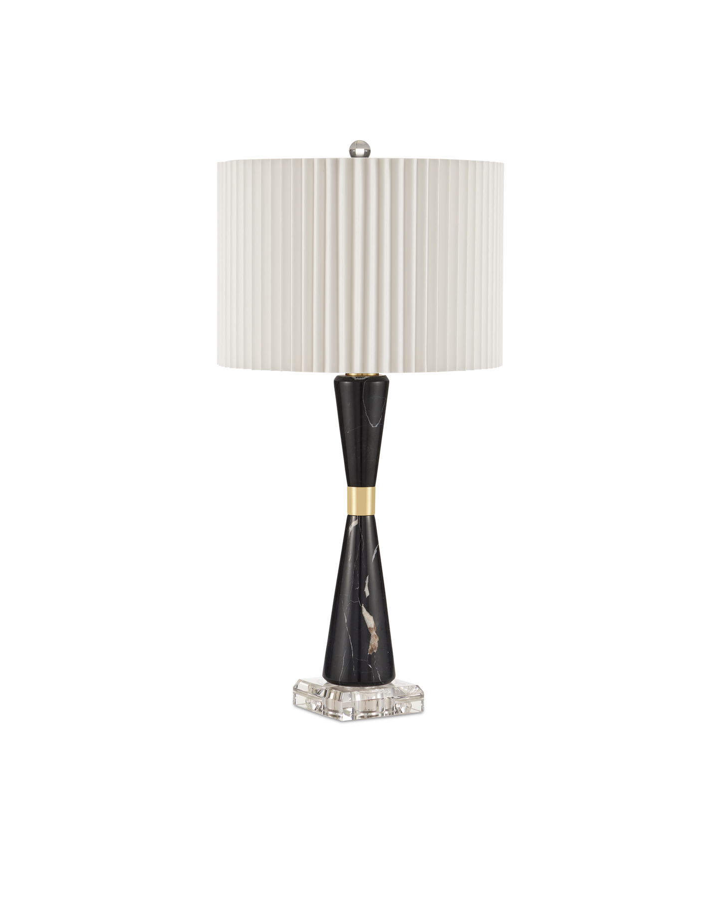 The contemporary shape of the Edelmar Table Lamp is sleek, but the mix of materials composing it is complex. The body is made of black marble cinched in the middle by a brass ring that rises from an optic crystal base. Adding to the intricacy of the design is the knife-pleated off-white shantung shade. An optic crystal finial completes the overall composition.