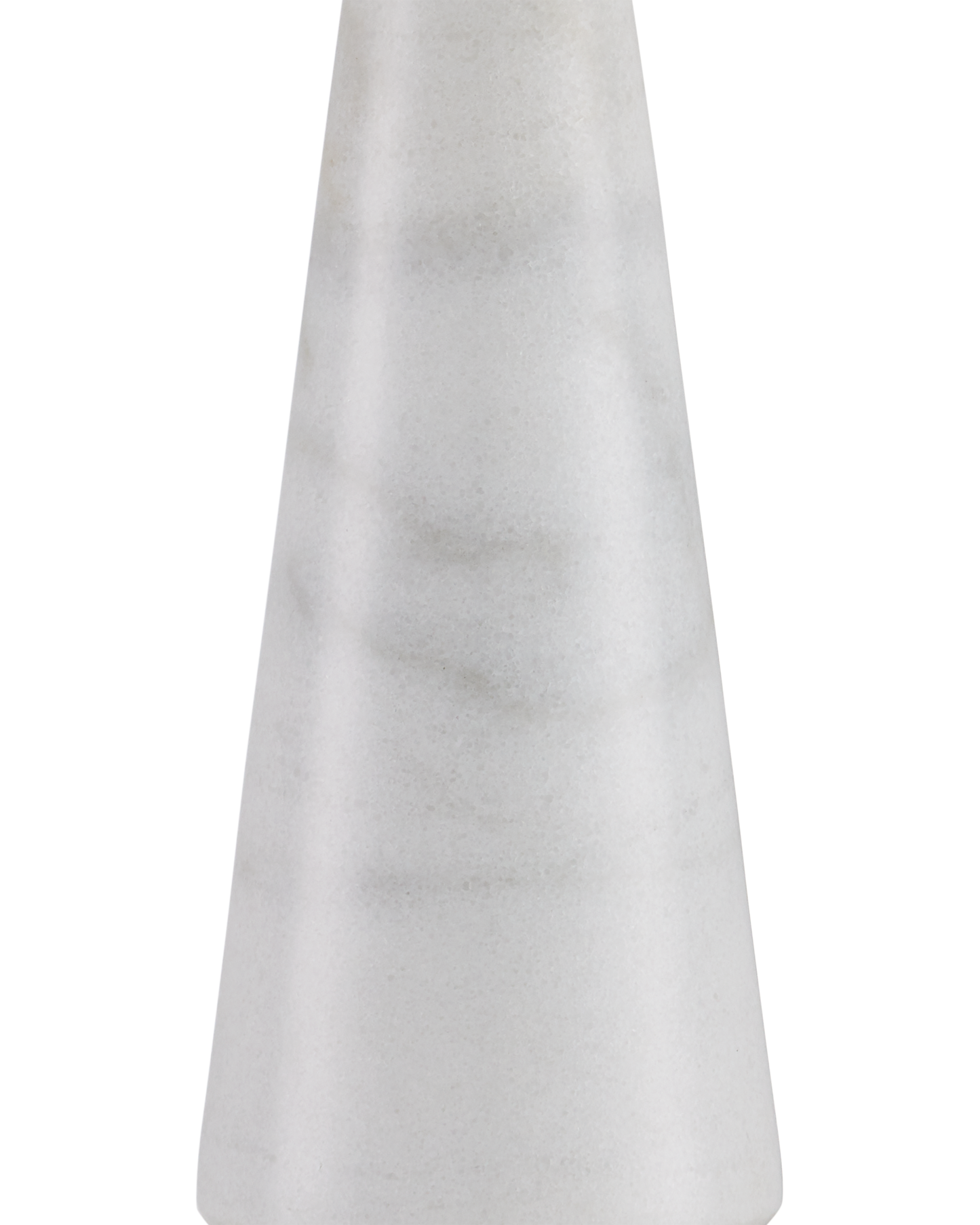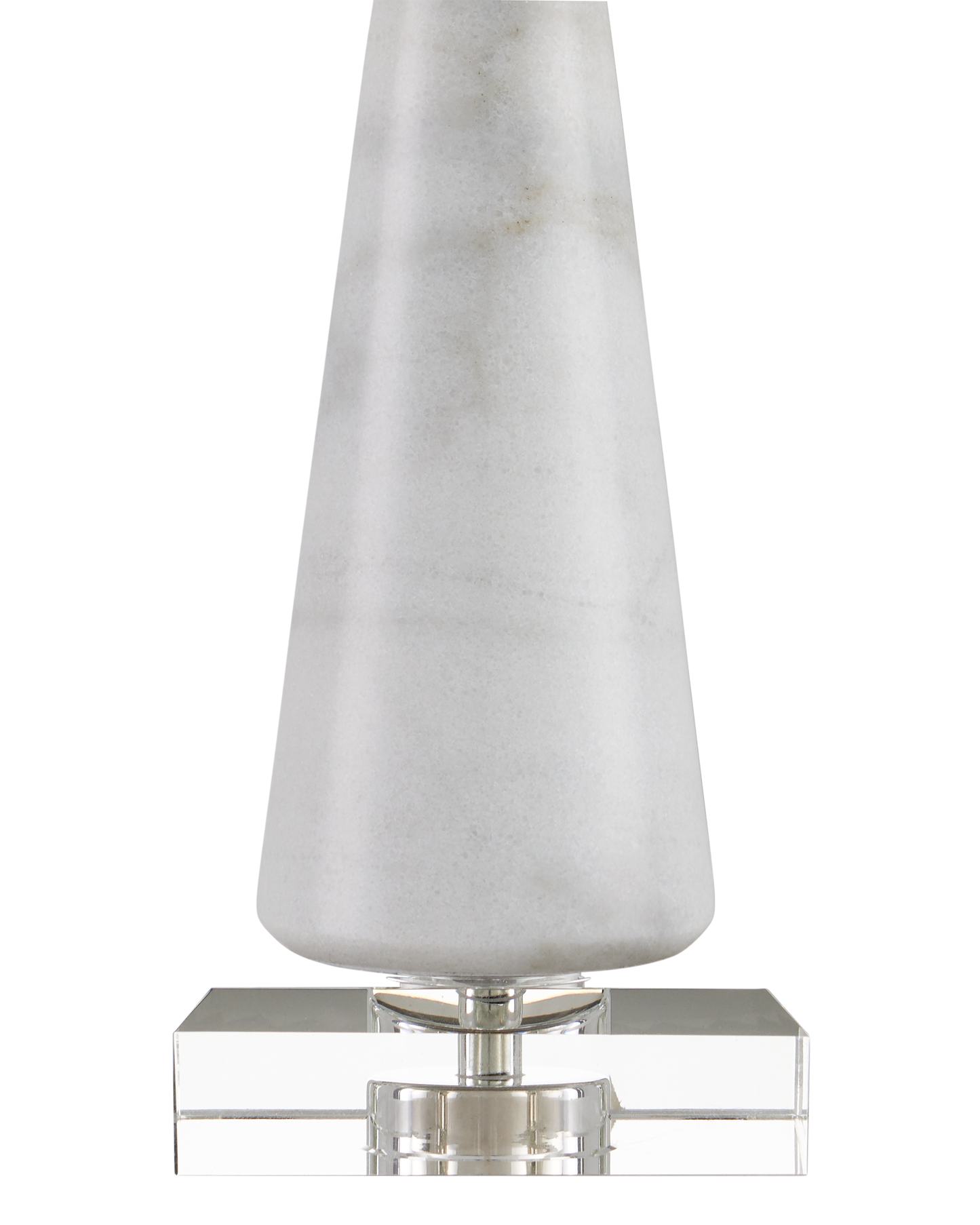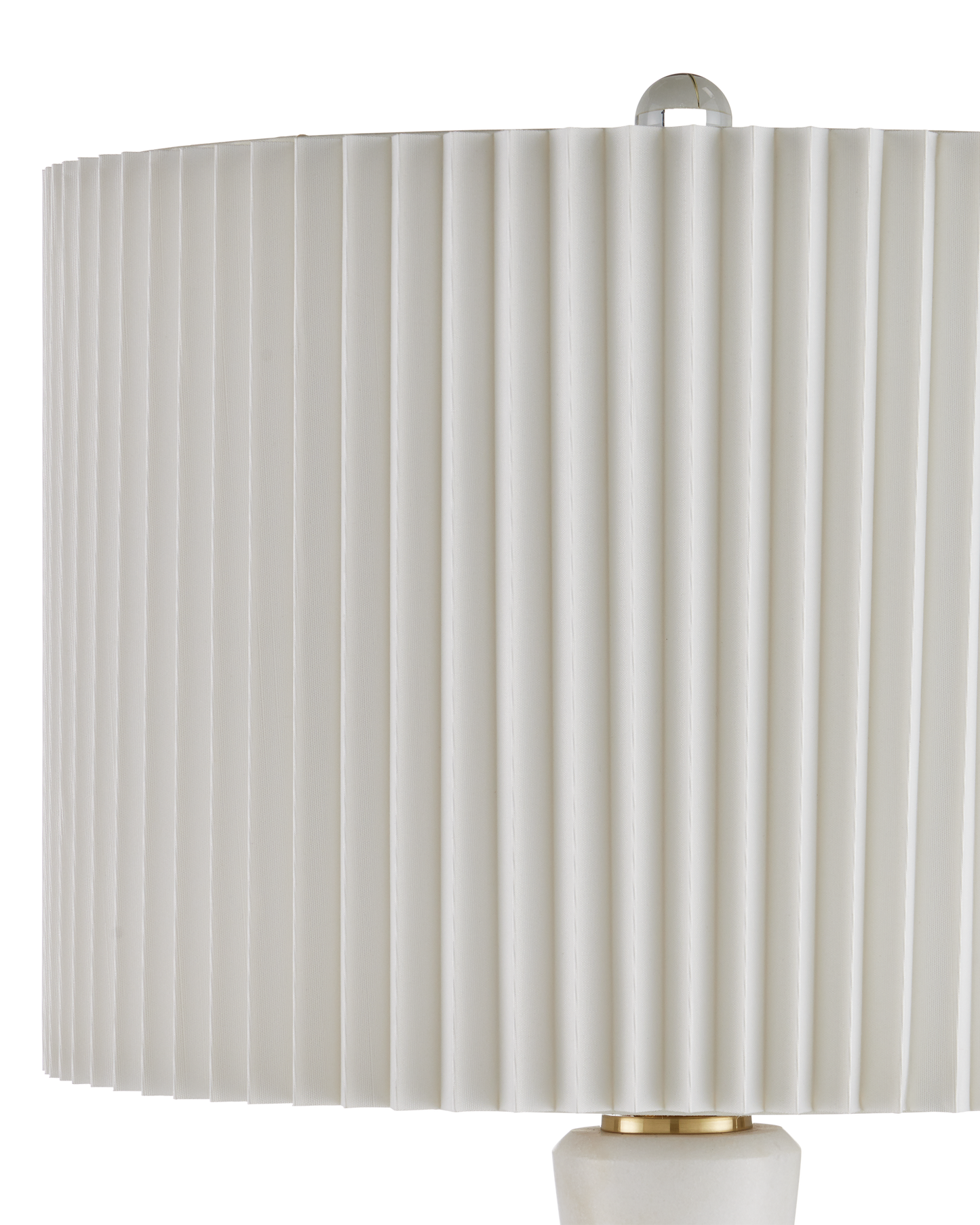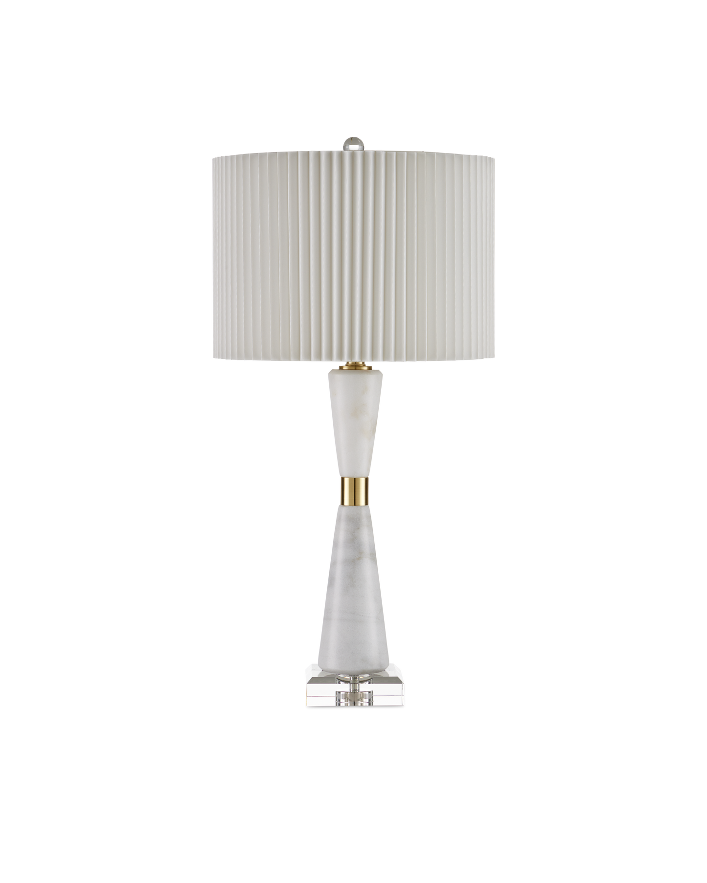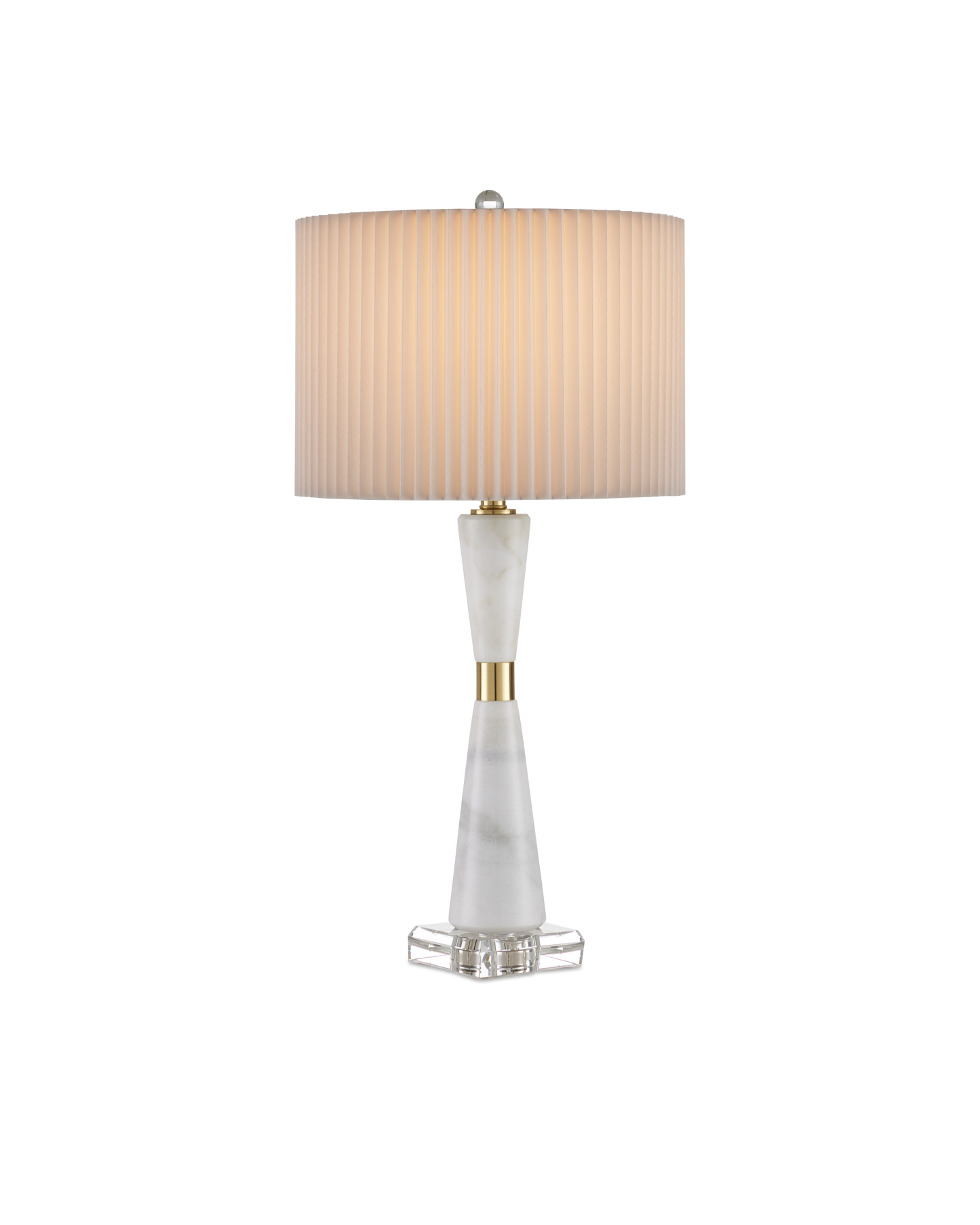 The contemporary shape of the Edelmar White Table Lamp is sleek, while the mix of materials composing it is complex. The body made of white marble cinched in the middle by a brass ring that rises from an optic crystal base. Adding to the intricacy of the design is the knife-pleated off-white shantung shade. An optic crystal finial completes the overall composition.