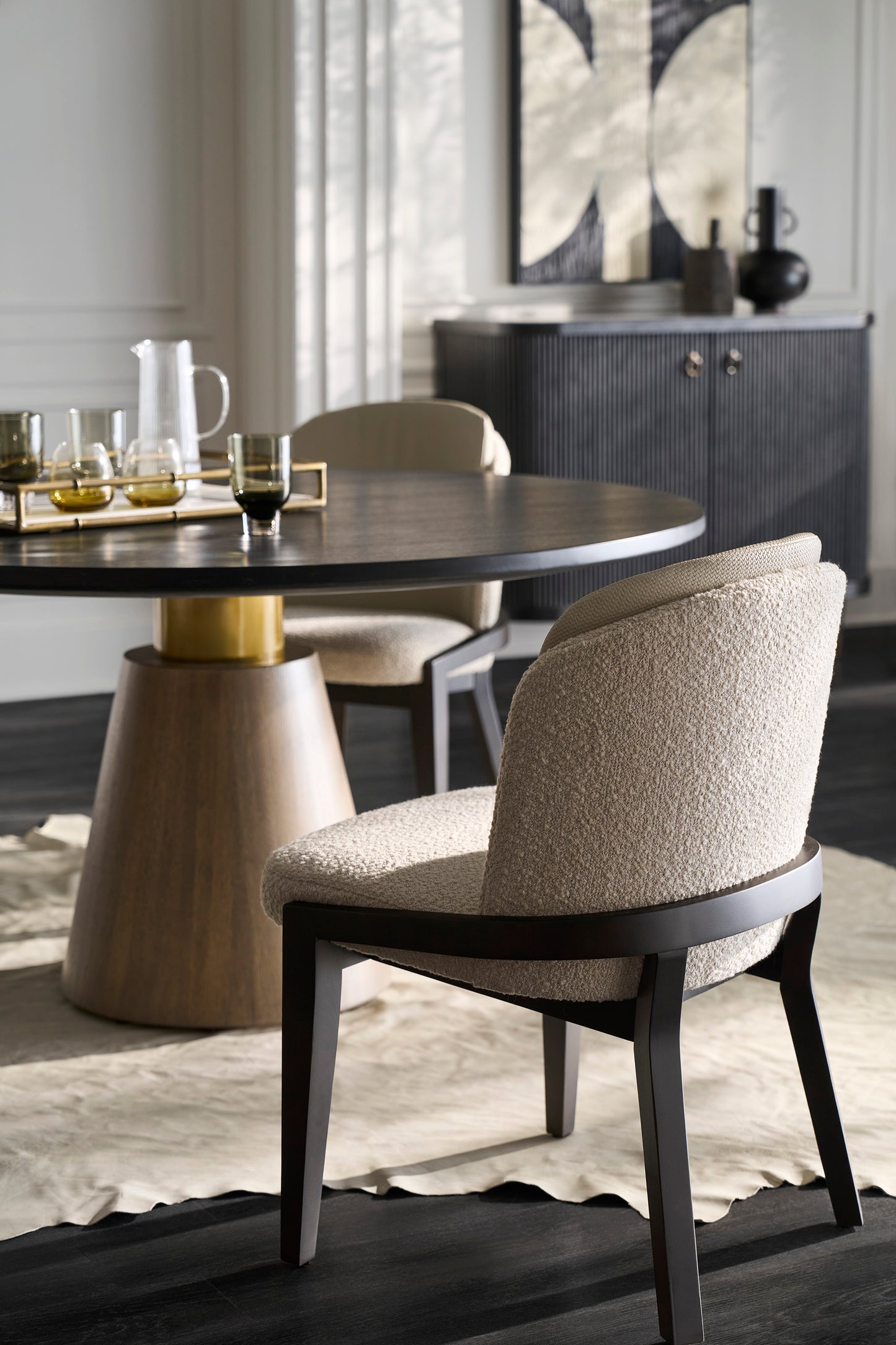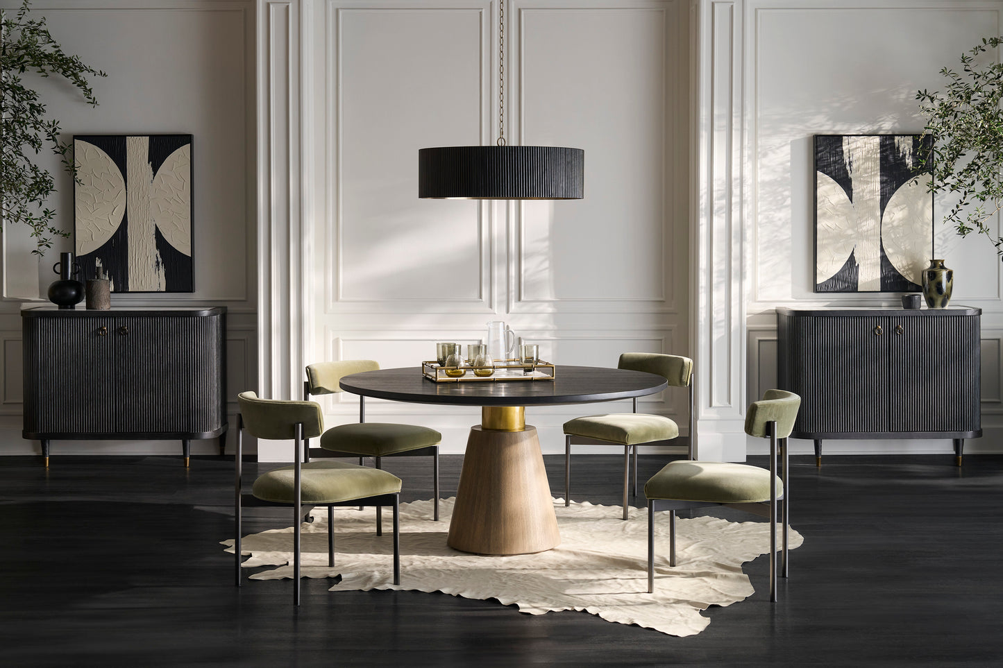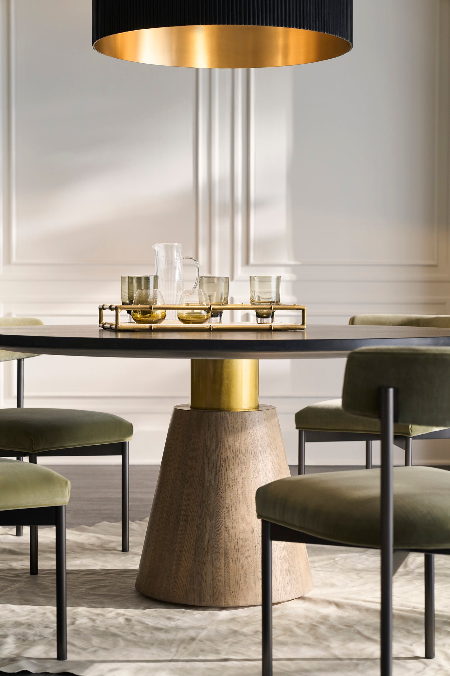 Regular price $4,043.25A bold blend of natural wood, deep charcoal top, and brass detailing, this round dining table makes a sleek, sculptural statement in any space.