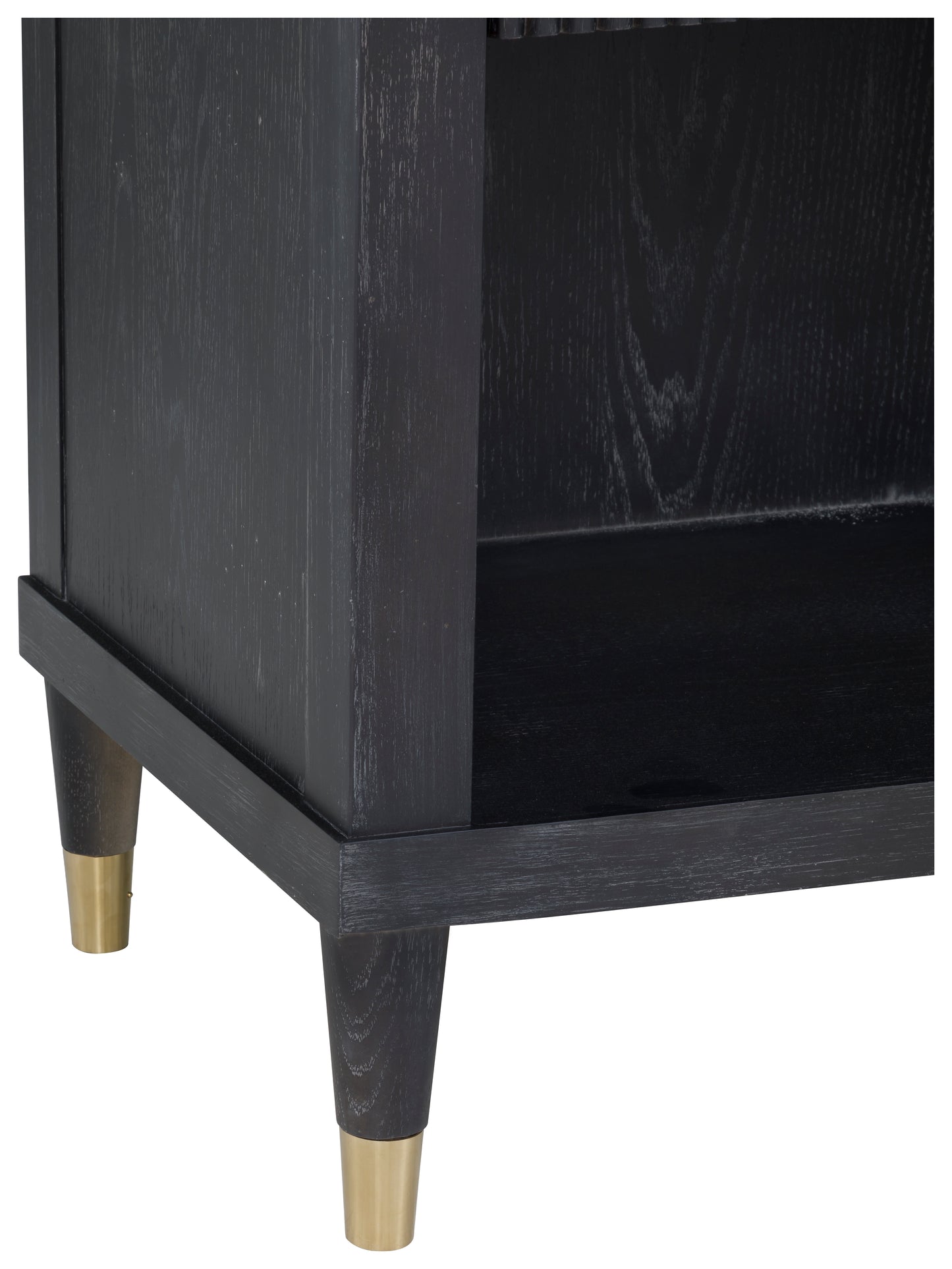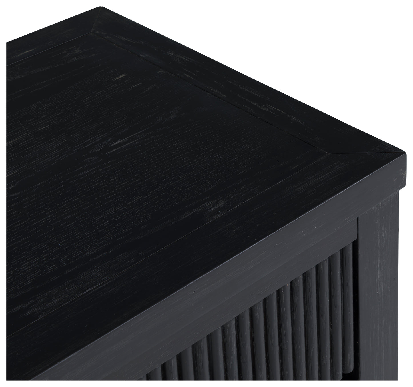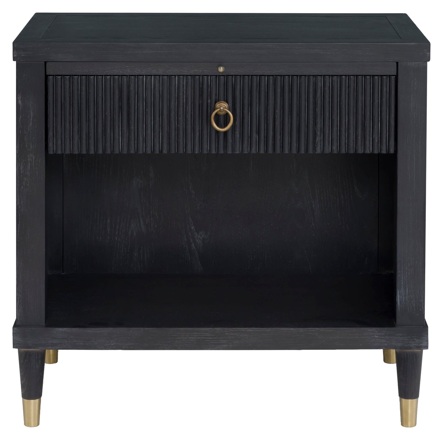Regular price $1,131.75A bold bedroom essential featuring fluted drawer detailing, open shelf storage, and brass hardware, all finished in a rich charcoal tone.