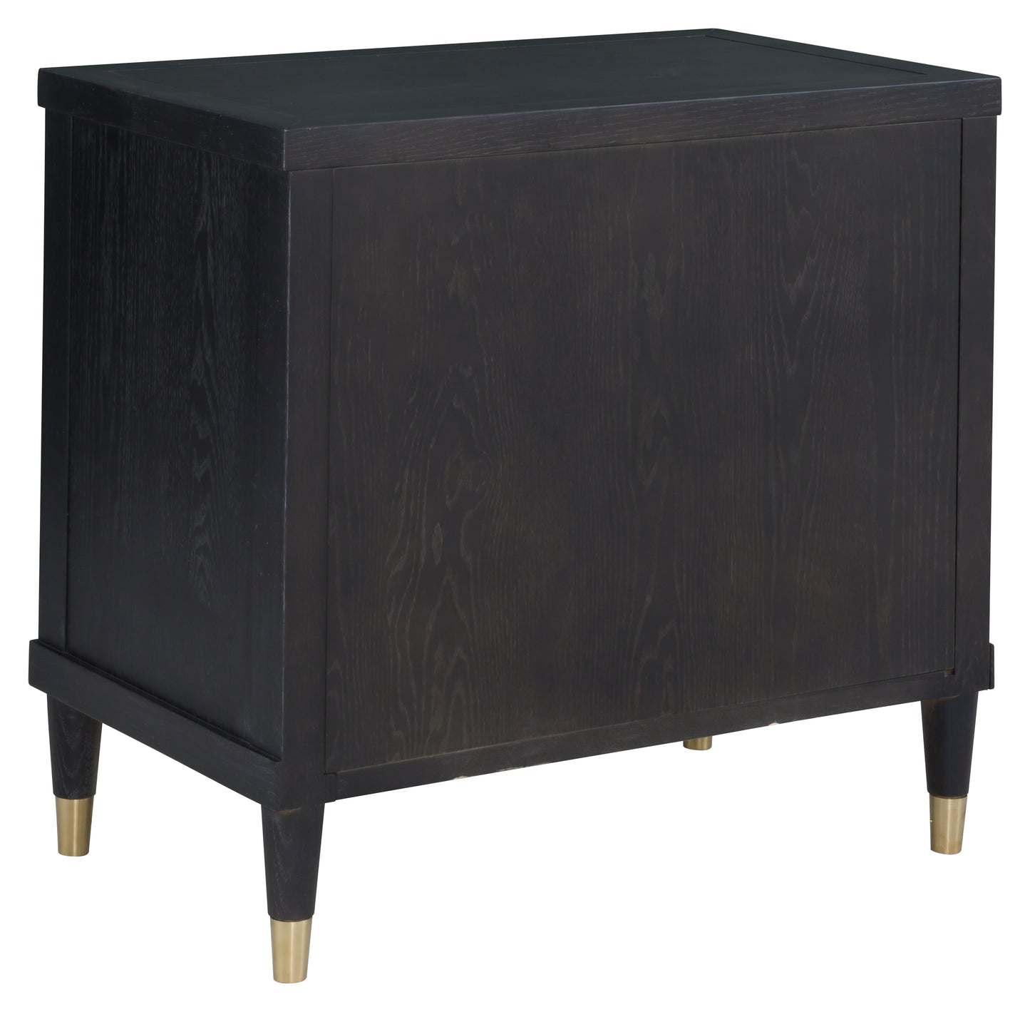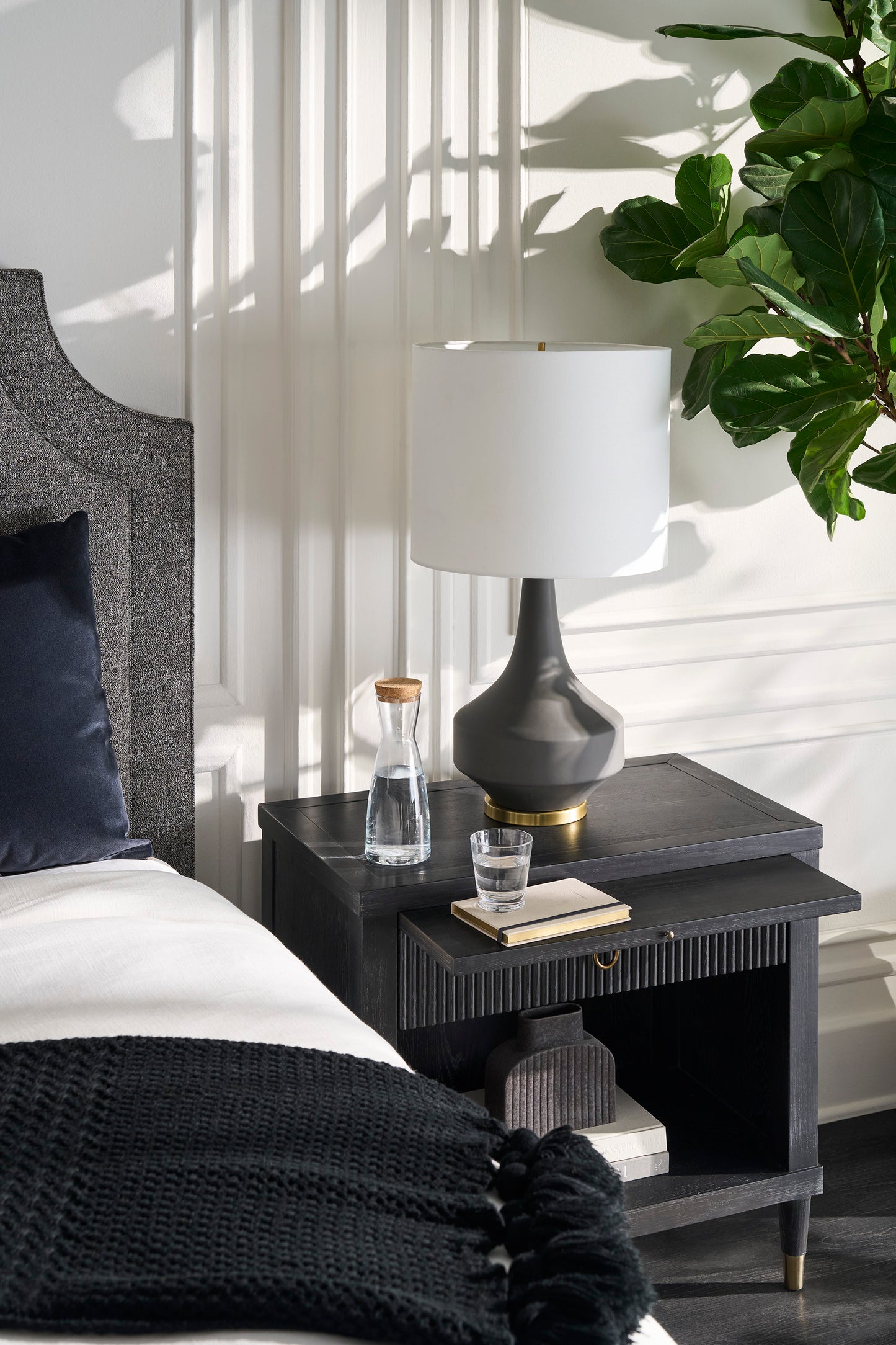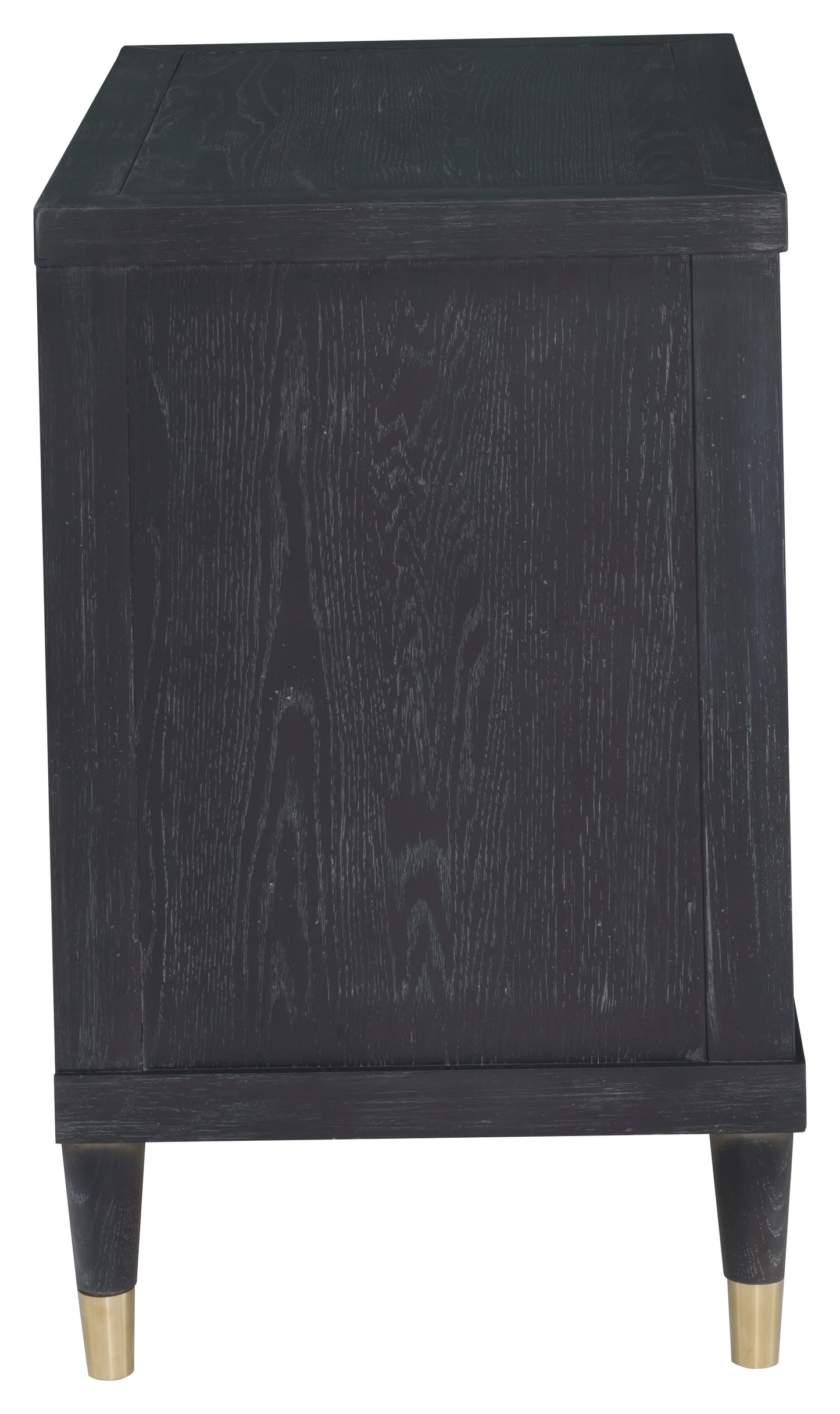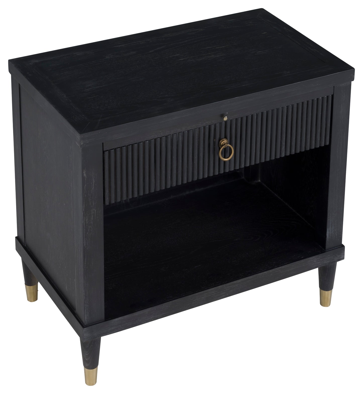 Regular price $1,131.75A bold bedroom essential featuring fluted drawer detailing, open shelf storage, and brass hardware, all finished in a rich charcoal tone.