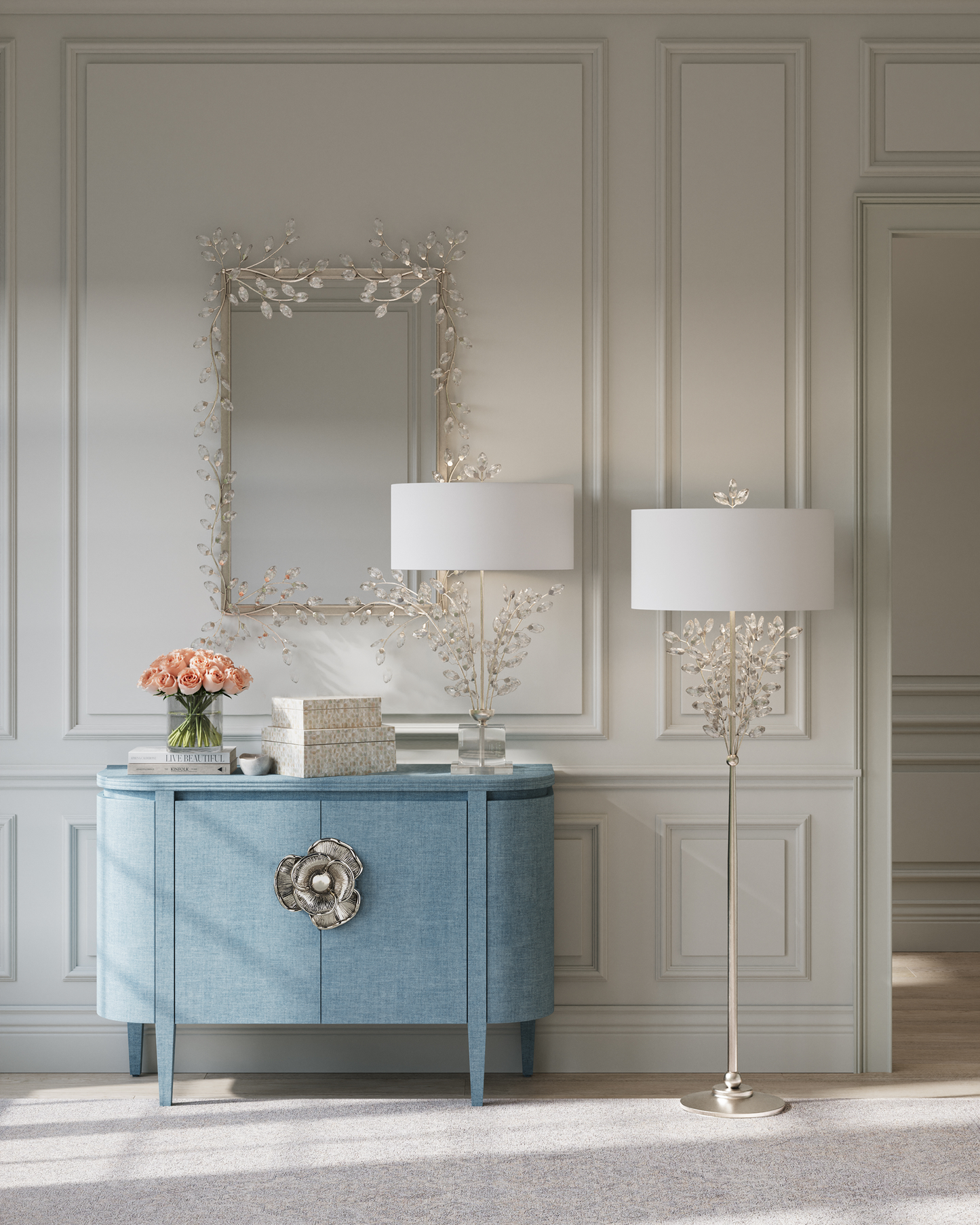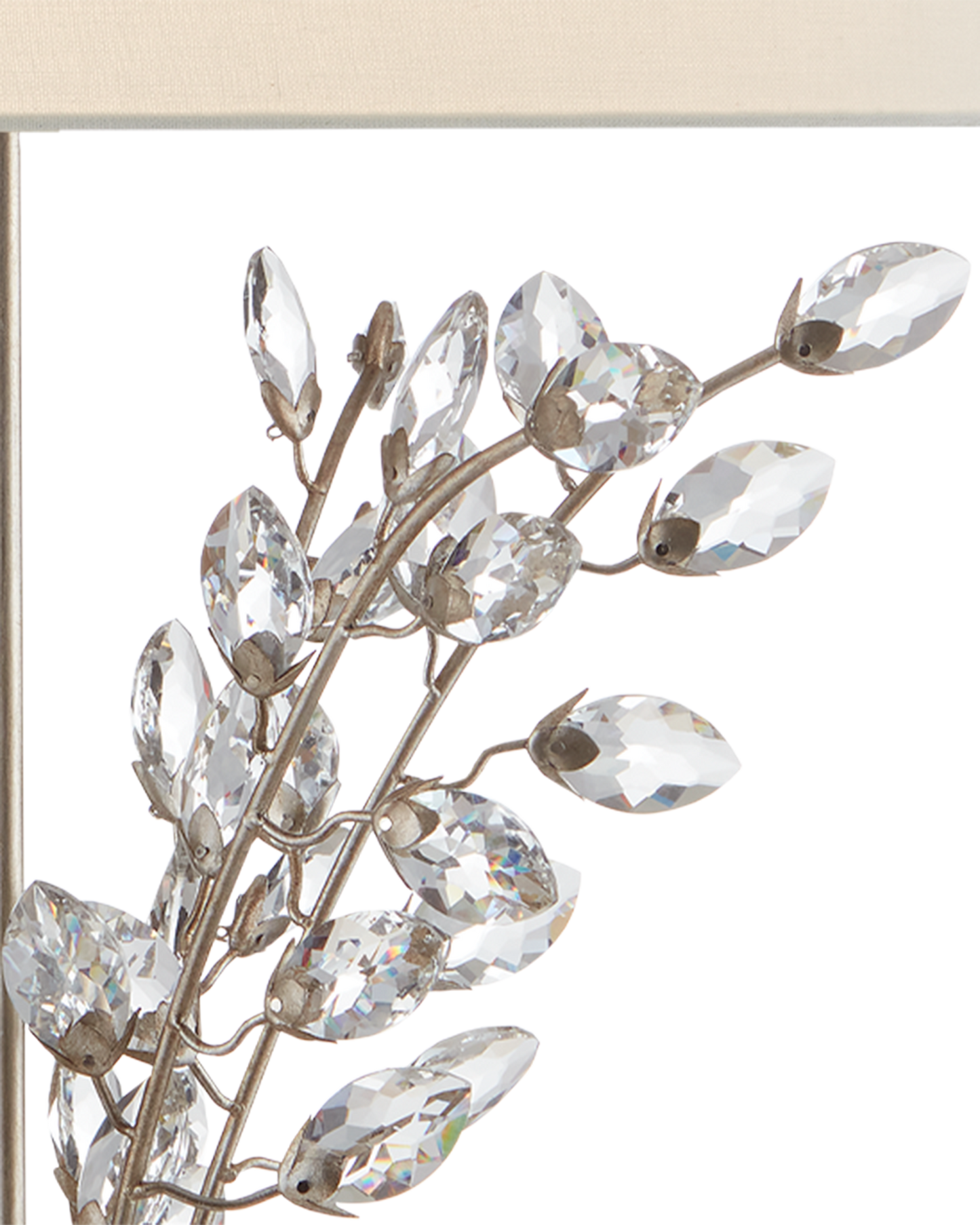 Joining the Forget-Me-Not Table Lamp in gold leaf finish and a black shade is the Forget-Me-Not Silver Table Lamp with gleaming silver leaf-finished stems that hold luxuriant beveled optic crystal buds. Other notable details on this crystal lamp include a crystal finial and stacked base, and a white drum shade in perfect proportion to the spray of crystals. These luminous lamps are beautifully crafted to enhance any space.