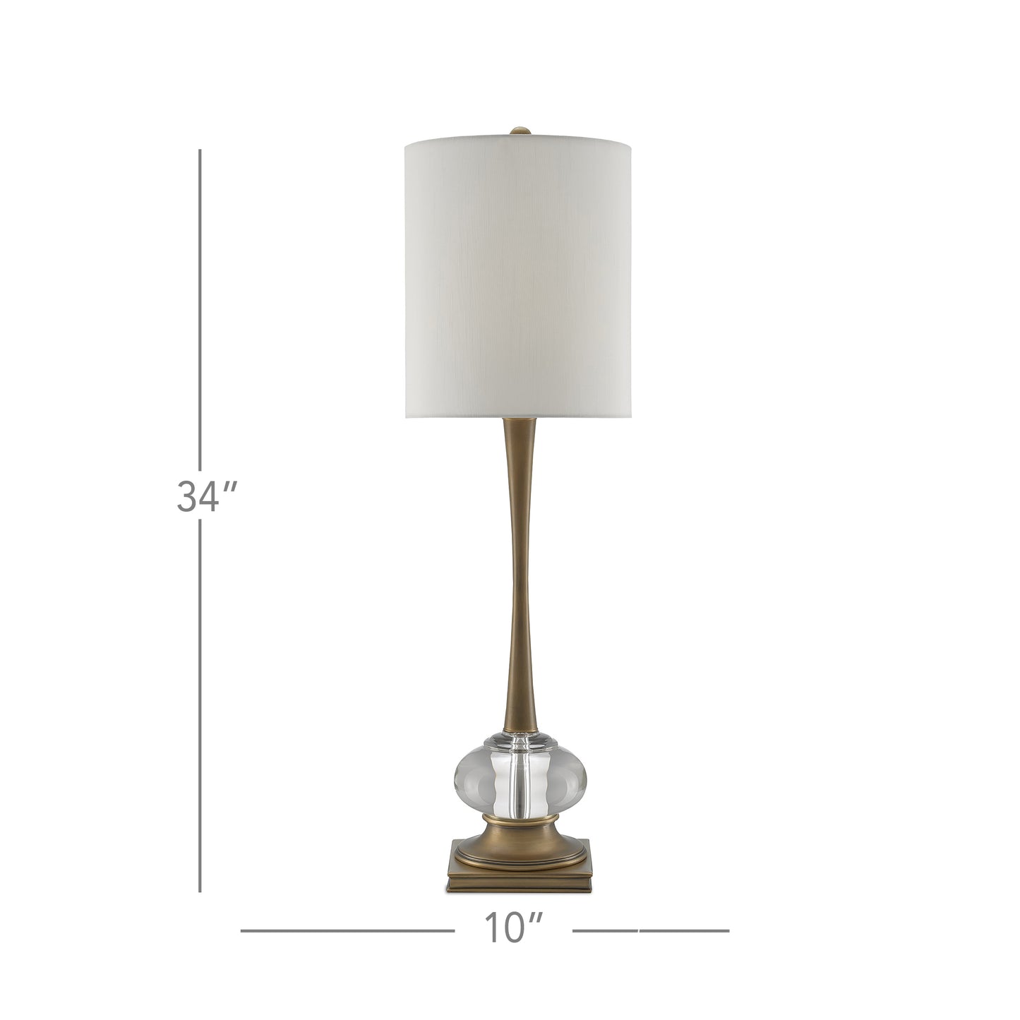 The Giovanna Table Lamp has an optic crystal ball nestled between an artful brass base and elongated stem, both in an antique brass finish. The design of this gold lamp fitted with an off-white cylindrical shade recalls the mid-century modern era.