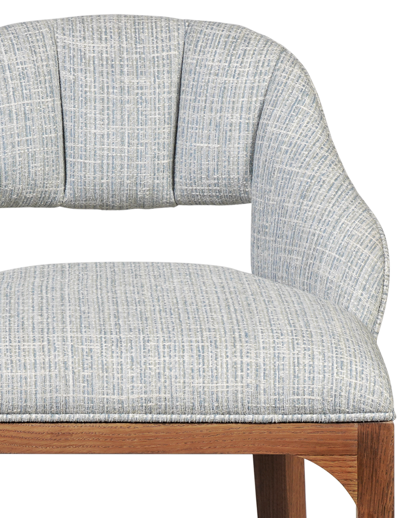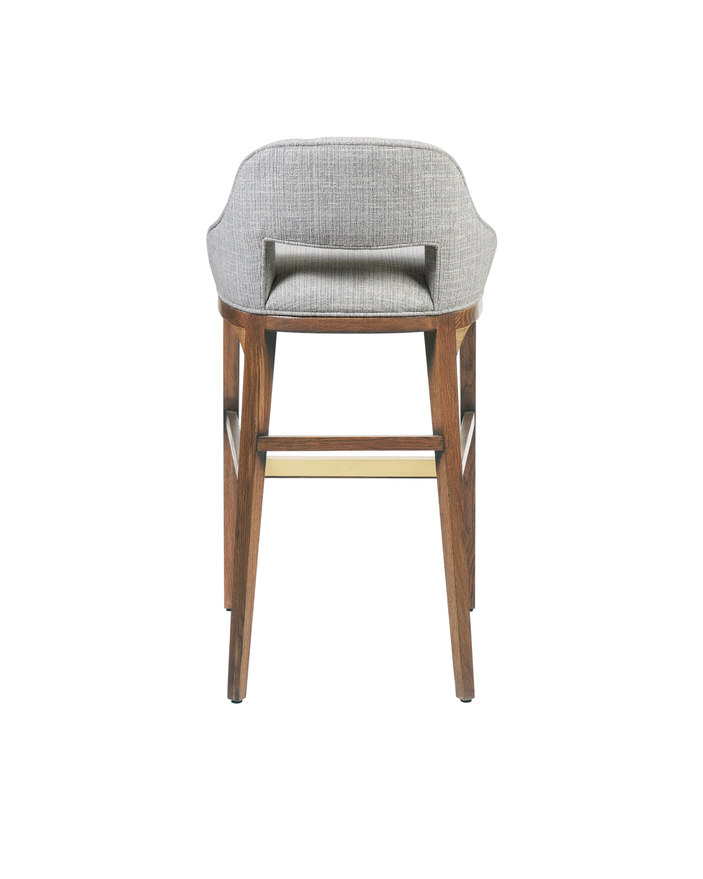 The Inga Bar Stool covered in a Greenlight Powder fabric has an upholstered back and seat that sits nimbly atop a solid oak frame in a morel brown finish. The paleness of the fabric and the warmth of the wood create a soft contrast, while the brass kick-plate brings a bit of brightness to the design.