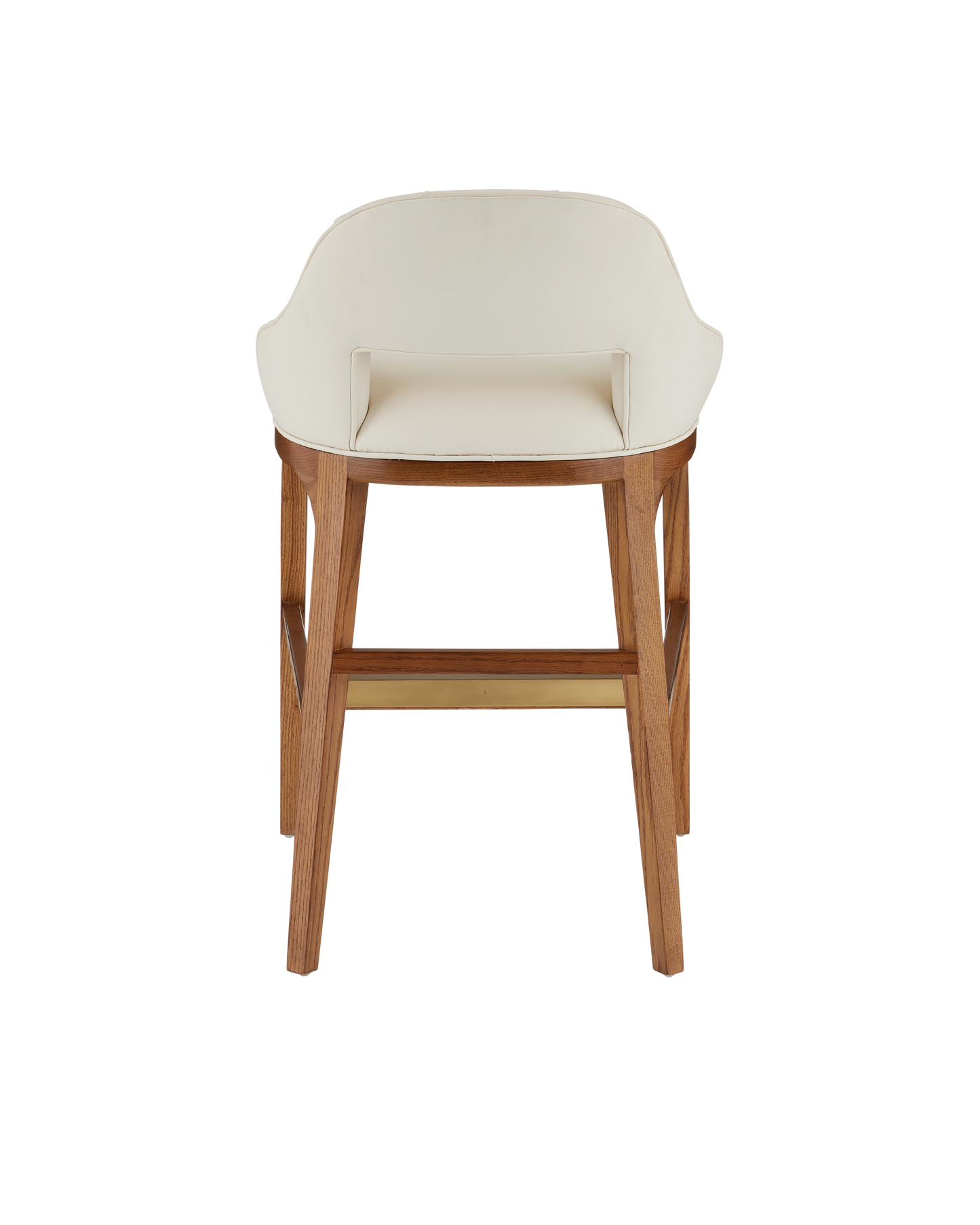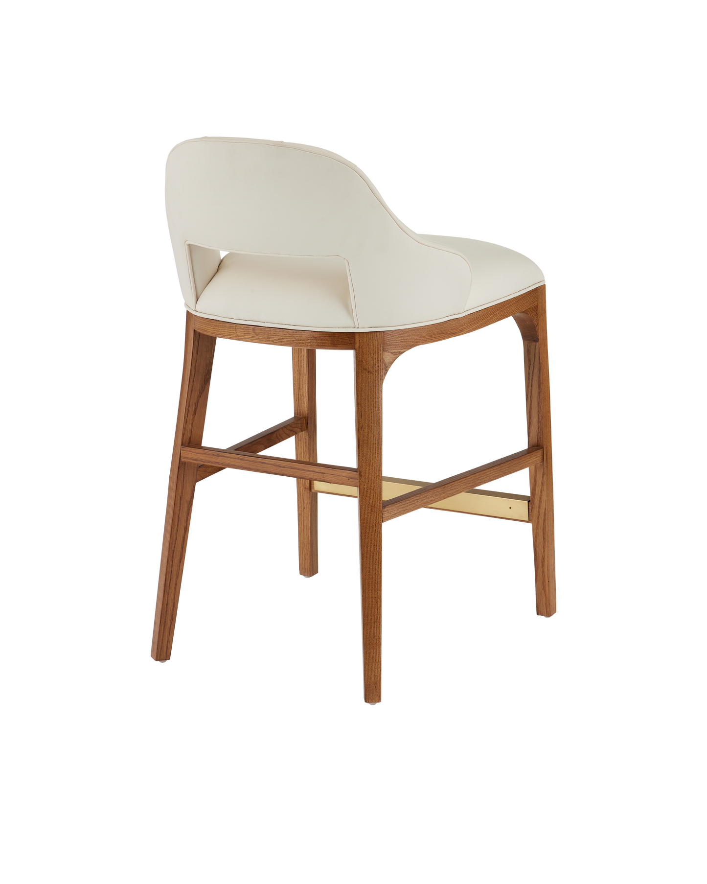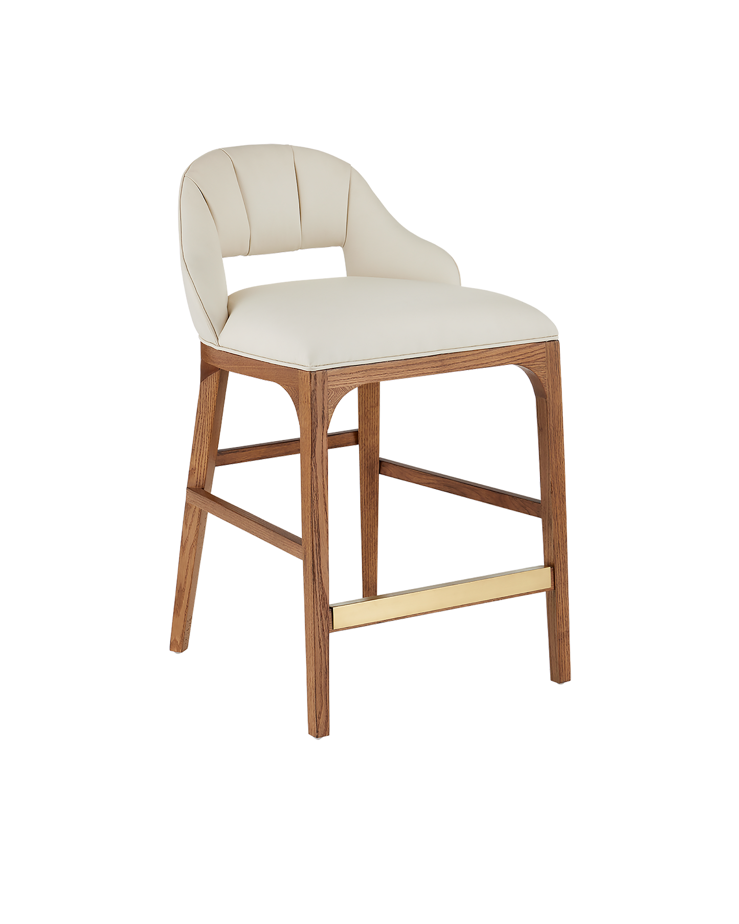 The Inga Counter Stool, covered in Endurance Sand fabric, has an upholstered back and seat that sits nimbly atop a solid white-oak frame in a morel brown finish. The paleness of the fabric and the warmth of the wood are contrasting elements. A brass kick plate on the front rung in a brushed brass finish serves a purpose and brings a bit of brightness to the design.