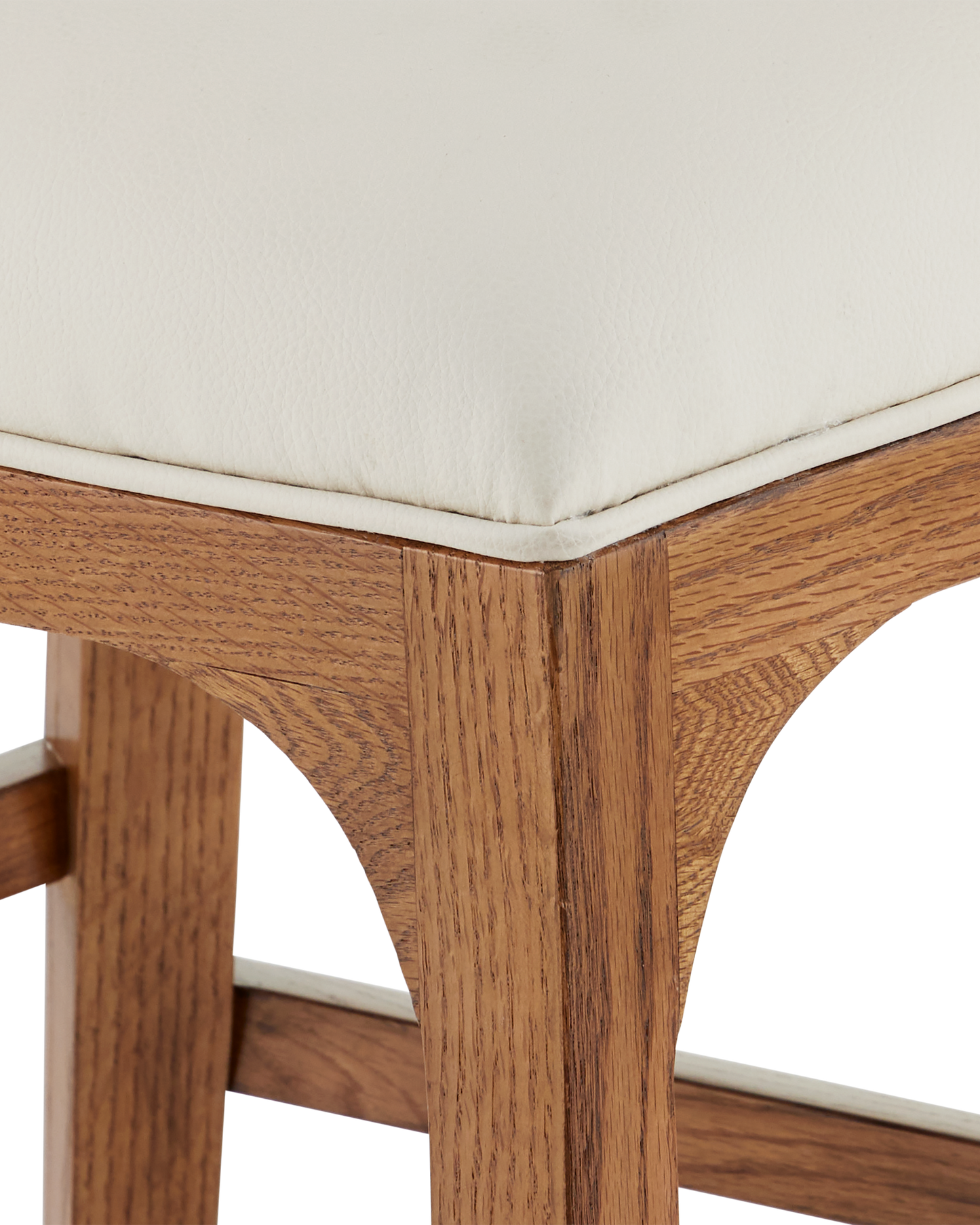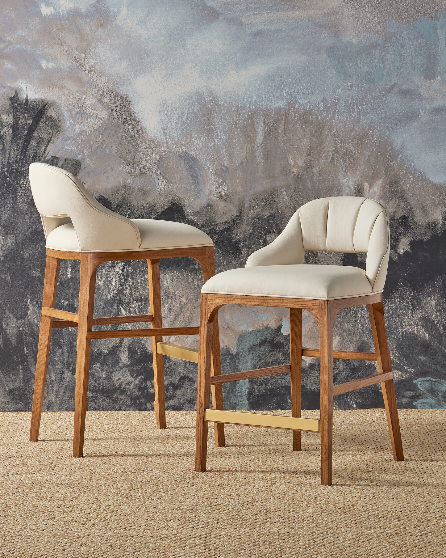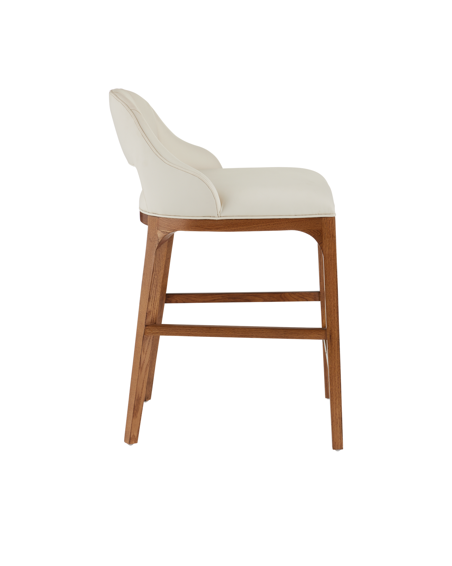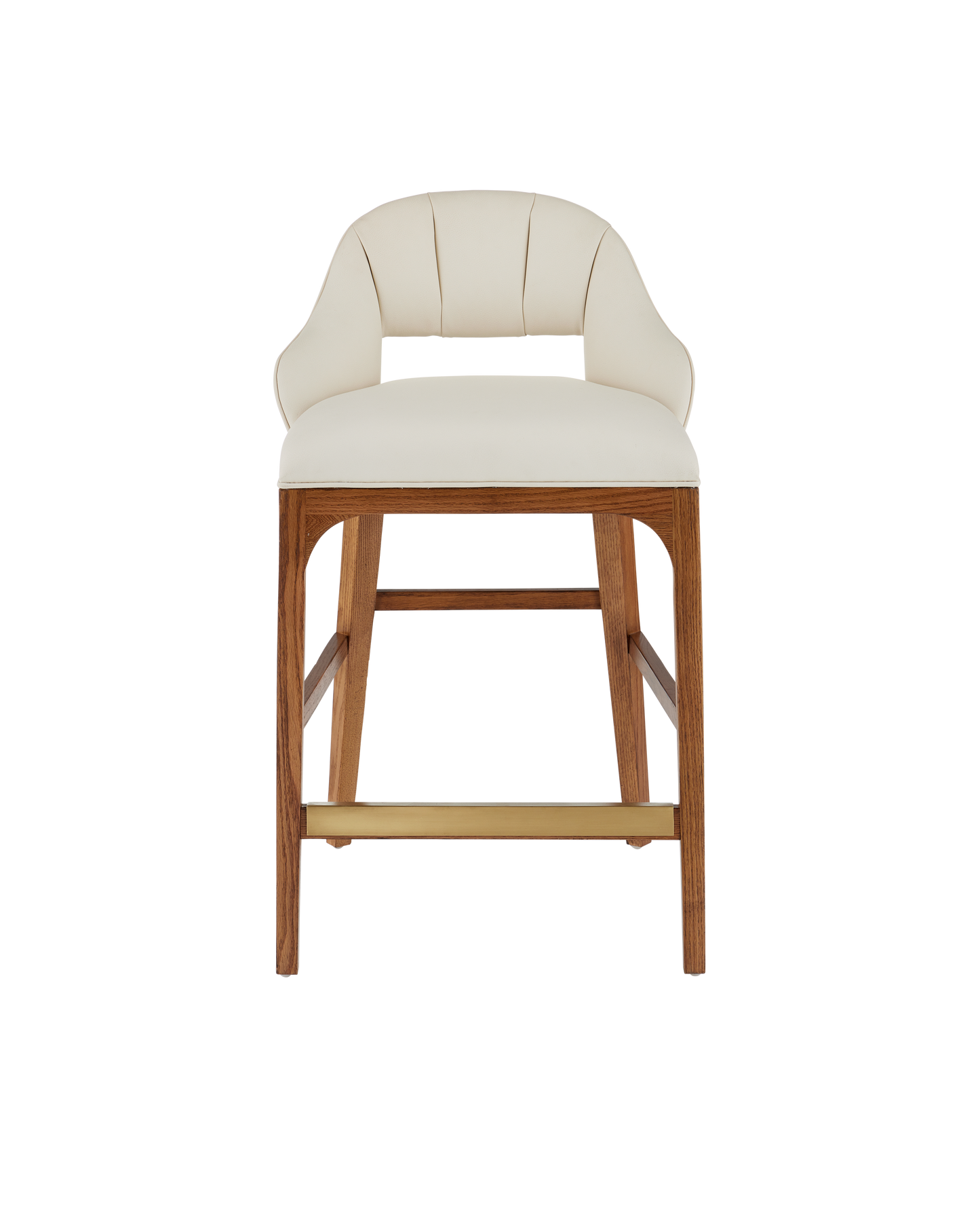 The Inga Counter Stool, covered in Endurance Sand fabric, has an upholstered back and seat that sits nimbly atop a solid white-oak frame in a morel brown finish. The paleness of the fabric and the warmth of the wood are contrasting elements. A brass kick plate on the front rung in a brushed brass finish serves a purpose and brings a bit of brightness to the design.
