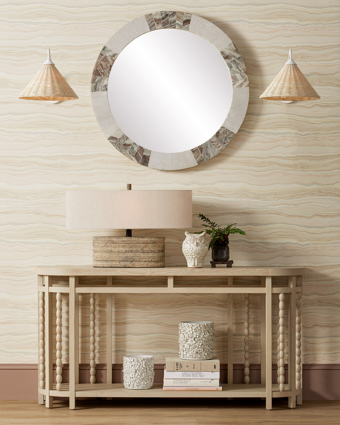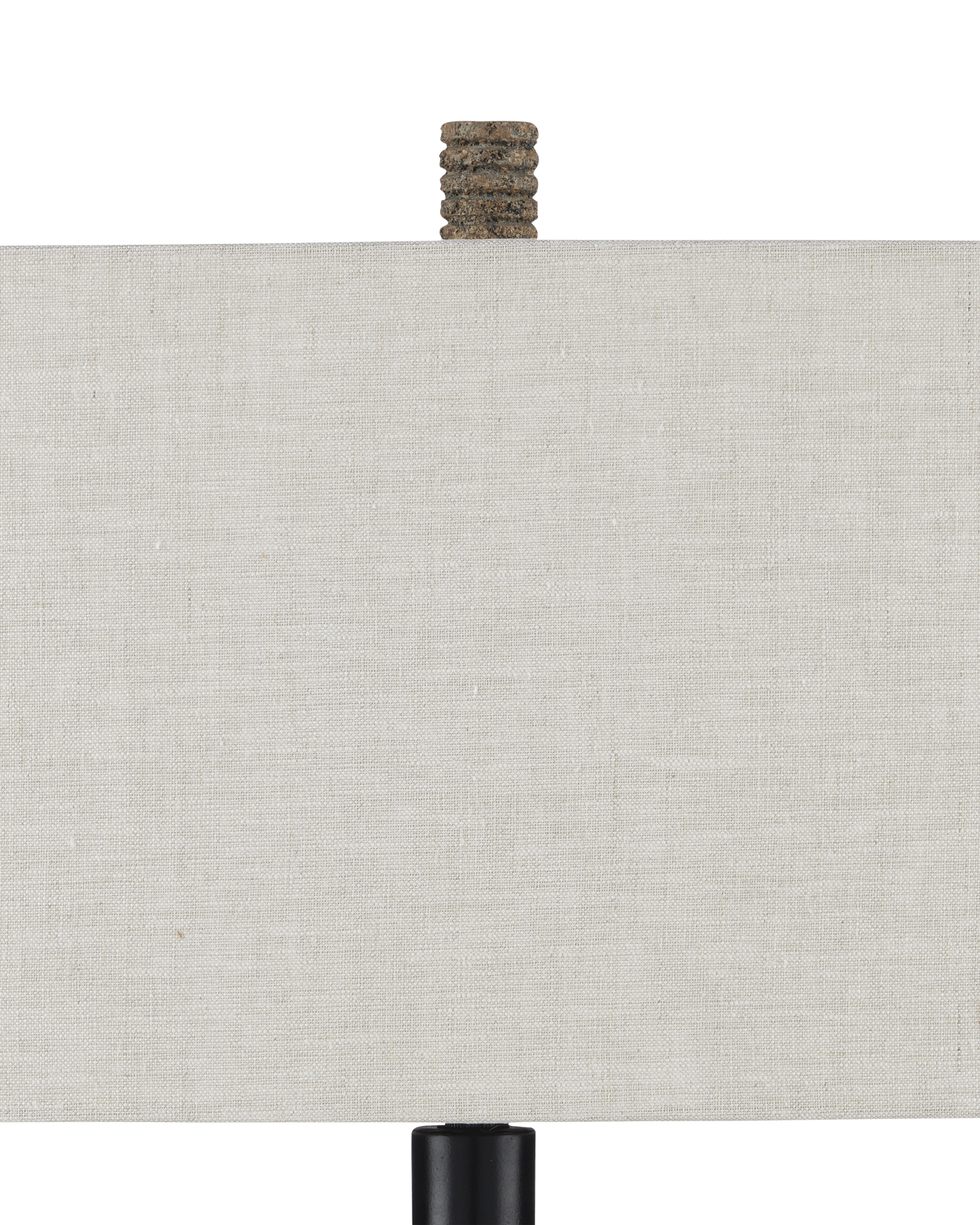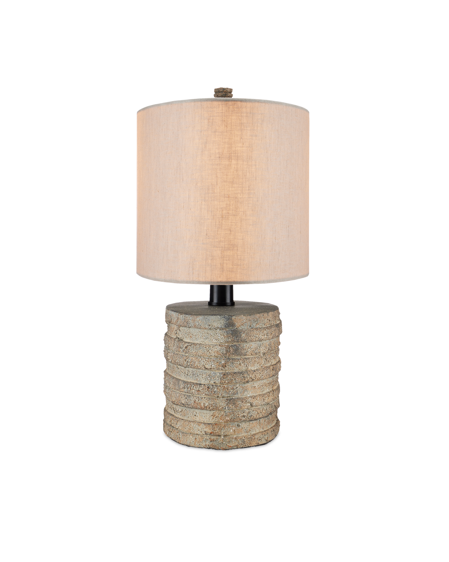 Flat discs of terracotta encircle a wrought iron spine on our Innkeeper Oval Table Lamp. The rustic feel of this natural material means it has subtle variations in color and texture that have been enhanced with a rustic granite finish. The gray table lamp is topped with a vanilla linen shade held in place by a matching terracotta finial. The scale of the elliptical shade is perfectly balanced with the smaller terracotta oval of its body.