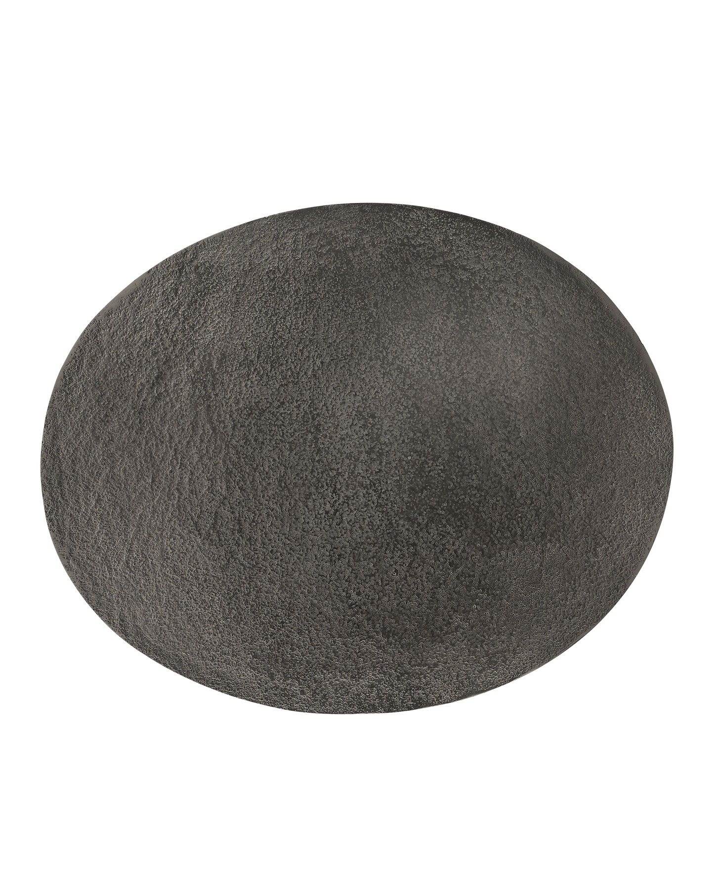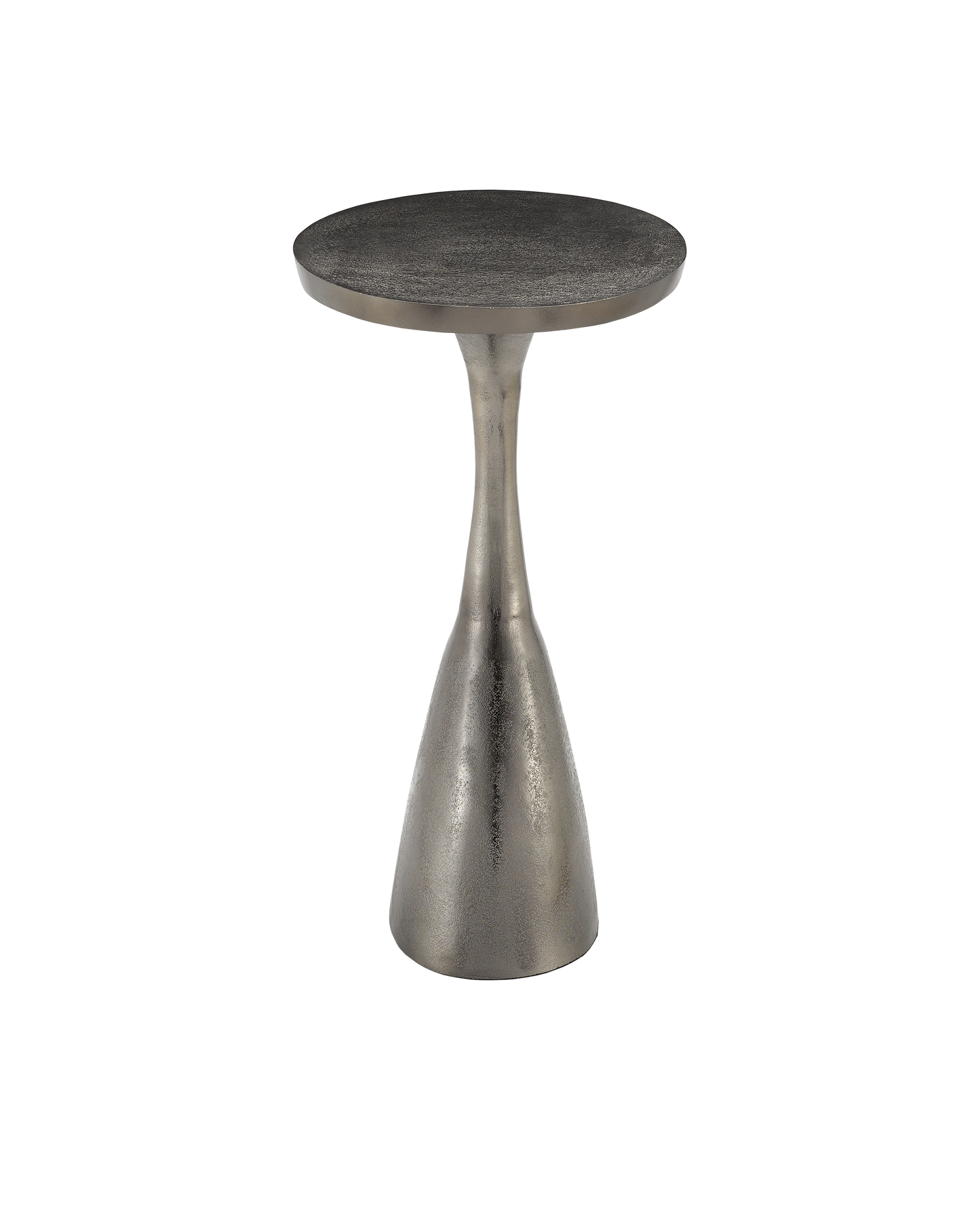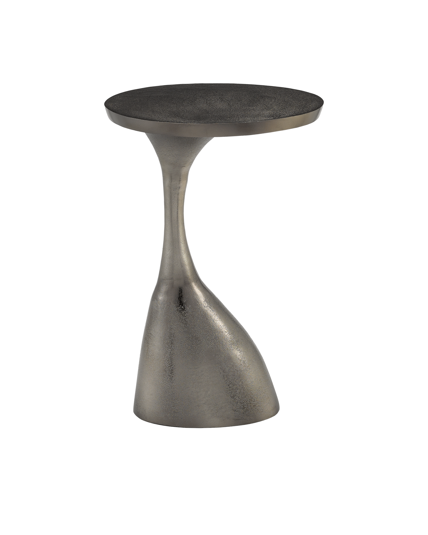 The Ishaan Black Accent Table lifts an oblong tray top on its organically shaped pedestal. The dark gray accent table is made of cast aluminum in a black nickel finish. It has a time-worn hint of patina thanks to our talented finish artisans.