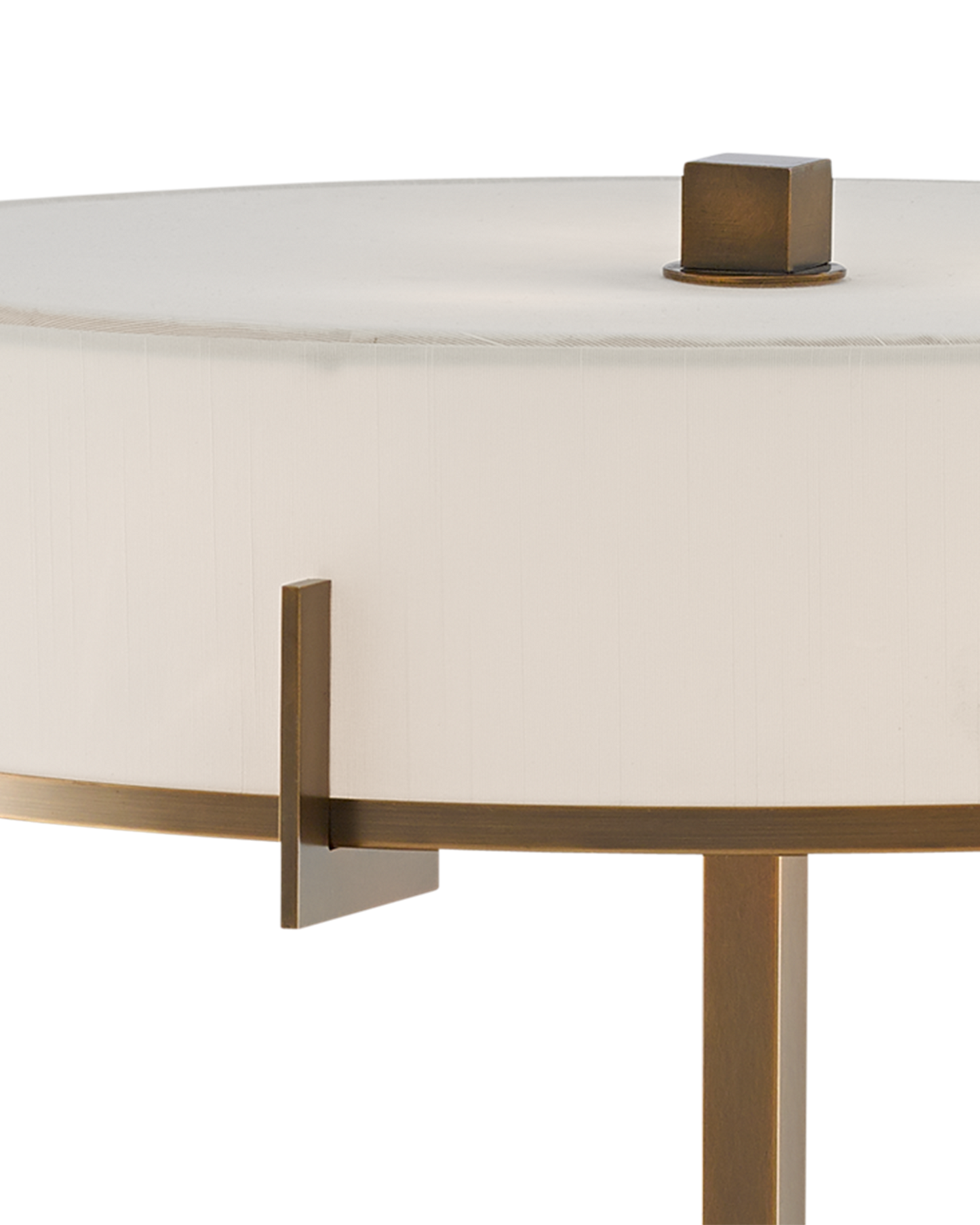 Design notes of our Jacobi Table Lamp include the thin stem rising from a black marble base that is similar in width to the finial, the sleek off-white shantung shade, and how the shade is clasped by geometric accents. This gold lamp is made of metal in a brushed brass finish.