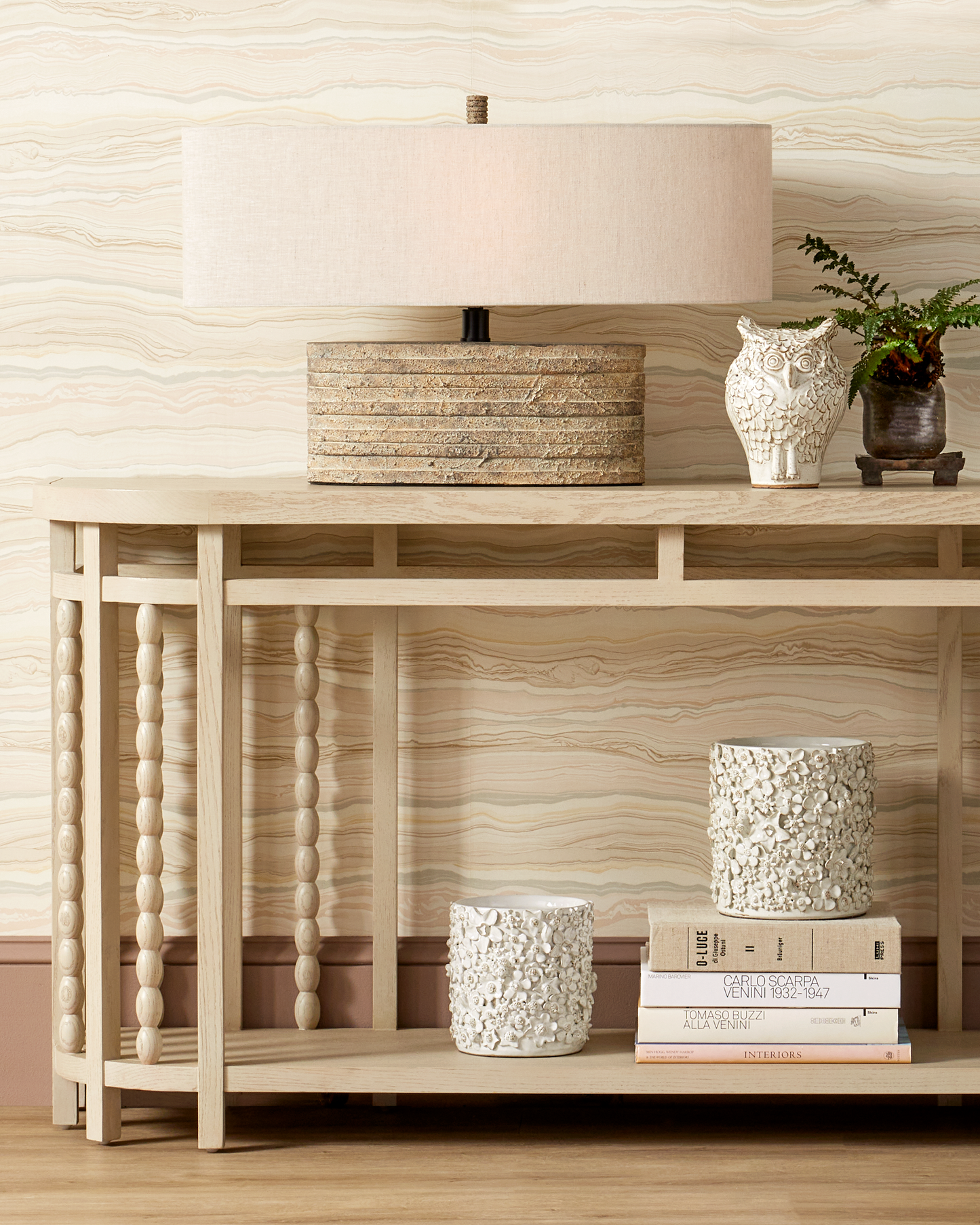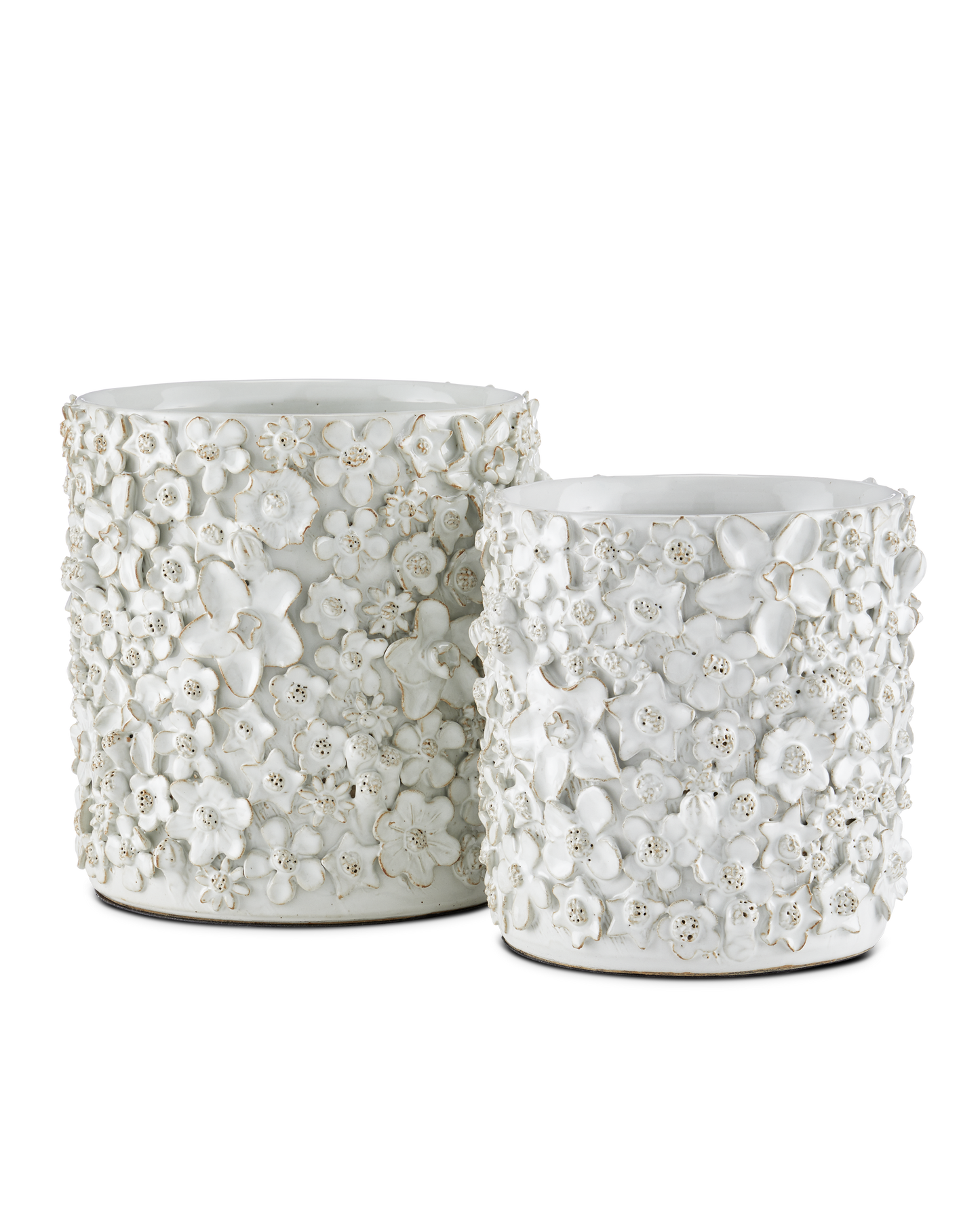 With a surface that is studded with beautifully fashioned white flowers, the Jessamine Small White Cachepot is truly an artisanal piece. Rather than apply one type of bloom, a number of floral shapes are intermingled to give the white decorative accessory a charm. The handmade character of the piece comes from the fact that each flower is created individually and applied, one-by-one, by hand. The white planter will be a plant's biggest complement.